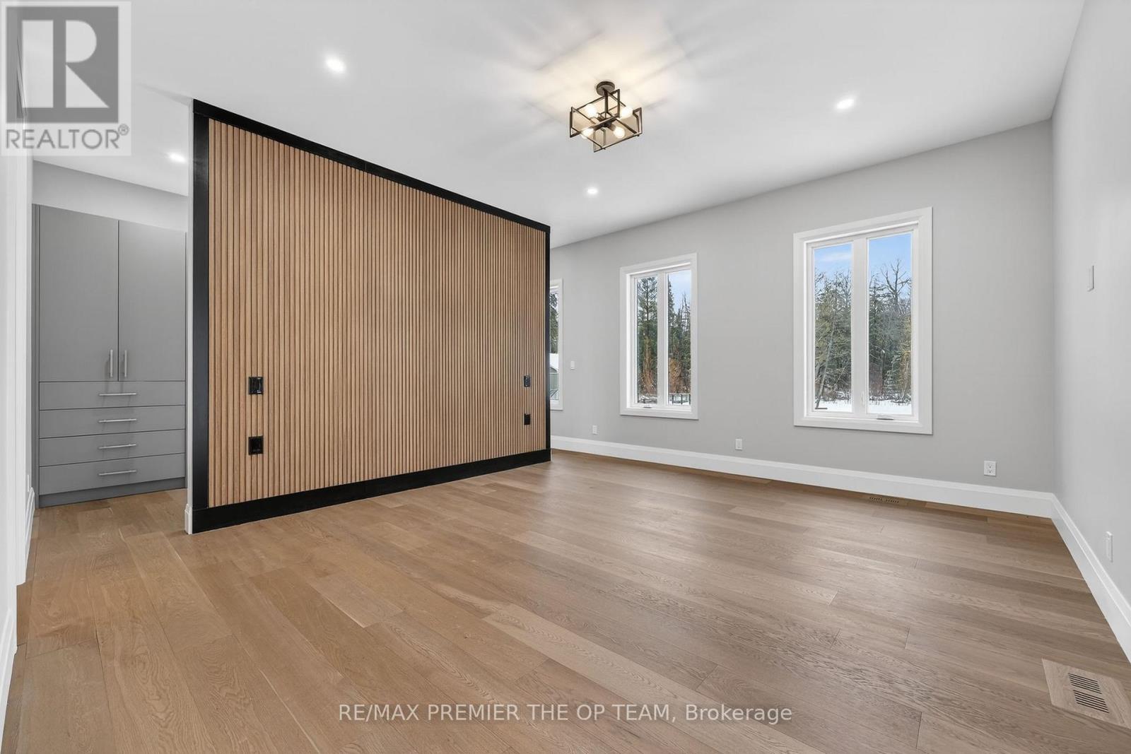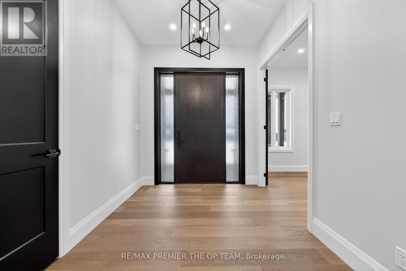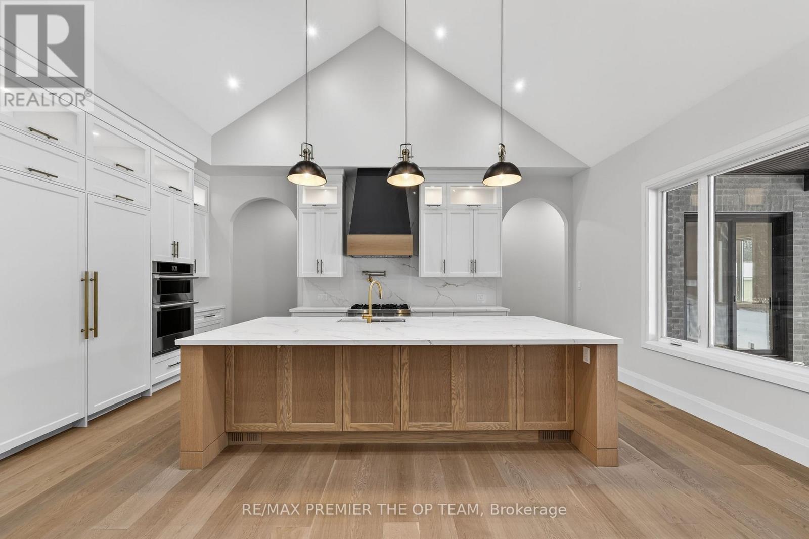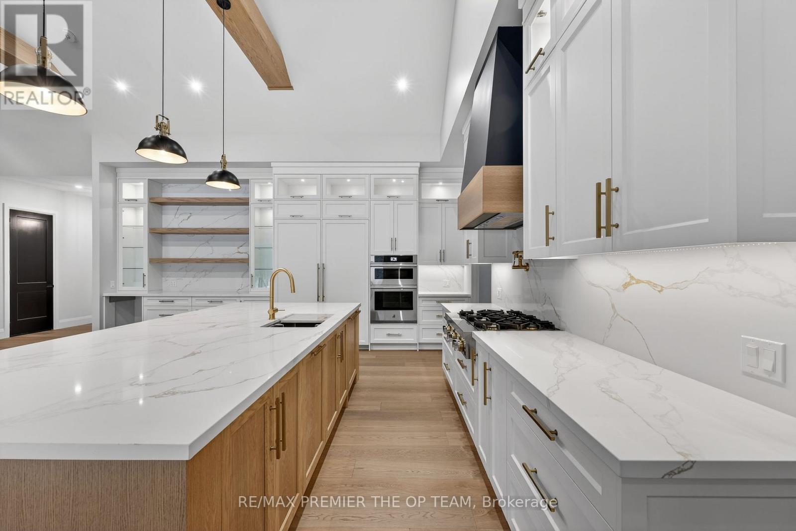 New 3,200 sq. ft. custom stone and brick bungalow on over an acre, built by a quality builder and backed by Tarion warranty. This stunning home features wide plank hardwood floors, high-end light fixtures, JennAir appliances, and Riobel bathroom fixtures throughout. The open-concept kitchen and living area is highlighted by a massive island, butler's pantry with espresso bar, and a dramatic floor-to-ceiling double-sided stone fireplace, with walkout to a covered back deck overlooking a pool-sized yard and forest backdrop. The principal suite offers a feature wall, walk-through custom closet, and spa-inspired ensuite. Separate bedroom wing with 3 bedrooms and 2 full baths. Main floor laundry and mudroom off the impressive 40' x 30' garage with oversized doors, high ceilings for car lifts, and basement walk-up. Basement features 9 ft ceilings and rough-in for additional bath. Landscaping package includes exposed stone concrete walkway, entrance garden with two trees, sodded front yard, and hydro-seeded backyard. Excellent commuter location with easy access to Barrie and Hwy 400. (id:64974)