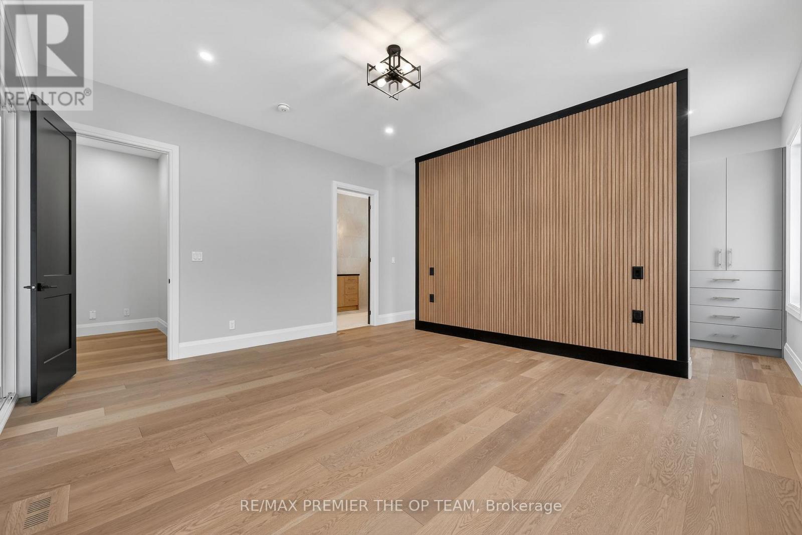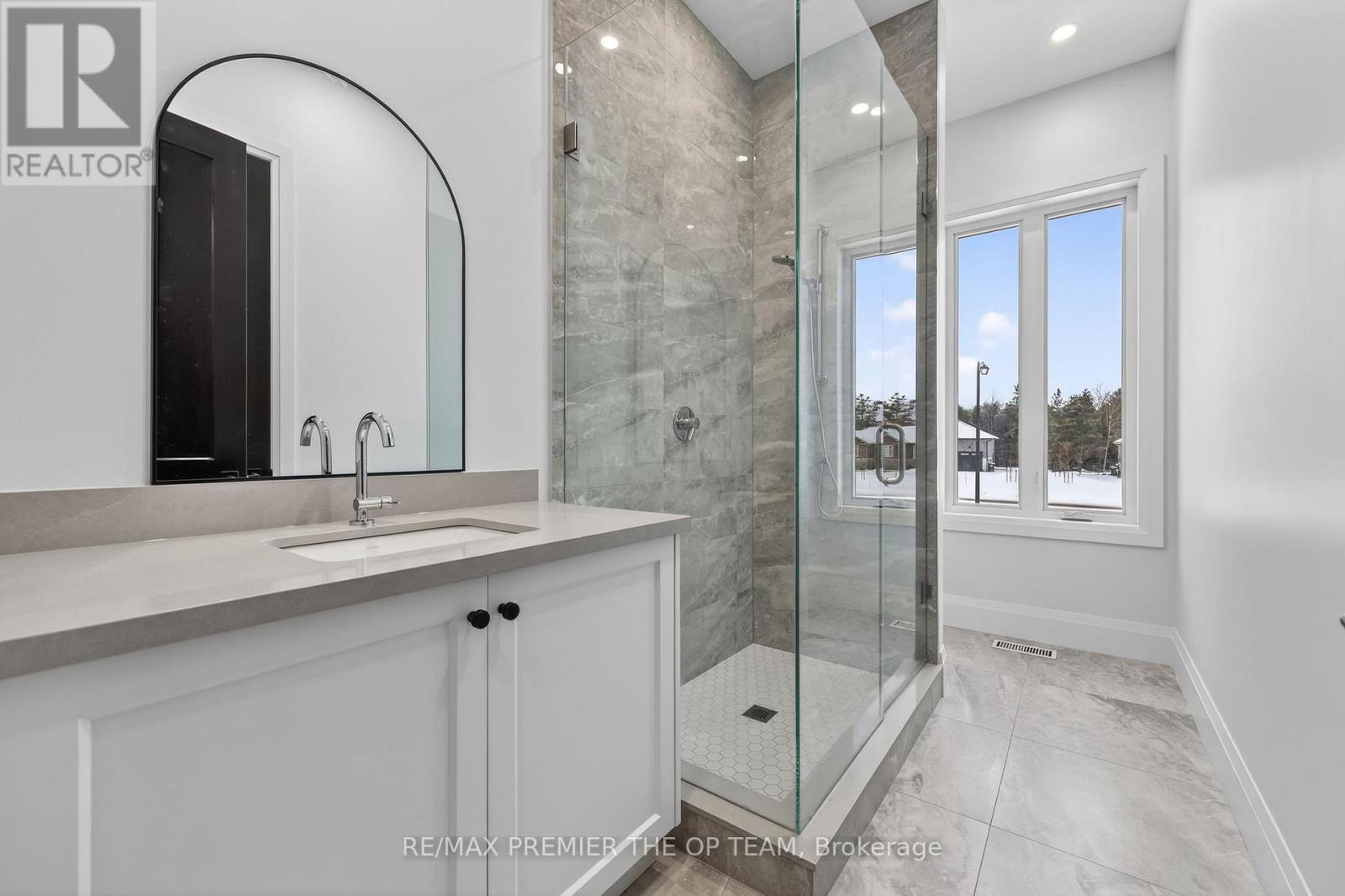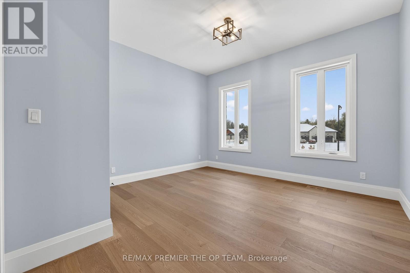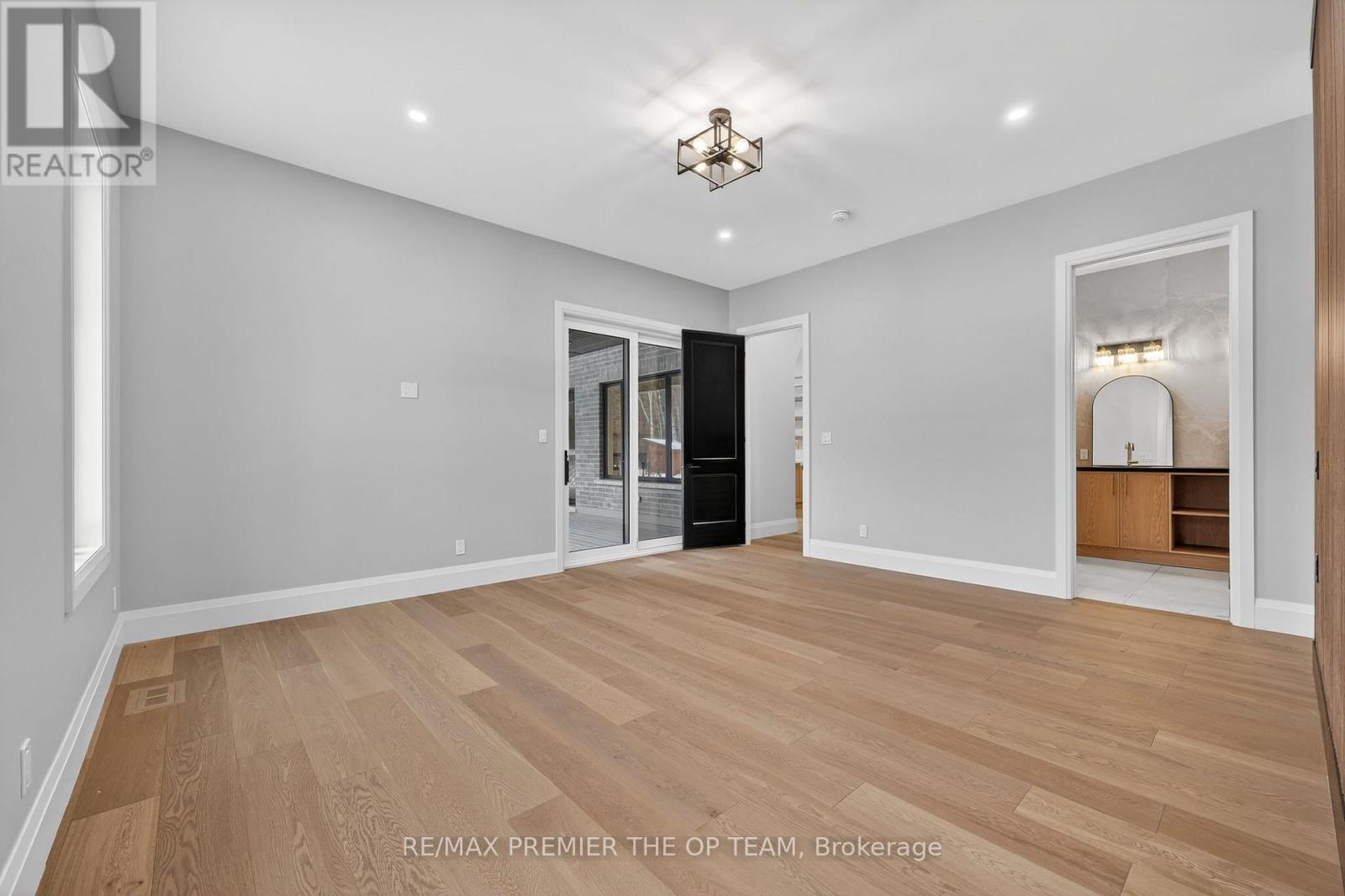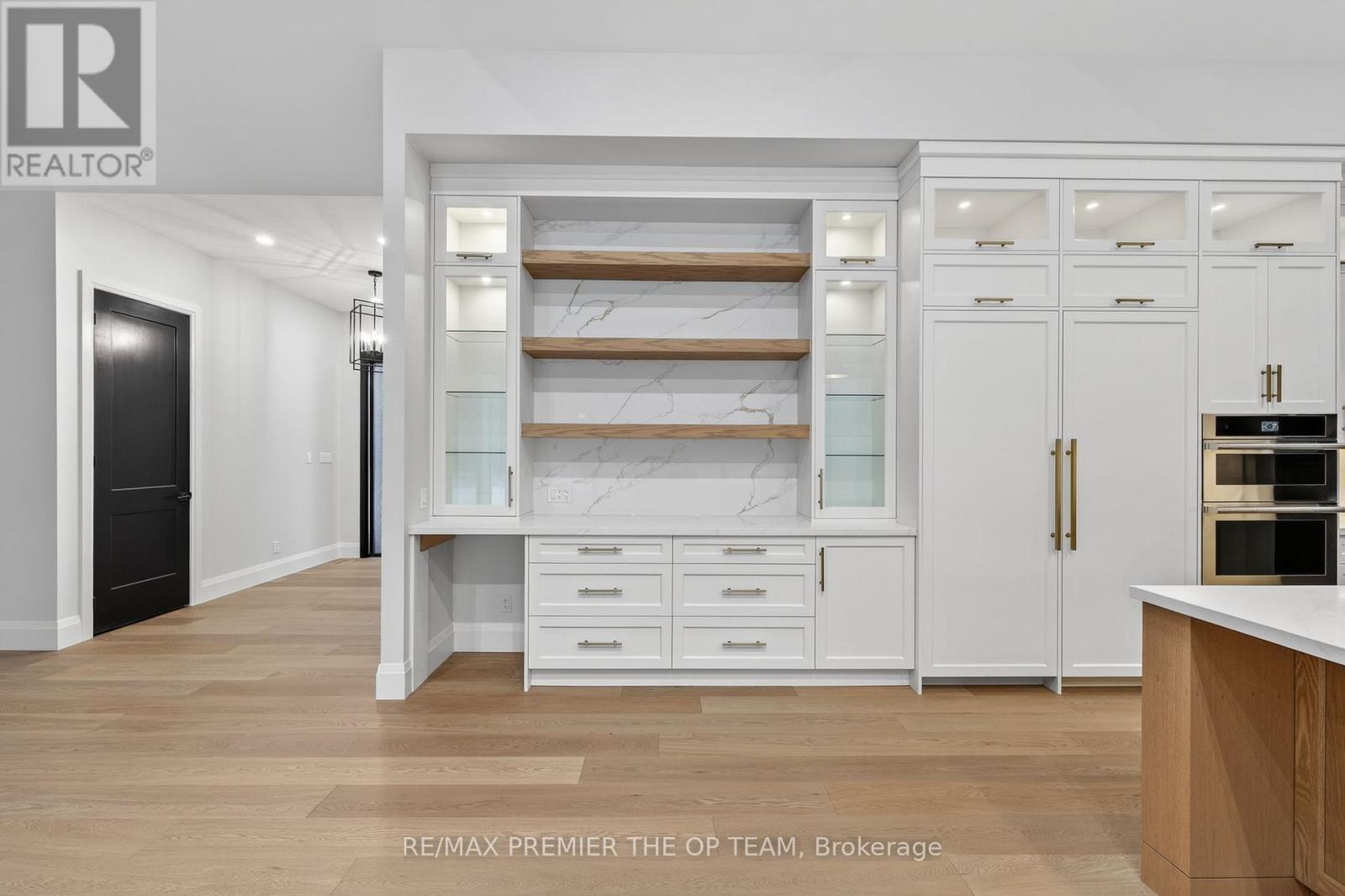 New 3,200 sq. ft. custom stone and brick bungalow on over an acre, built by a quality builder and backed by Tarion warranty. This stunning home features wide plank hardwood floors, high-end light fixtures, JennAir appliances, and Riobel bathroom fixtures throughout. The open-concept kitchen and living area is highlighted by a massive island, butler's pantry with espresso bar, and a dramatic floor-to-ceiling double-sided stone fireplace, with walkout to a covered back deck overlooking a pool-sized yard and forest backdrop. The principal suite offers a feature wall, walk-through custom closet, and spa-inspired ensuite. Separate bedroom wing with 3 bedrooms and 2 full baths. Main floor laundry and mudroom off the impressive 40' x 30' garage with oversized doors, high ceilings for car lifts, and basement walk-up. Basement features 9 ft ceilings and rough-in for additional bath. Landscaping package includes exposed stone concrete walkway, entrance garden with two trees, sodded front yard, and hydro-seeded backyard. Excellent commuter location with easy access to Barrie and Hwy 400. (id:64974)