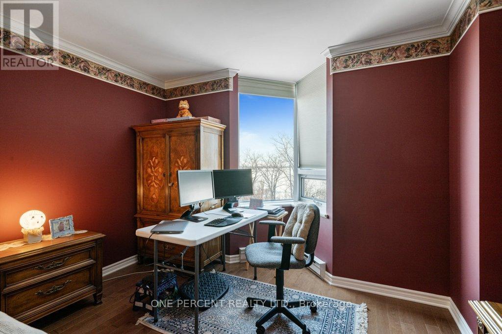 Reimagined luxury meets riverside living at Commodores Quay. This exceptional 2-bedroom condominium showcases what happens when original owners invest in creating their ideal home. Originally designed as a 3-bedroom layout, the floor plan was thoughtfully reworked to create expansive principal rooms and a chef-caliber kitchen that serious home cooks will appreciate. The original footprint offers the option to reconfigure the layout back to three bedrooms, providing valuable flexibility for changing needs. A marble-tiled foyer with classic wainscoting sets an elegant tone and opens into bright living and dining areas finished with hardwood floors and generous windows framing unobstructed views of the Ottawa River and Gatineau Hills. The open-concept space centers around a gas fireplace, with the dining area flowing seamlessly onto a private balcony, ideal for morning coffee overlooking the waterfront pathways. The redesigned kitchen features built-in appliances including two ovens, Corian countertops, extensive cabinetry, and an eat-in area with its own window for added natural light throughout the day. The primary suite comfortably accommodates a full bedroom set and is complemented by a spa-inspired ensuite with a deep soaker tub and oversized walk-in shower. The second bedroom offers custom built-ins, making it ideal as a guest room or home office. A second full bathroom and in-unit laundry complete the interior. Practical advantages include two underground parking spaces and a large storage locker. Residents enjoy excellent building amenities including a saltwater pool, sauna, fitness centre, party room, visitor parking, and the added convenience of a live-in superintendent. Ideally located steps from Andrew Haydon Park, Britannia Beach, the Nepean Sailing Club, and scenic bike paths, with Bayshore Shopping Centre and transit just minutes away. Explore the virtual tour or book a private showing to fully appreciate everything this exceptional unit has to offer. (id:64974)