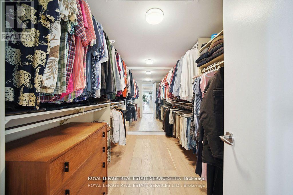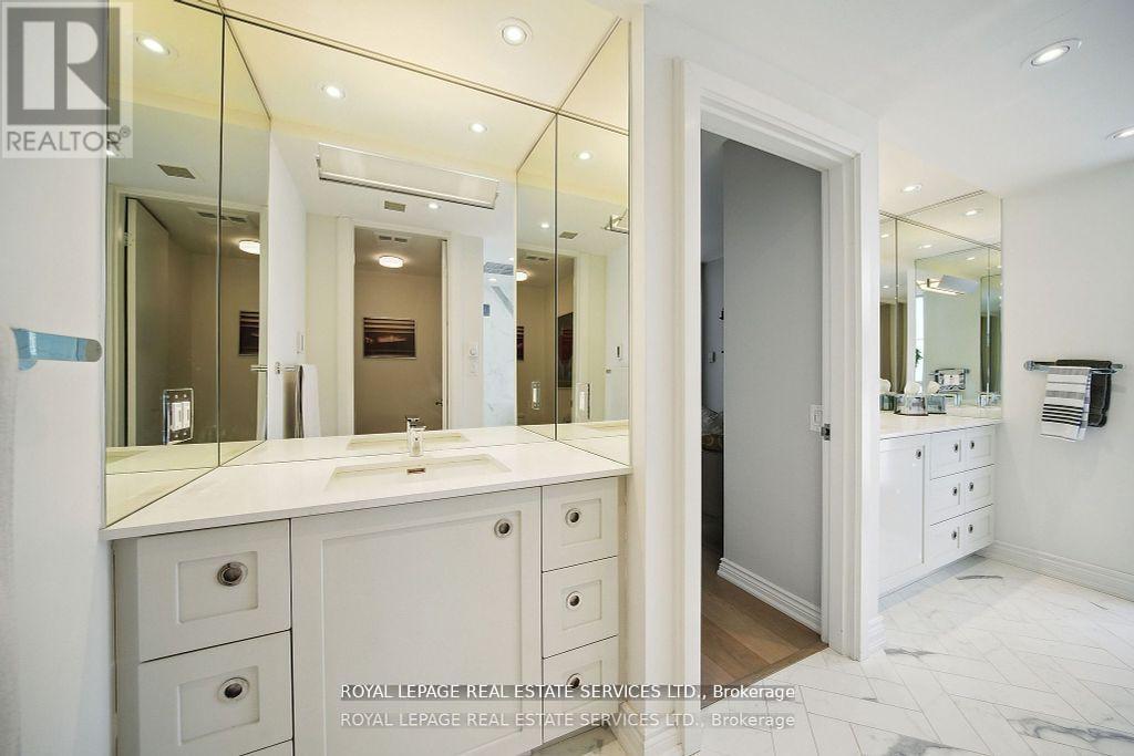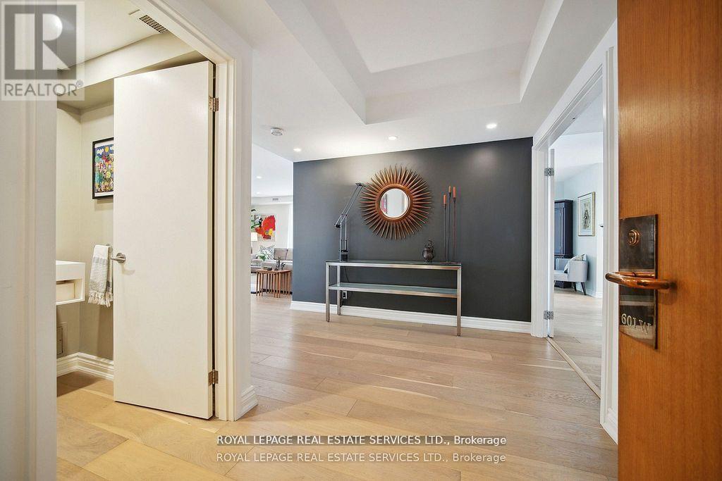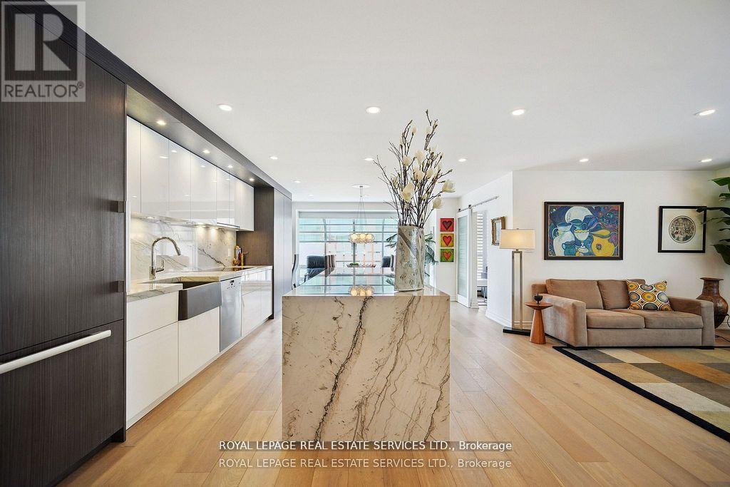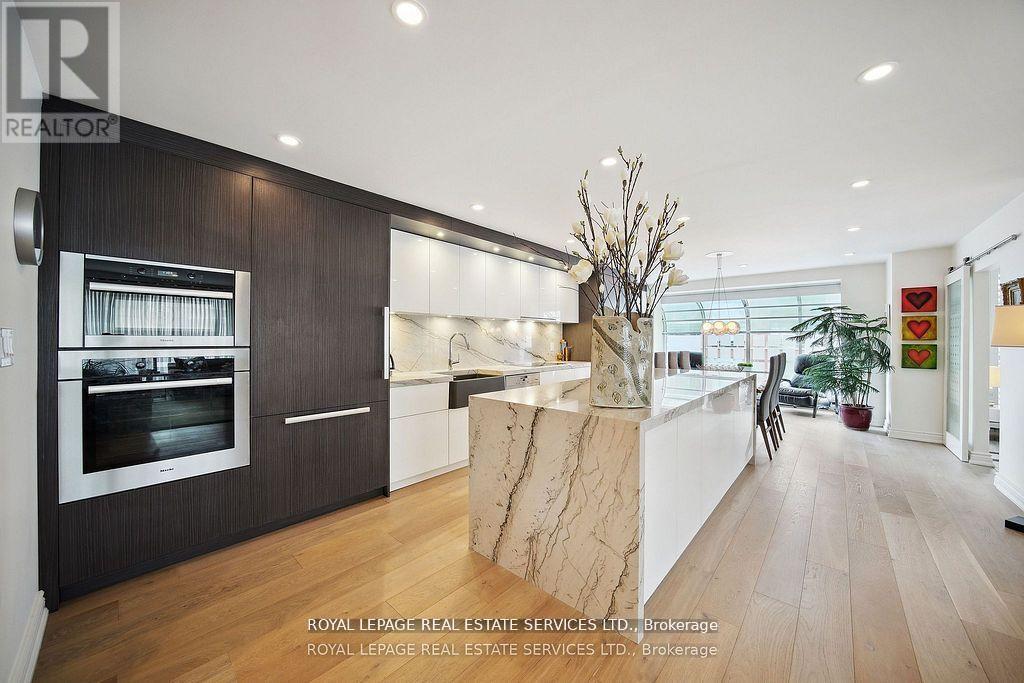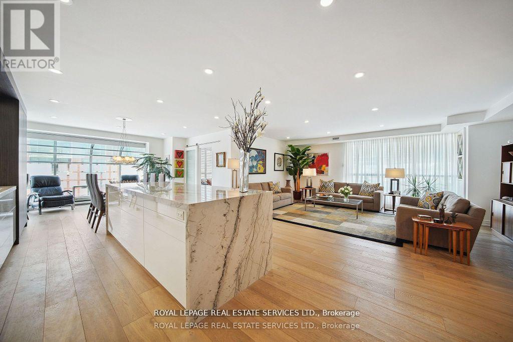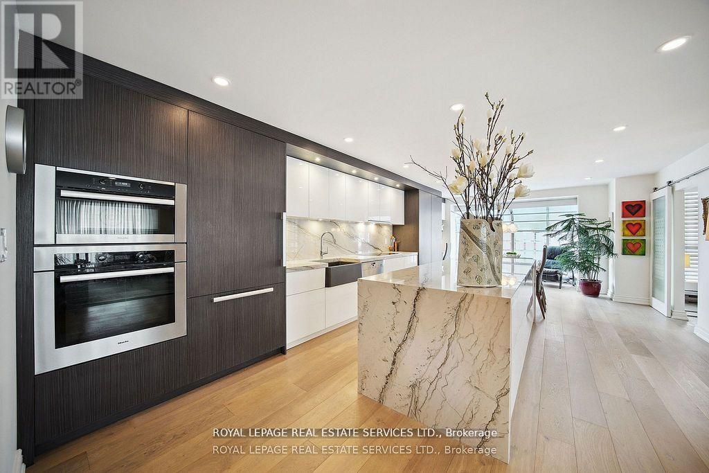 Welcome to Suite 601W at the iconic King's Landing-a masterpiece by celebrated Canadian architect Arthur Erickson, best known for Roy Thomson Hall. Nestled along Toronto's vibrant waterfront, this rare, quiet corner unit has been meticulously renovated, offering a unique blend of architectural prestige and modern luxury. Step through a spacious, elegant foyer into a thoughtfully redesigned home perfect for elevated everyday living and entertaining. The heart of the suite features a gourmet chef's kitchen with a striking 10-ft waterfall island, premium Miele appliances, and custom wine storage-flowing seamlessly into a large open-concept living and dining area. An expansive living room offers the perfect setting to host guests, while the bright solarium provides a private retreat to read, relax, or enjoy a glass of wine. The luxurious primary suite boasts a vast walk-in closet and spa-like ensuite with jetted soaker tub, dual vanities, and private water closet. A full-sized laundry room with built-in storage adds comfort and convenience. Ideally located on the same level as the building's exceptional amenities: indoor salt water pool & whirlpool, sauna, rooftop terrace with BBQs, outdoor pickleball court, state-of-the-art gym, party room, and golf swing practice range. Includes 1 parking space and 1 locker. With 24-hour white-glove concierge service, premier finishes, and a landmark location, Suite 601W is a rare opportunity to live in one of Toronto's most architecturally significant residences. (id:64974)