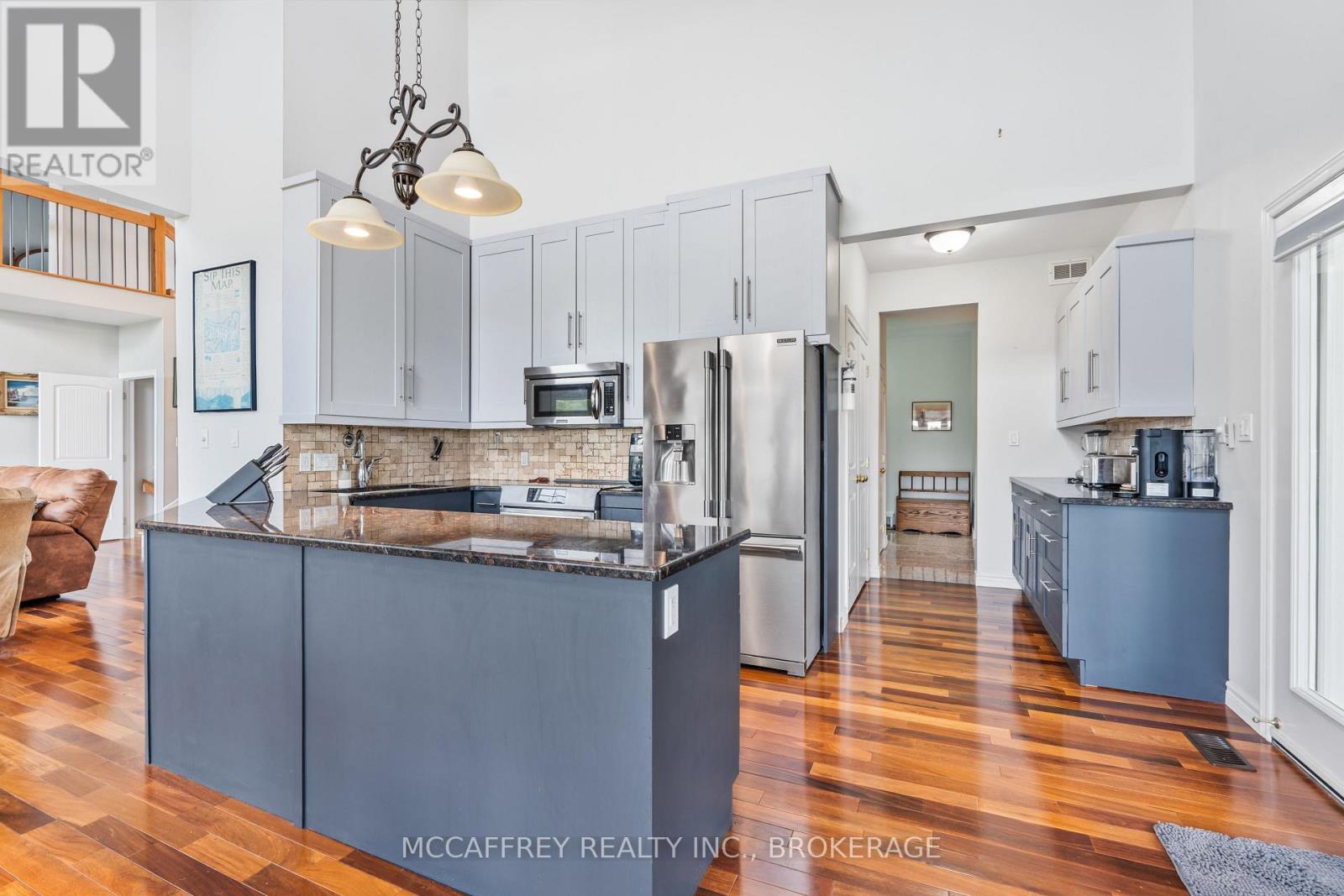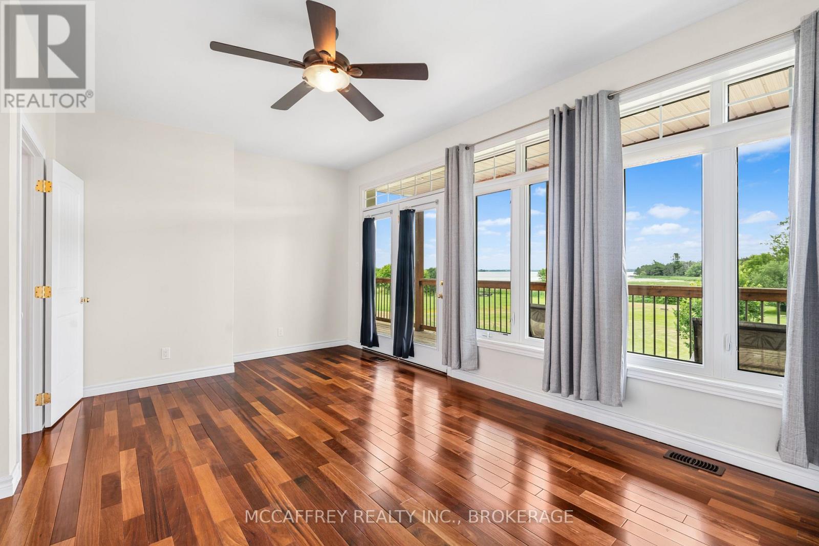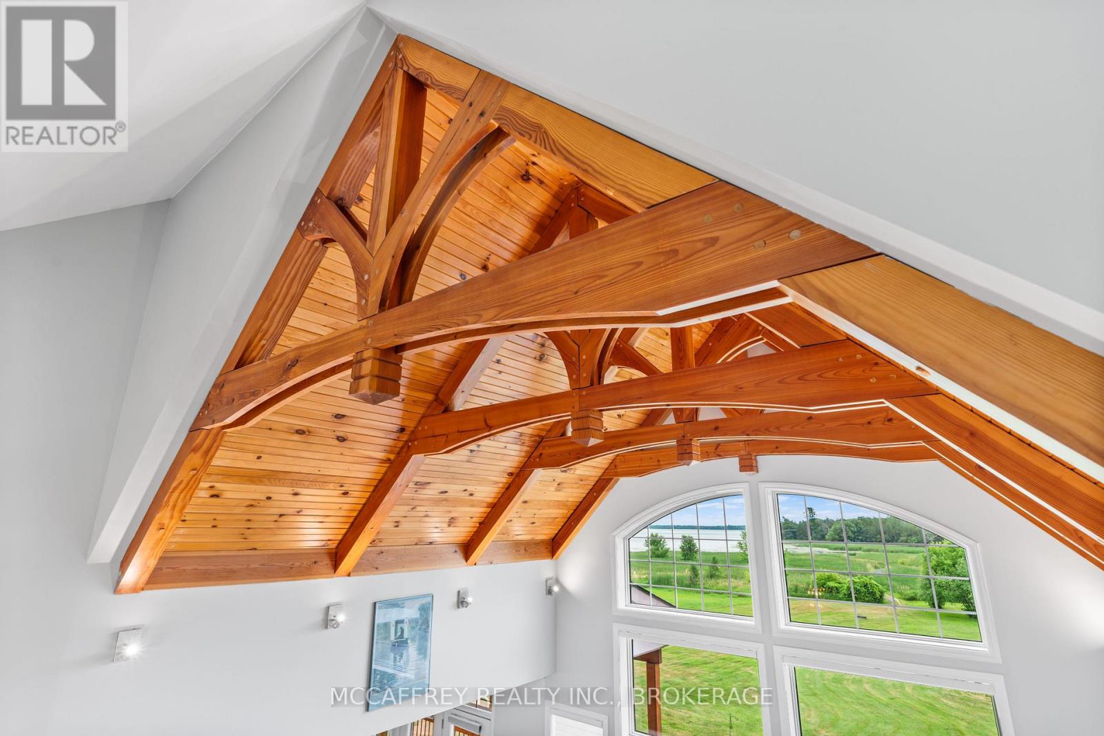 Welcome to your dream home on the shores of Hay Bay! This custom-built two-story masterpiece, constructed in 2012, blends luxury, comfort, and scenic beauty. Set on a 1.72-acre lot with 202 ft of waterfront, it offers unparalleled living. As you arrive, a double wide paved driveway leads to an attached 2-car garage and a distinctive detached 40' x 58' garage, complete with hydro and oversized doors (12'x14' & 12'x12'), ideal for boats, RVs, or a workshop. Inside, the main level impresses with 28 ft high cathedral ceilings adorned with BC Fir wood beams. Expansive windows illuminate interiors and offer picturesque views of the landscaped backyard and sparkling waters. This level includes a cozy living room with a gas fireplace, an office/den, and a gourmet kitchen with granite countertops, oak cabinetry, and a breakfast bar. The dining room and easy deck access enhance indoor-outdoor living, as well as entrances from the laundry room, and connections to the garage. Two spacious bedrooms, one with deck access, plus a 3 pc and a 4 pc bath, complete this level. Ascend the beautiful wooden staircase to discover the private sanctuary of the Primary suite. Here, you'll find a spacious bedroom complemented by two walk-in closets and a 4 pc ensuite, providing the ultimate retreat. The finished lower level enhances the home's entertainment and storage capabilities. The rec room features a wet bar, 2 pc bath, cold cellar, substantial storage room, and a utility room. Additionally, a semi-finished bedroom with walk-out offers flexibility for your needs. The outdoor space is nothing short of spectacular, with meticulously designed flower gardens and a 10'x24' floating dock invites you to embrace the waterfront lifestyle. Located just minutes from downtown Napanee, this home provides the perfect combination of convenient access to amenities and the privacy and tranquility of waterfront living. (id:64974)