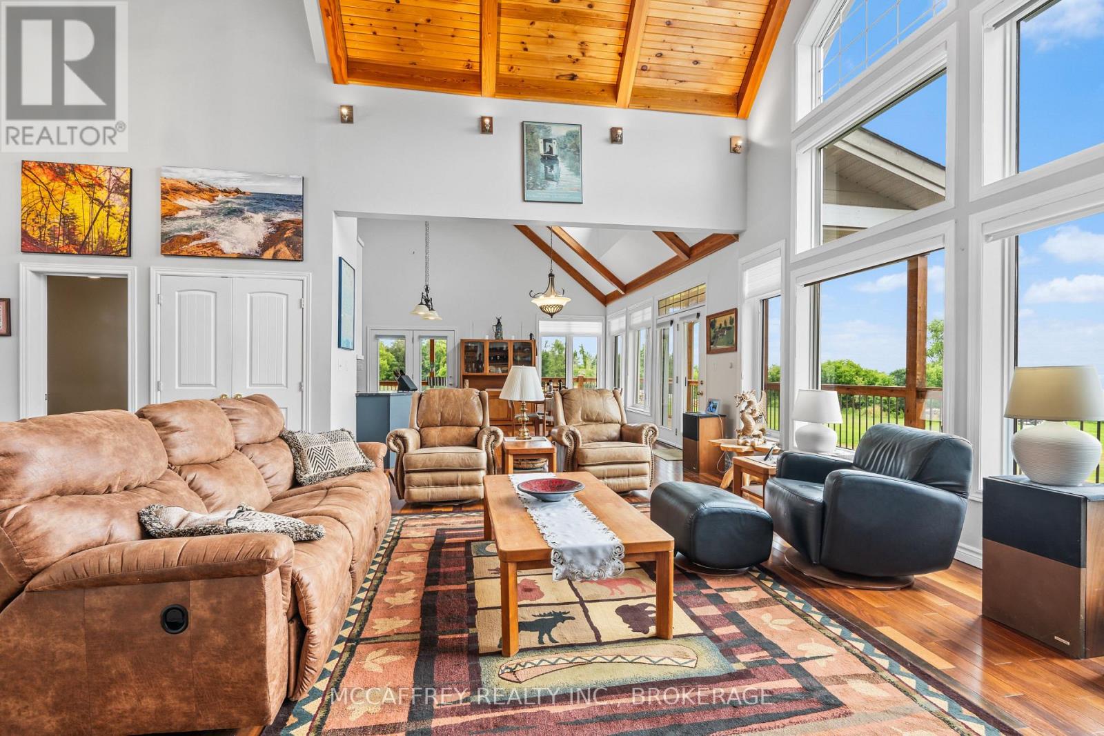 Welcome to your dream home on the shores of Hay Bay! This custom-built two-story masterpiece, constructed in 2012, blends luxury, comfort, and scenic beauty. Set on a 1.72-acre lot with 202 ft of waterfront, it offers unparalleled living. As you arrive, a double wide paved driveway leads to an attached 2-car garage and a distinctive detached 40' x 58' garage, complete with hydro and oversized doors (12'x14' & 12'x12'), ideal for boats, RVs, or a workshop. Inside, the main level impresses with 28 ft high cathedral ceilings adorned with BC Fir wood beams. Expansive windows illuminate interiors and offer picturesque views of the landscaped backyard and sparkling waters. This level includes a cozy living room with a gas fireplace, an office/den, and a gourmet kitchen with granite countertops, oak cabinetry, and a breakfast bar. The dining room and easy deck access enhance indoor-outdoor living, as well as entrances from the laundry room, and connections to the garage. Two spacious bedrooms, one with deck access, plus a 3 pc and a 4 pc bath, complete this level. Ascend the beautiful wooden staircase to discover the private sanctuary of the Primary suite. Here, you'll find a spacious bedroom complemented by two walk-in closets and a 4 pc ensuite, providing the ultimate retreat. The finished lower level enhances the home's entertainment and storage capabilities. The rec room features a wet bar, 2 pc bath, cold cellar, substantial storage room, and a utility room. Additionally, a semi-finished bedroom with walk-out offers flexibility for your needs. The outdoor space is nothing short of spectacular, with meticulously designed flower gardens and a 10'x24' floating dock invites you to embrace the waterfront lifestyle. Located just minutes from downtown Napanee, this home provides the perfect combination of convenient access to amenities and the privacy and tranquility of waterfront living. (id:64974)
