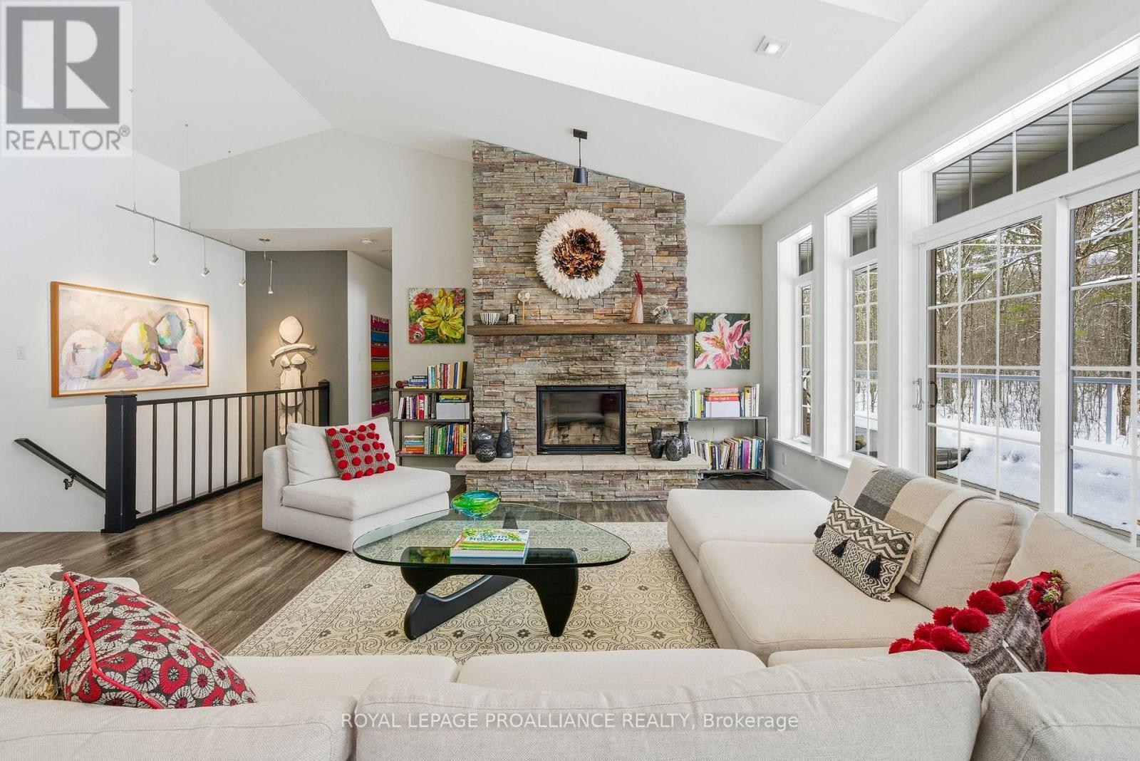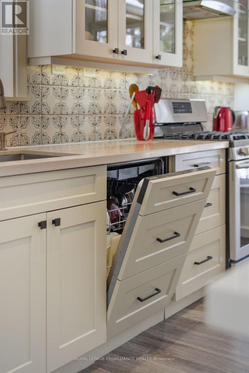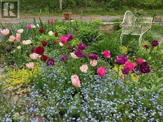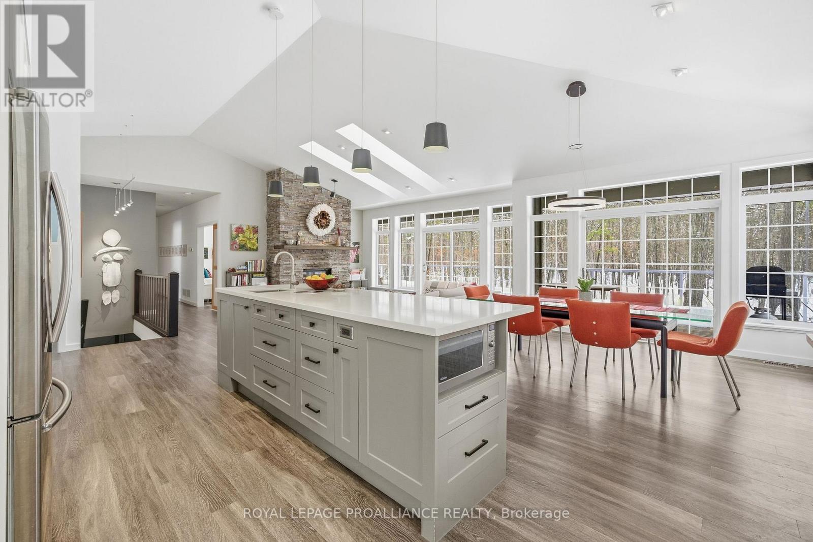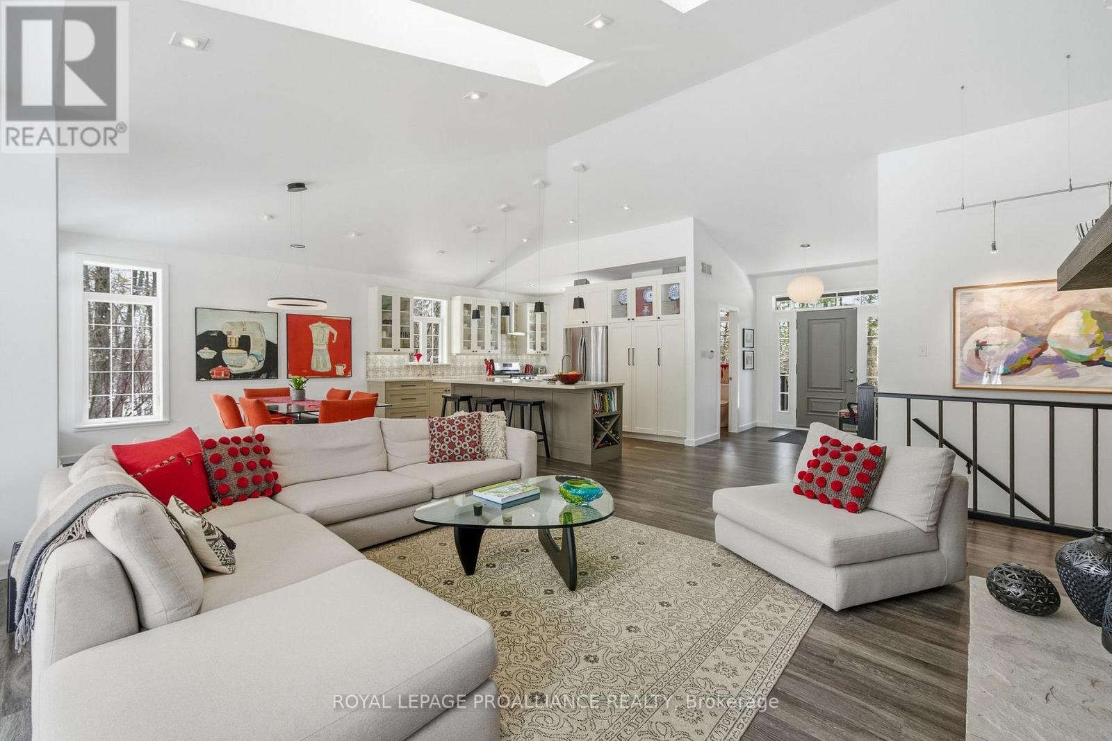 Follow the circular driveway through the trees to discover this inviting custom-built home, tucked away in a peaceful forest setting. Just minutes north of Picton, this raised ranch bungalow offers three bedrooms and an open-concept great room combining a spacious gourmet kitchen with dining and living areas. A striking stone wood-burning fireplace climbs to the vaulted ceiling, while expansive windows and skylights fill the entire space with abundant natural light and showcase the surrounding landscape. A screened-in 50' deck extending the full length of the back, provides front-row seats to the woods and its inhabitants, great for al fresco dining. The primary bedroom features a walk-in closet, a four-piece ensuite and direct access to the deck and hot tub install for a relaxing retreat. The commodious semi-finished basement boasts 8' ceilings, a wood-burning stove and a separate side entrance that together with the upstairs offers over 3,000 square feet. An oversized heated double garage is split between an artist's studio with skylights and patio doors overlooking a deck and mature perennial gardens while the remaining garage currently serves as a workshop/garage with 240 volt service. Lastly, a large, matching shed provides ample space for gardening tools and power equipment. This home is a turnkey invitation for cozy country living and entertaining. **** New 97% HE Propane furnace -2026, front and back decks restored & new Bosch Dishwasher- 2025, ensuite fully renovated -2024, new kitchen appliances, washer and dryer, powder room - 2017**** Garage Dimensions 27' x 18'8" | 504 sq ft Studio Dimensions 27'4" x 16'3" | 444 sq ft (id:64974)