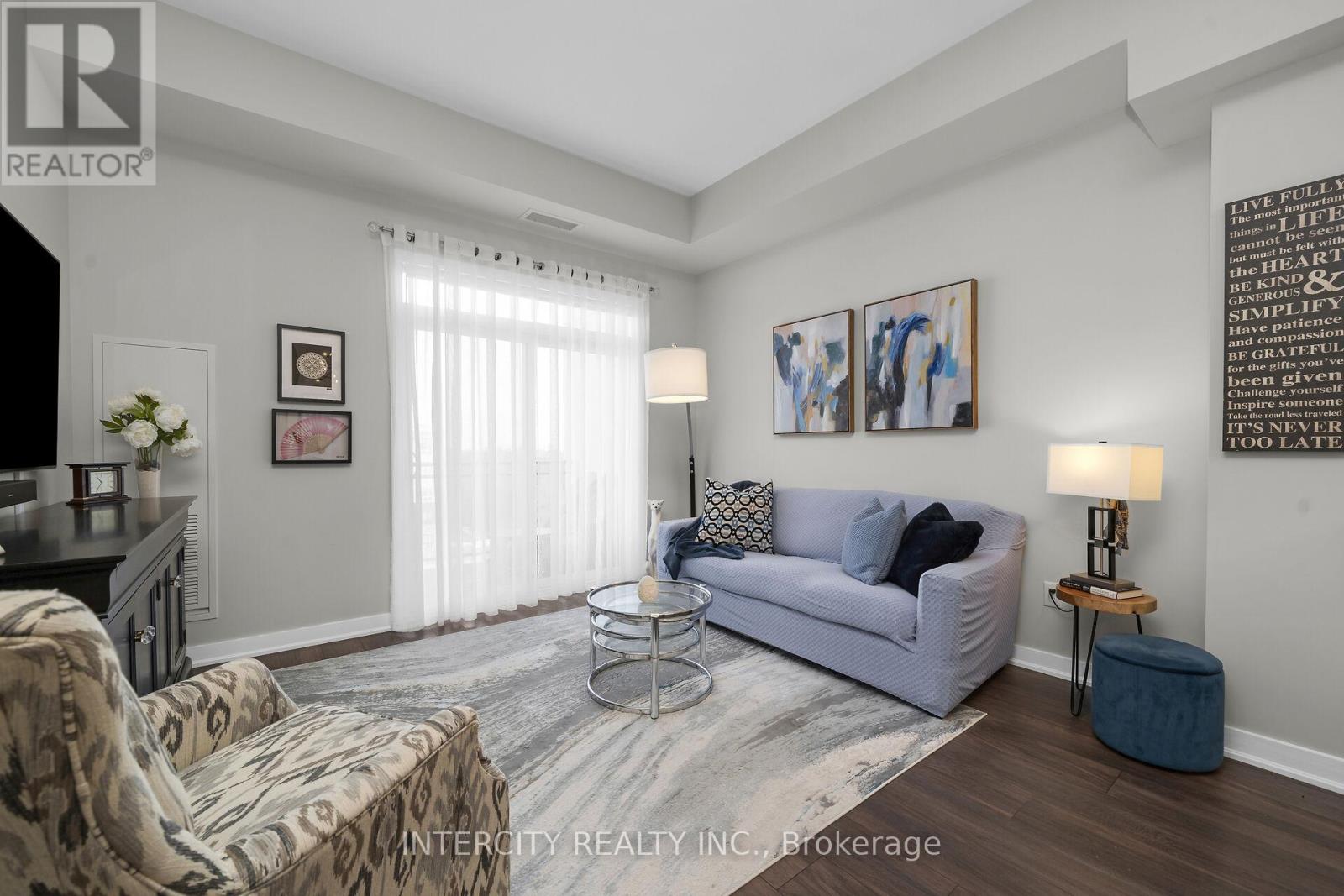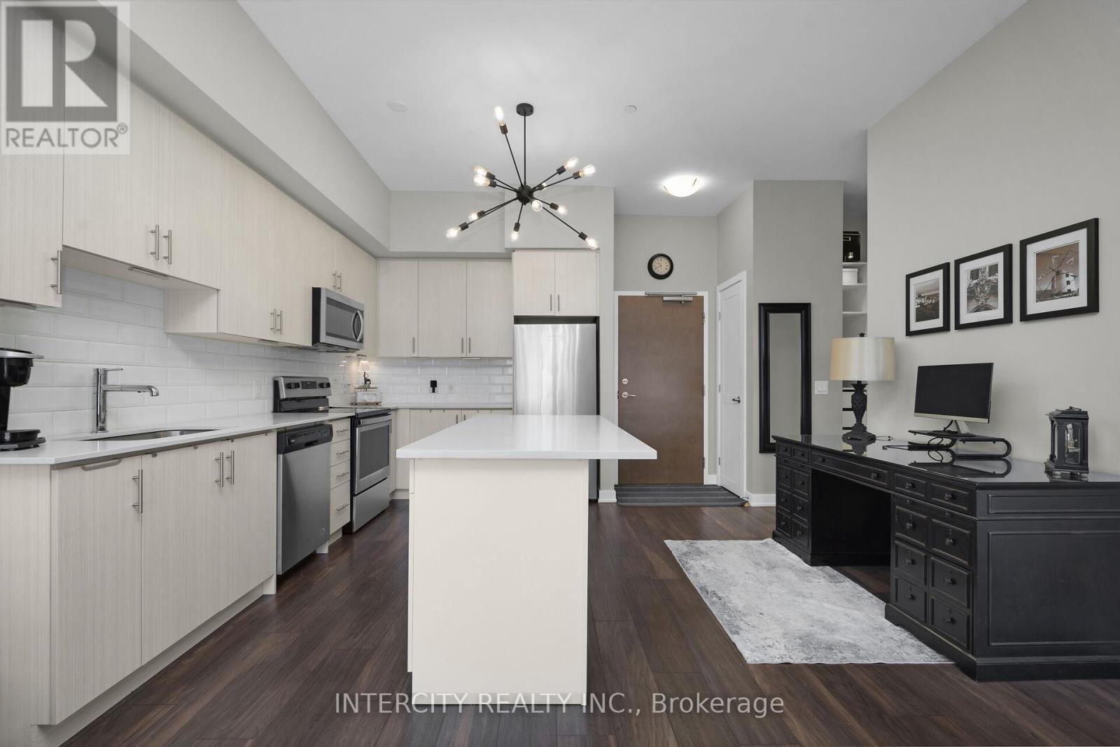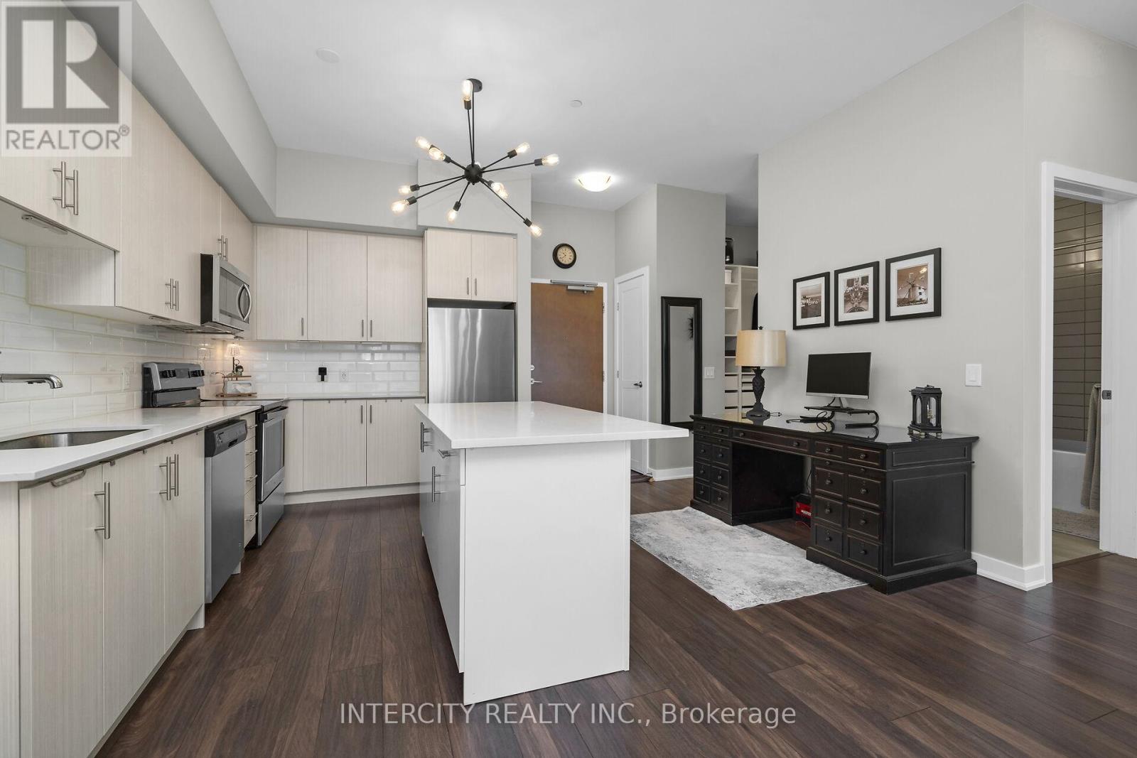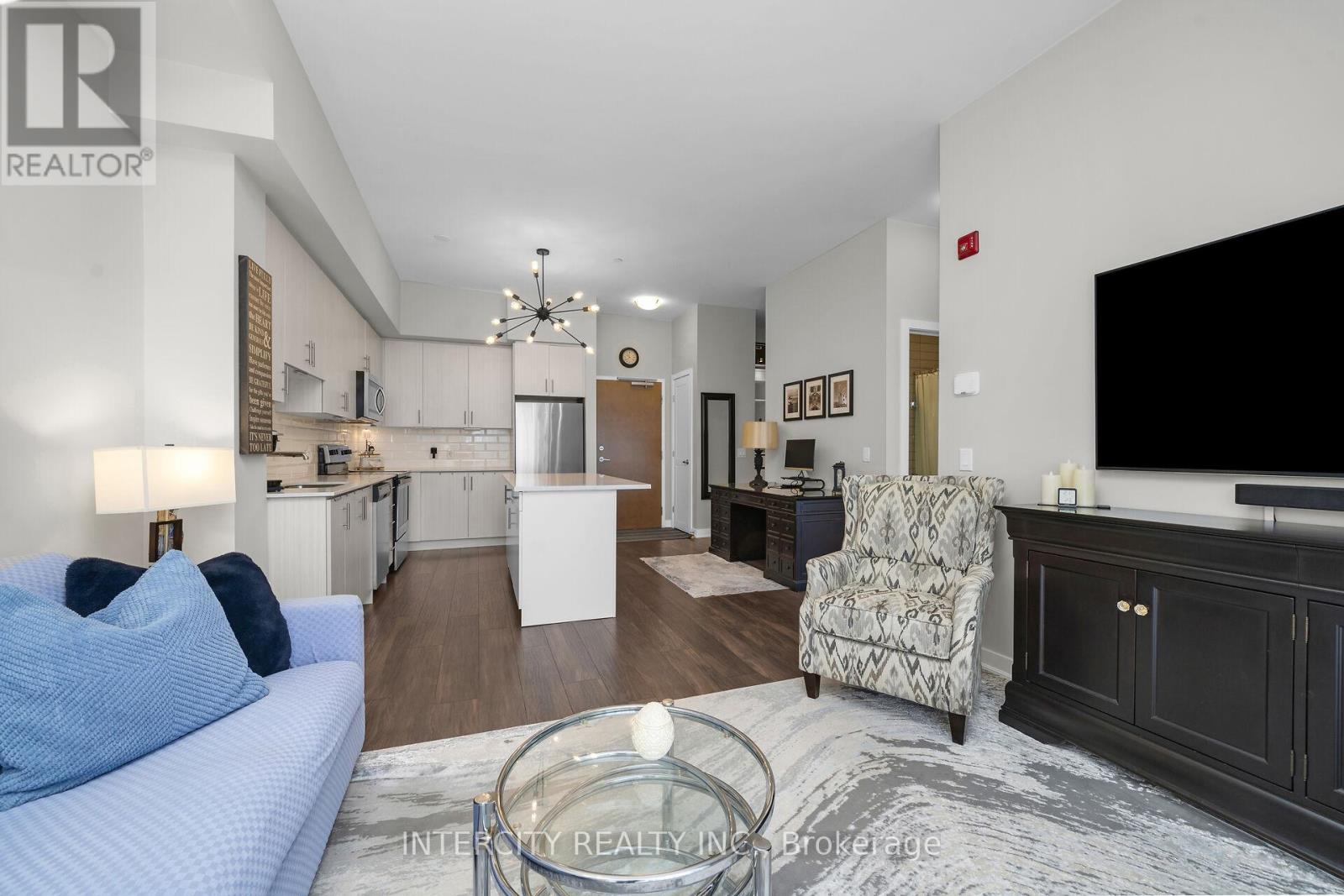 Penthouse Living in South Burlington - Executive Condo Comfort Experience refined, low-maintenance living in a prime South Burlington location. This penthouse-level 1-bedroom + den suite offers a thoughtful blend of elegance, functionality, and lifestyle appeal-ideal for the discerning buyer. Soaring 10-foot ceilings and an open-concept layout create a bright, airy feel throughout this beautifully maintained residence. The expansive kitchen features a large island with seating for three or more, seamlessly opening to the spacious great room-well-suited for entertaining or everyday living. Step out to the private balcony and enjoy east and south views overlooking a landscaped parkette. The versatile den includes removable wall-to-wall cabinetry, offering flexible use as a home office, guest space, or additional storage. Meticulously cared for by the original owner and never rented, this unit reflects pride of ownership. Residents enjoy full-service amenities including a party room, billiards lounge, exercise and yoga rooms, bicycle storage, and EV charging station. Developed by Rosehaven Homes, the sought-after "Affinity" community is well connected to nature, transit, shopping, and cafés. Relax on the rooftop terrace with outdoor fireplace and BBQs while enjoying breezes from Lake Ontario. Commuters will appreciate convenient access to major highways and Aldershot GO, while lifestyle amenities are just minutes from Mapleview Mall, Burlington Golf and Country Club, and a short walk to Burlington Beach. Enjoy convenient weekend escapes only 40 minutes from the renowned Niagara wine region. An exceptional opportunity to own a penthouse suite offering executive comfort, everyday convenience, and effortless condo living in the heart of Burlington. (id:64974)