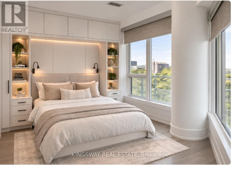 Location! Set in the heart of Old Mill, one of Toronto's most desirable neighbourhoods, this stunning 6th-floor residence offers sophisticated urban living surrounded by nature and convenience. 2-Bedroom, 2-Bathroom Condo with Expansive Wrap-Around Balcony. Step onto your 361 sq. ft. wrap-around balcony, featuring professionally installed floor tiles and facing both NE & NW to capture sunlight throughout the day - perfect for morning coffee or evening relaxation. Humber River Park is just steps away, offering year-round hiking, snowshoeing, recreational trails, and salmon spotting in the fall. This 831 sq. ft. suite showcases a thoughtful layout with high-quality finishes throughout. The spacious L-shaped kitchen offers abundant cabinetry, complemented by a custom floor-to-ceiling shelved pantry for exceptional storage. A large custom island includes two double electrical outlets and an overhang for seating - ideal for entertaining or casual dining. The open-concept living and dining areas flow seamlessly onto the balcony through glass walkouts, also accessible from the second bedroom. The primary bedroom features breathtaking views through floor-to-ceiling windows and a generous walk-in double closet. The welcoming foyer includes a double closet and an enclosed laundry area with upgraded front-loading washer and dryer. Custom roller blinds throughout the suite add both elegance and privacy. Amenities Incl Dog Wash, & Designated Dog Park Area. (id:64974)