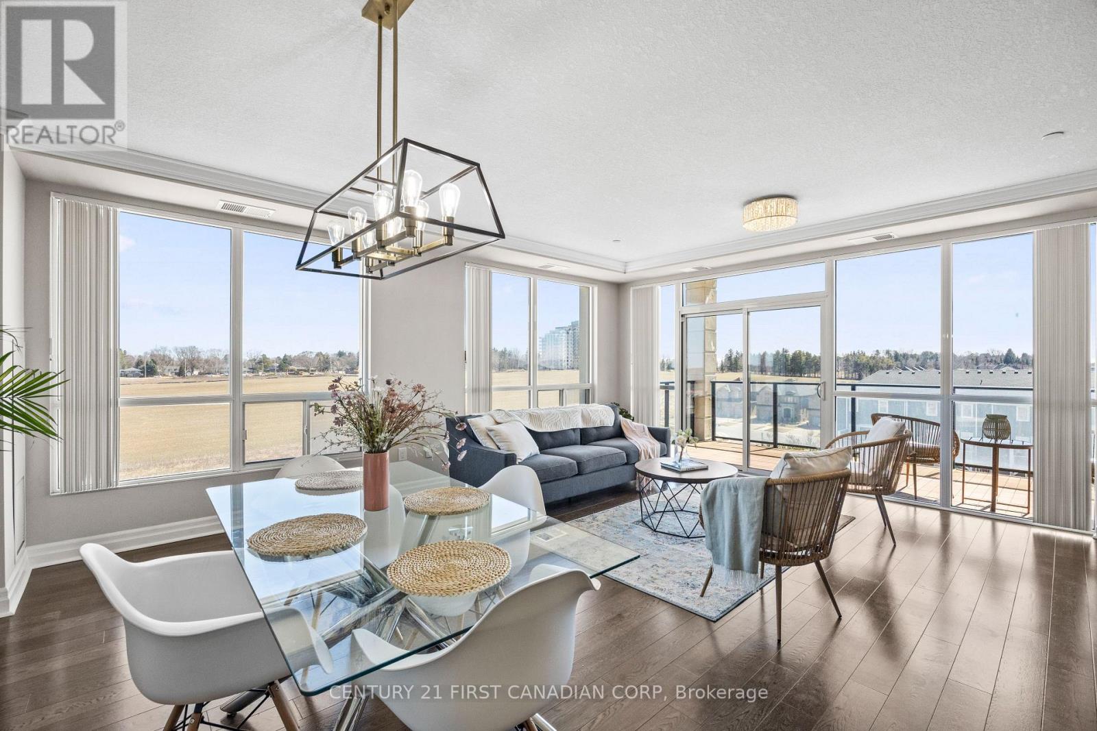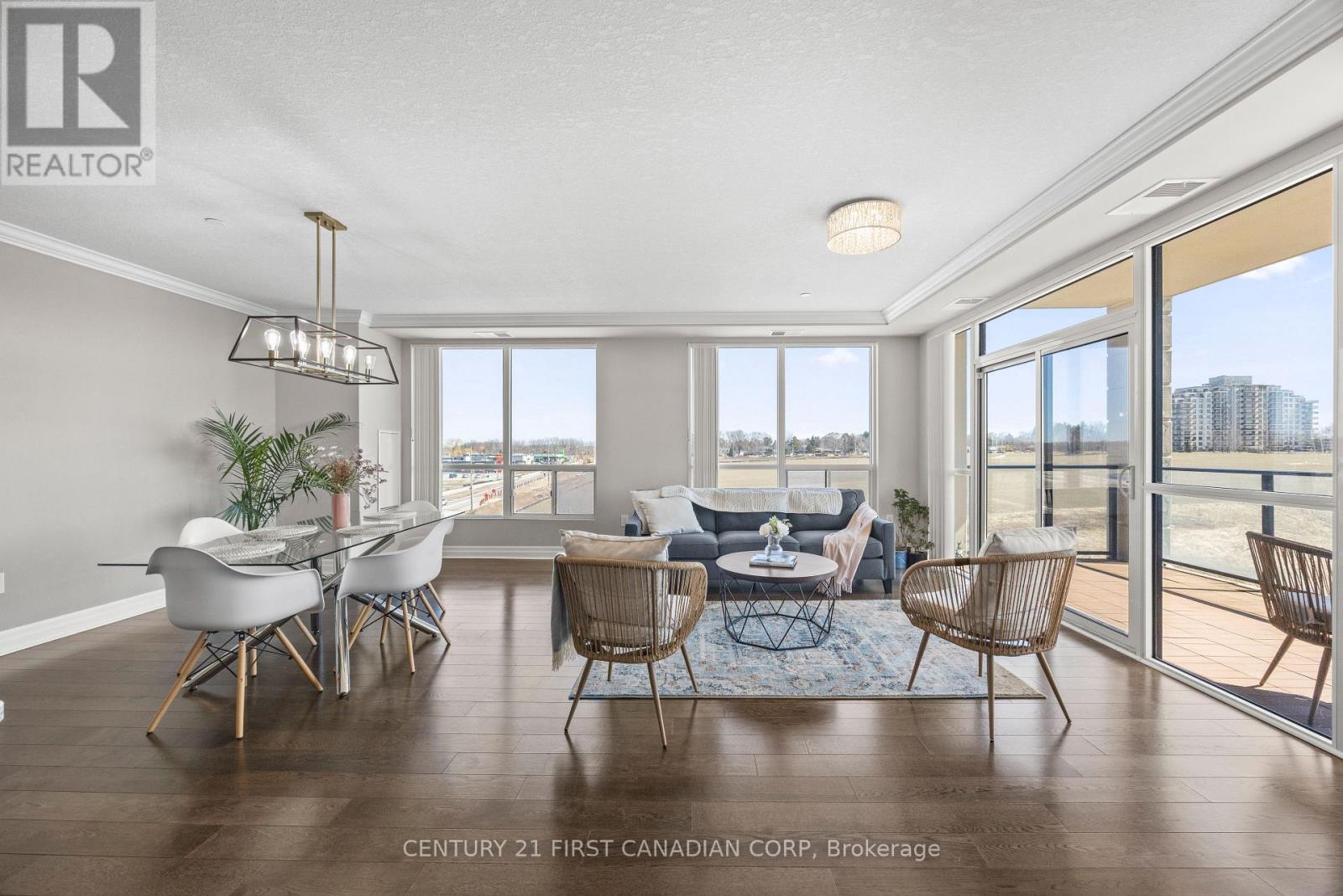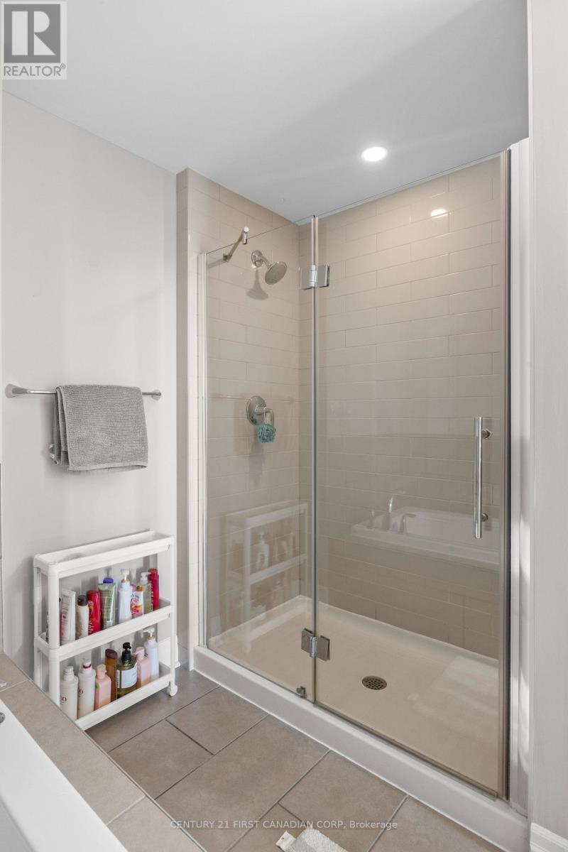 Welcome to this luxurious and spacious corner suite offering stunning, sun-filled views in one of North London's most desirable communities. This bright and expansive condo features rich hardwood flooring throughout and an open-concept design, beautifully framed by floor-to-ceiling windows. The gourmet kitchen is perfect for both everyday living and entertaining, complete with a generous breakfast bar with seating for four and large pantries for exceptional storage. The open living and dining area is anchored by a classic fireplace and extends to an open balcony with some of the best views in the city-an ideal setting for morning coffee or evening relaxation. This thoughtfully designed suite offers two spacious bedrooms, including a luxurious primary retreat featuring a walk-in closet and a 4-piece ensuite with a tiled shower and soaker tub. A versatile den provides the perfect space for a home office or optional third bedroom. Residents enjoy access to an impressive array of premium amenities, including a signature indoor pool, fully equipped fitness center, golf simulator, resident lounge, movie theatre, billiards room, and guest suite for visiting family and friends. Ideally located just minutes from Masonville Mall, Western University, University Hospital, and SilverCity Cinemas, this home offers the perfect balance of comfort, style, and convenience. Complete with two owned underground parking spaces located right by the elevator, a private locker, and condo fees that include heat and water, this exceptional residence is a rare opportunity for refined, low-maintenance living. (id:64974)