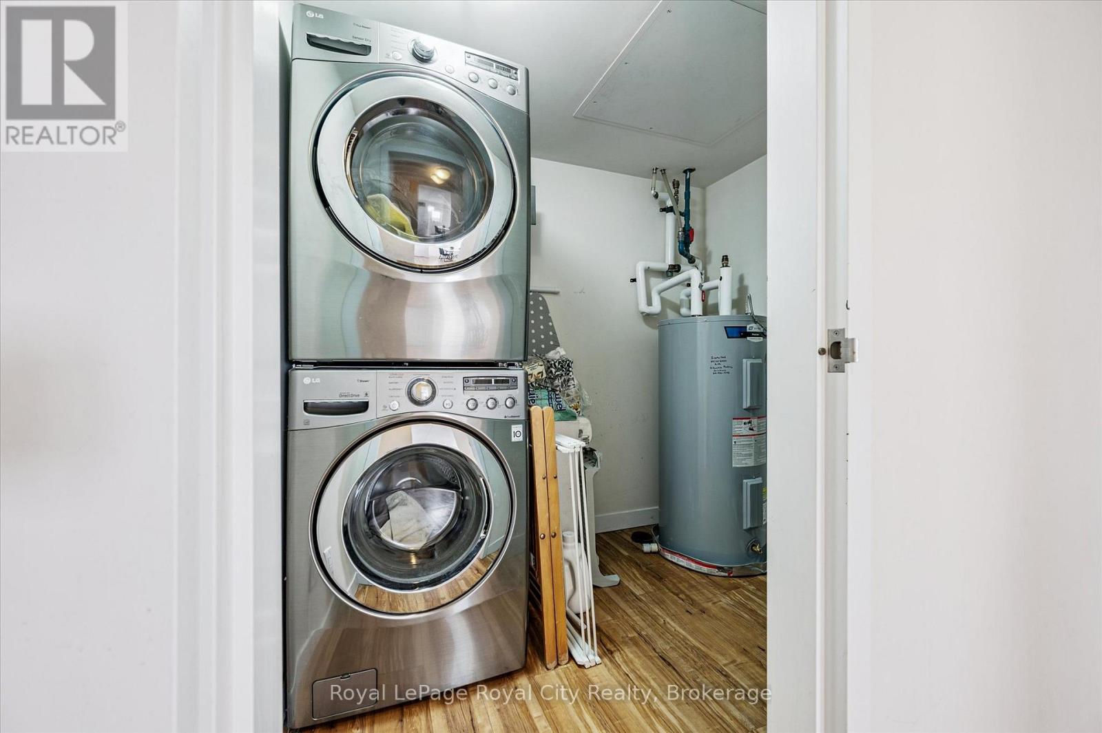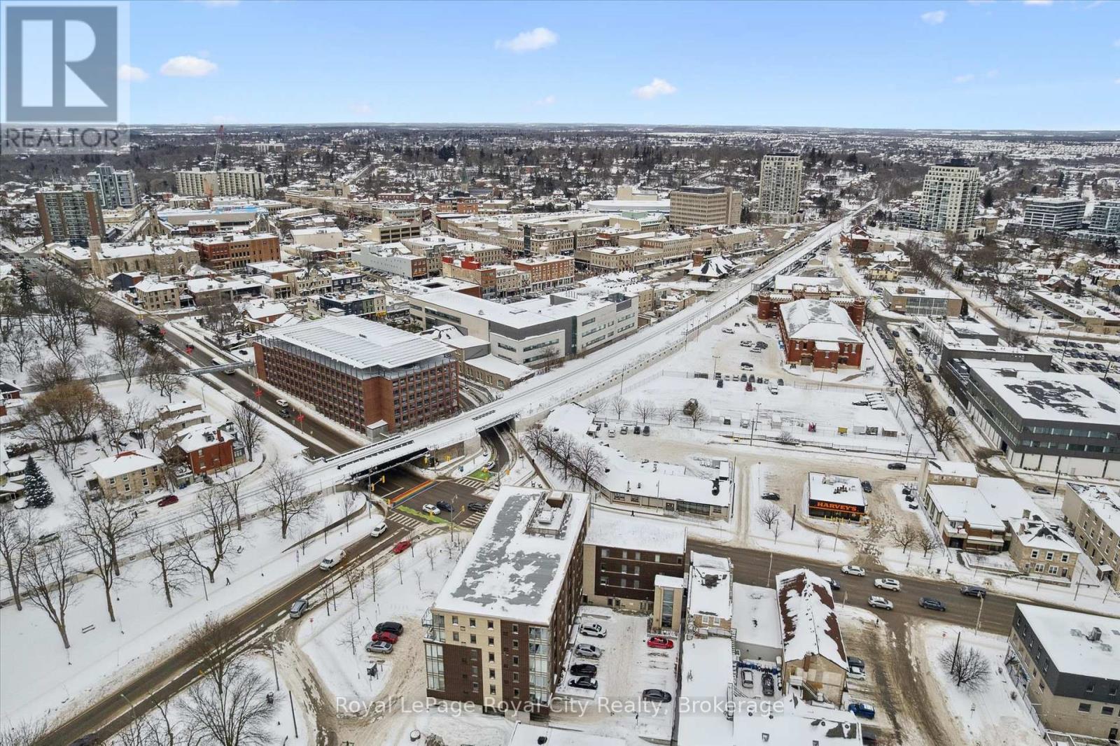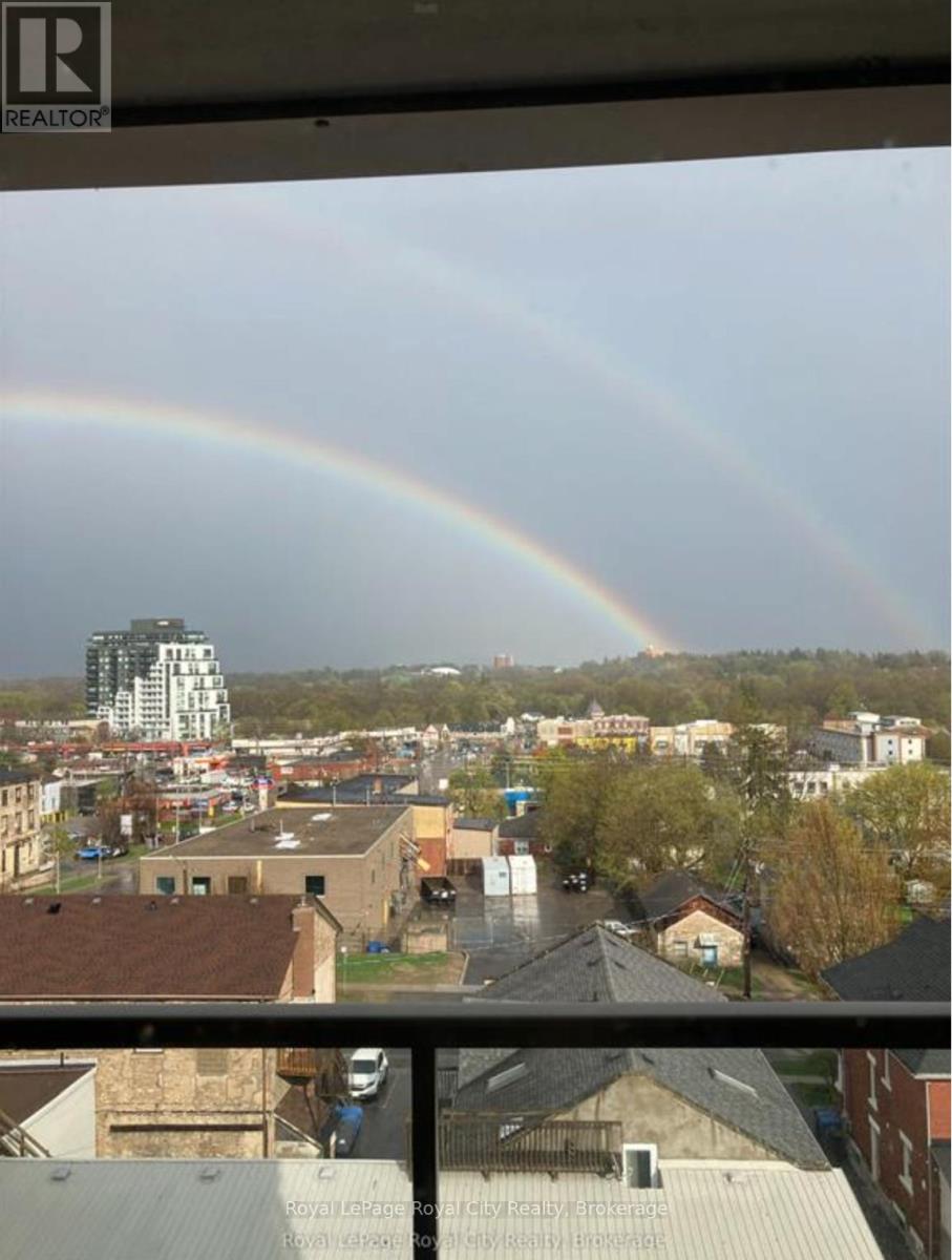 Located on the top floor, this bright corner unit with floor-to-ceiling windows offers stunning panoramic views stretching from The Ward to the West End, with beautiful sightlines toward the University of Guelph to enjoy in every season. Large windows and a private balcony flood the space with natural light, while the functional layout includes two bedrooms, a 4-piece bathroom, in-suite laundry, and an open-concept kitchen, dining, and living area ideal for modern living. Ample storage is found throughout, including a generous front hall closet + the unit features a spacious laundry room offering more storage and an owned hot water heater (2024). Located in the heart of Downtown Guelph, the building is home to Balzac's Coffee Roasters on the ground floor and is just steps to shops, restaurants, the Guelph Farmers' Market, and local amenities. A short walk to Guelph Central Station provides access to GO Transit trains and buses, VIA Rail, and multiple local transit routes-making this an ideal location for commuters and city lovers alike. (id:64974)