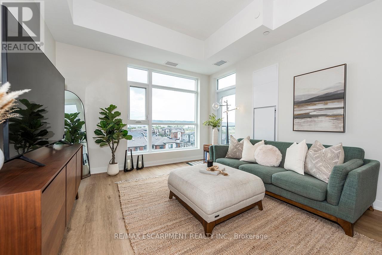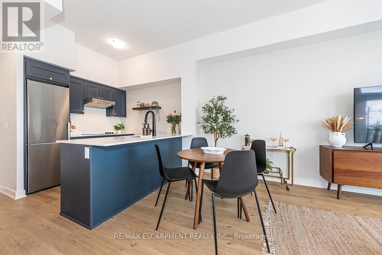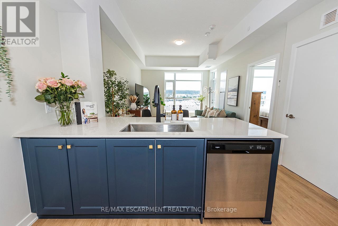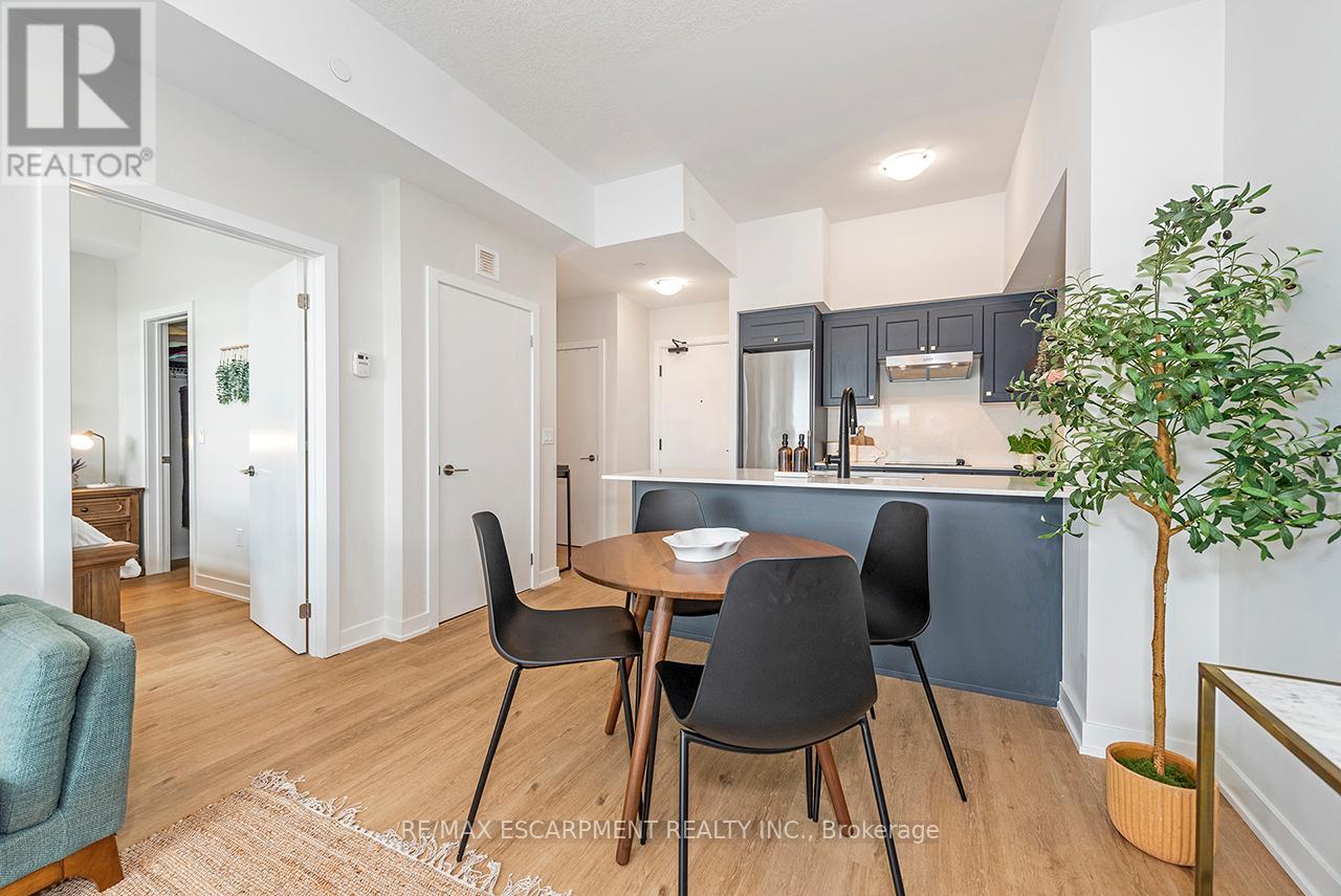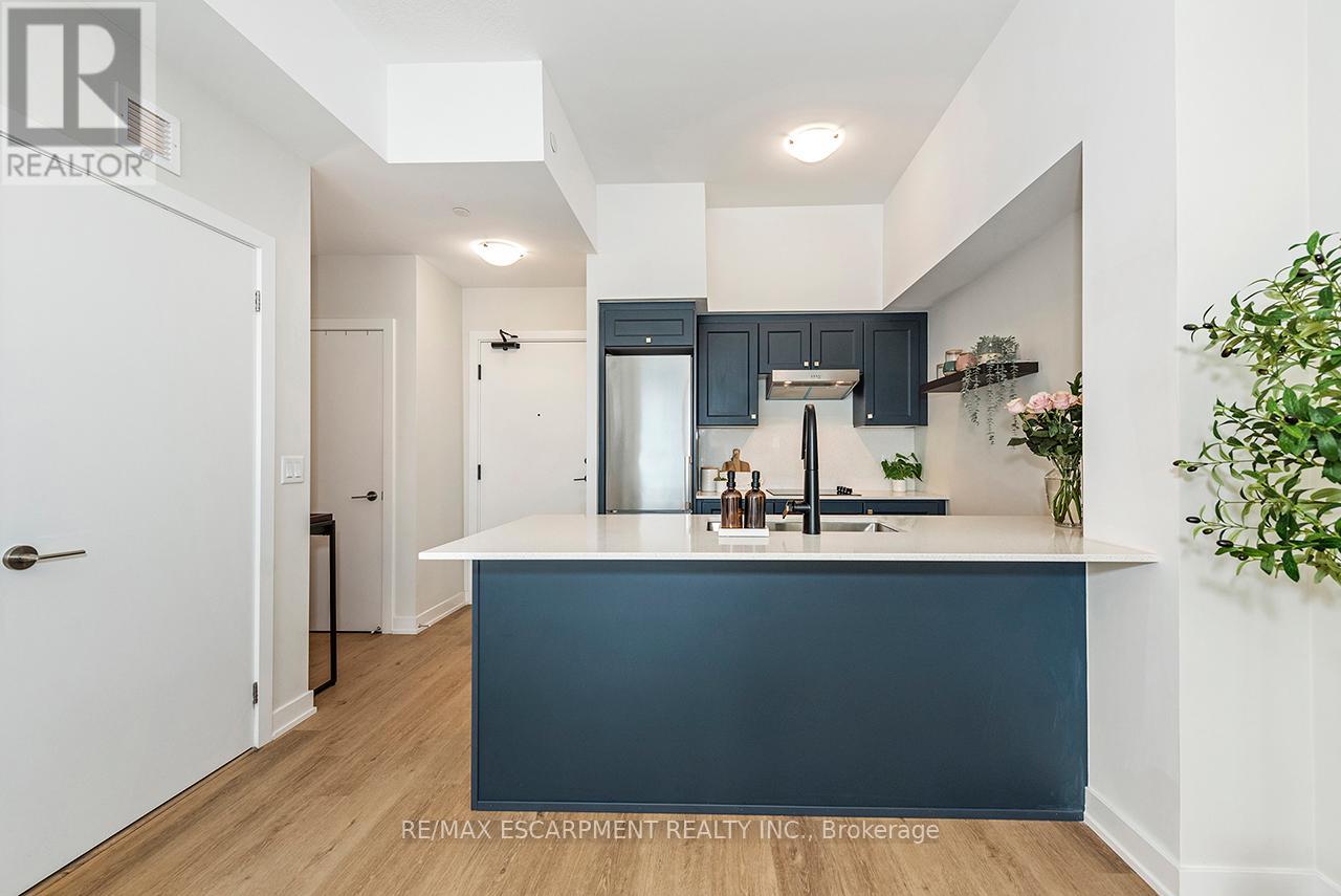 Welcome to your penthouse retreat at COMO Condos in Stoney Creek! This impressive penthouse suite features 9-ft ceilings, a bright open-concept layout, and oversized windows that fill the space with natural light. The modern kitchen is beautifully appointed with quartz counters and backsplash, soft-close cabinetry with gold hardware, an upgraded MOEN faucet and sink, and plenty of counter space for cooking or entertaining. The chic bathroom showcases upgraded tile work, recessed shower lighting, and ceiling tiles above the tub for a spa-like touch. The spacious bedroom with a walk-in closet and motorized roller blinds, provides both comfort and function, while the private balcony offers escarpment views and spectacular sunsets. With vinyl flooring throughout, elegant finishes, and a prime location just minutes to the GO Station, QEW, hiking trails, shops, dining, and Niagara's renowned wineries, this penthouse combines convenience, sophistication, and lifestyle in one exceptional package. (id:64974)