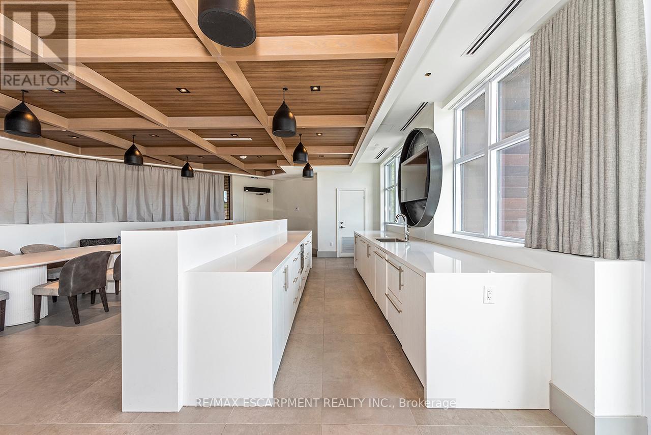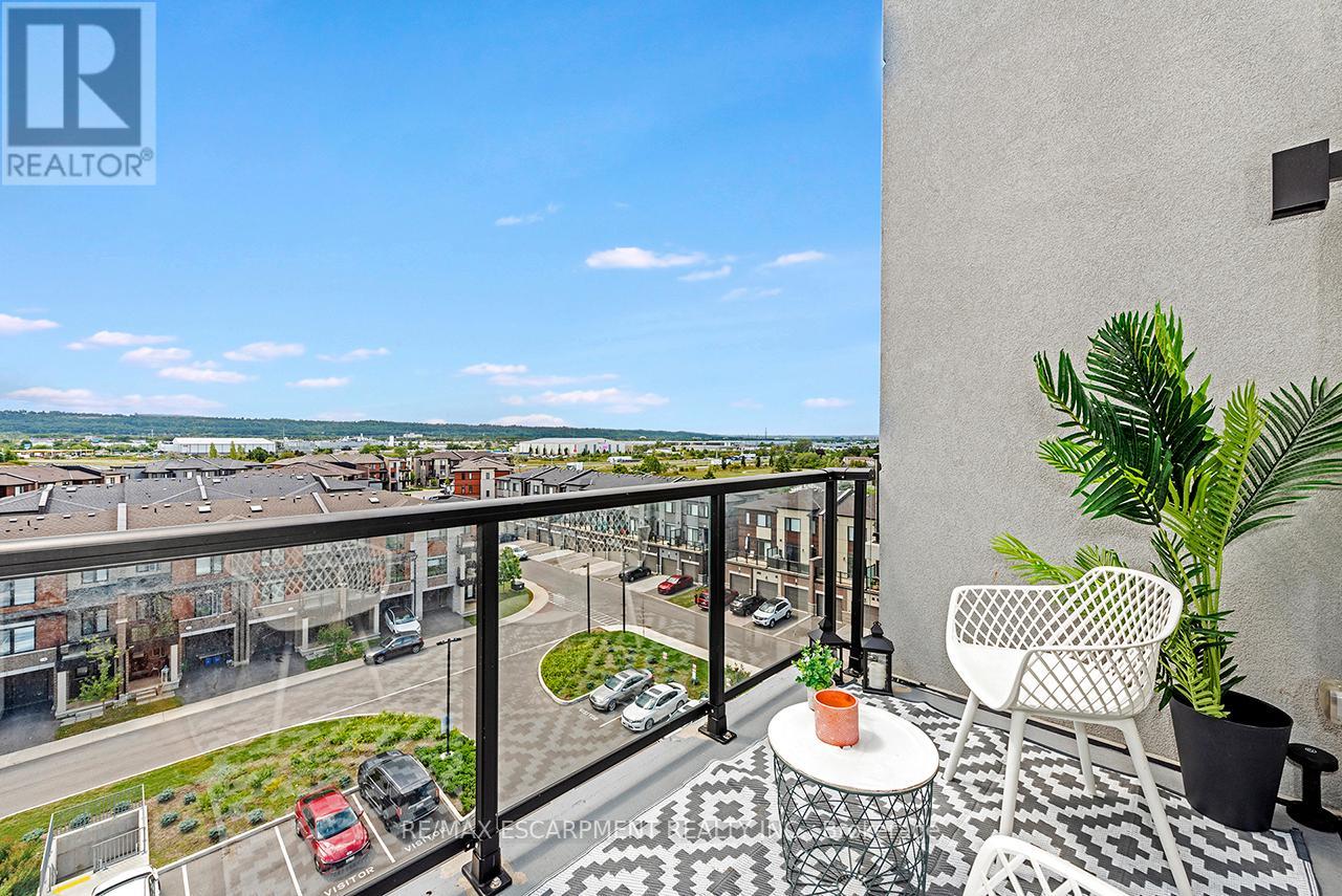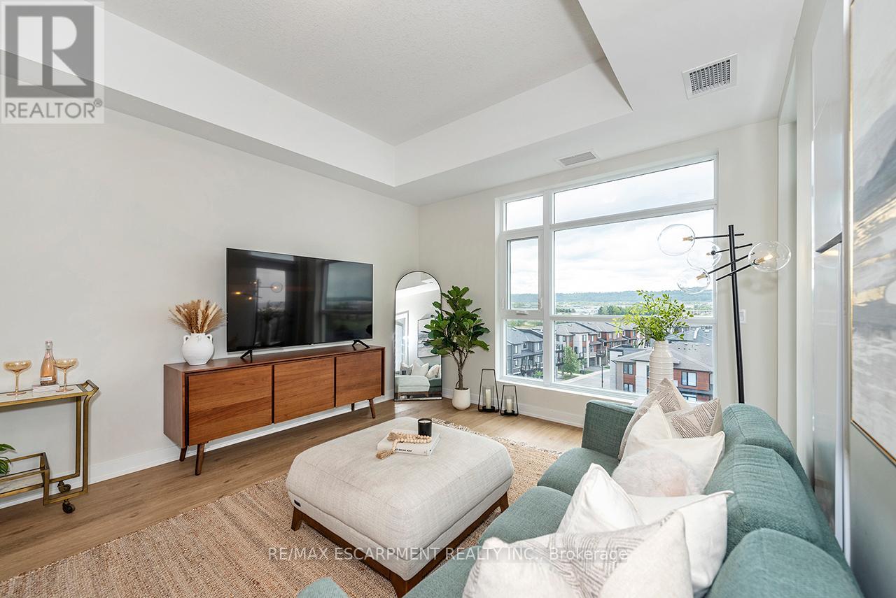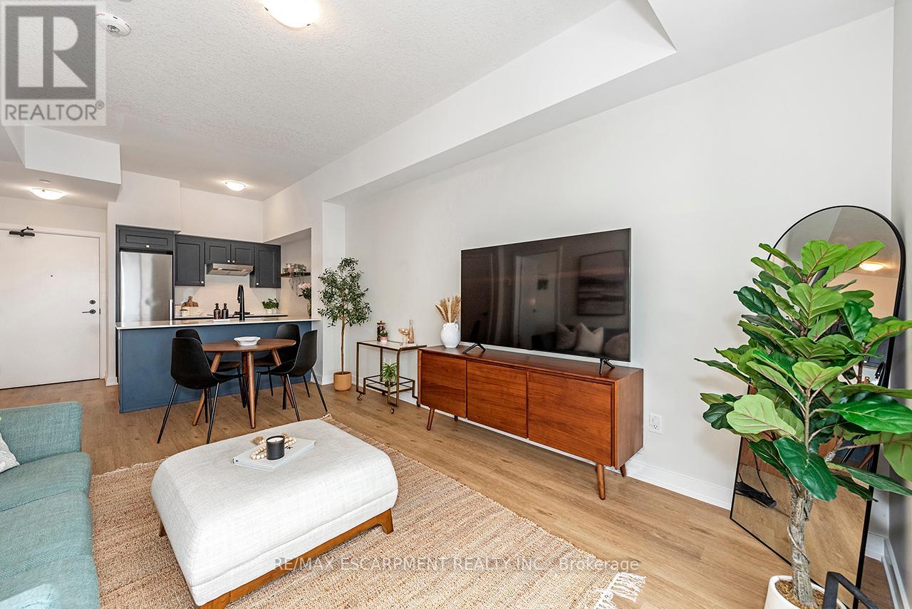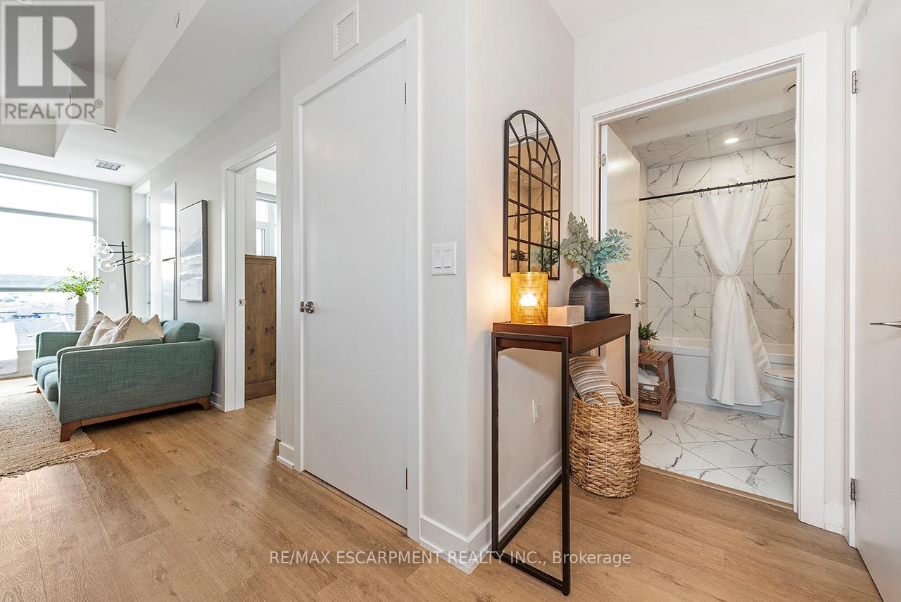 Welcome to your penthouse retreat at COMO Condos in Stoney Creek! This impressive penthouse suite features 9-ft ceilings, a bright open-concept layout, and oversized windows that fill the space with natural light. The modern kitchen is beautifully appointed with quartz counters and backsplash, soft-close cabinetry with gold hardware, an upgraded MOEN faucet and sink, and plenty of counter space for cooking or entertaining. The chic bathroom showcases upgraded tile work, recessed shower lighting, and ceiling tiles above the tub for a spa-like touch. The spacious bedroom with a walk-in closet and motorized roller blinds, provides both comfort and function, while the private balcony offers escarpment views and spectacular sunsets. With vinyl flooring throughout, elegant finishes, and a prime location just minutes to the GO Station, QEW, hiking trails, shops, dining, and Niagara's renowned wineries, this penthouse combines convenience, sophistication, and lifestyle in one exceptional package. (id:64974)