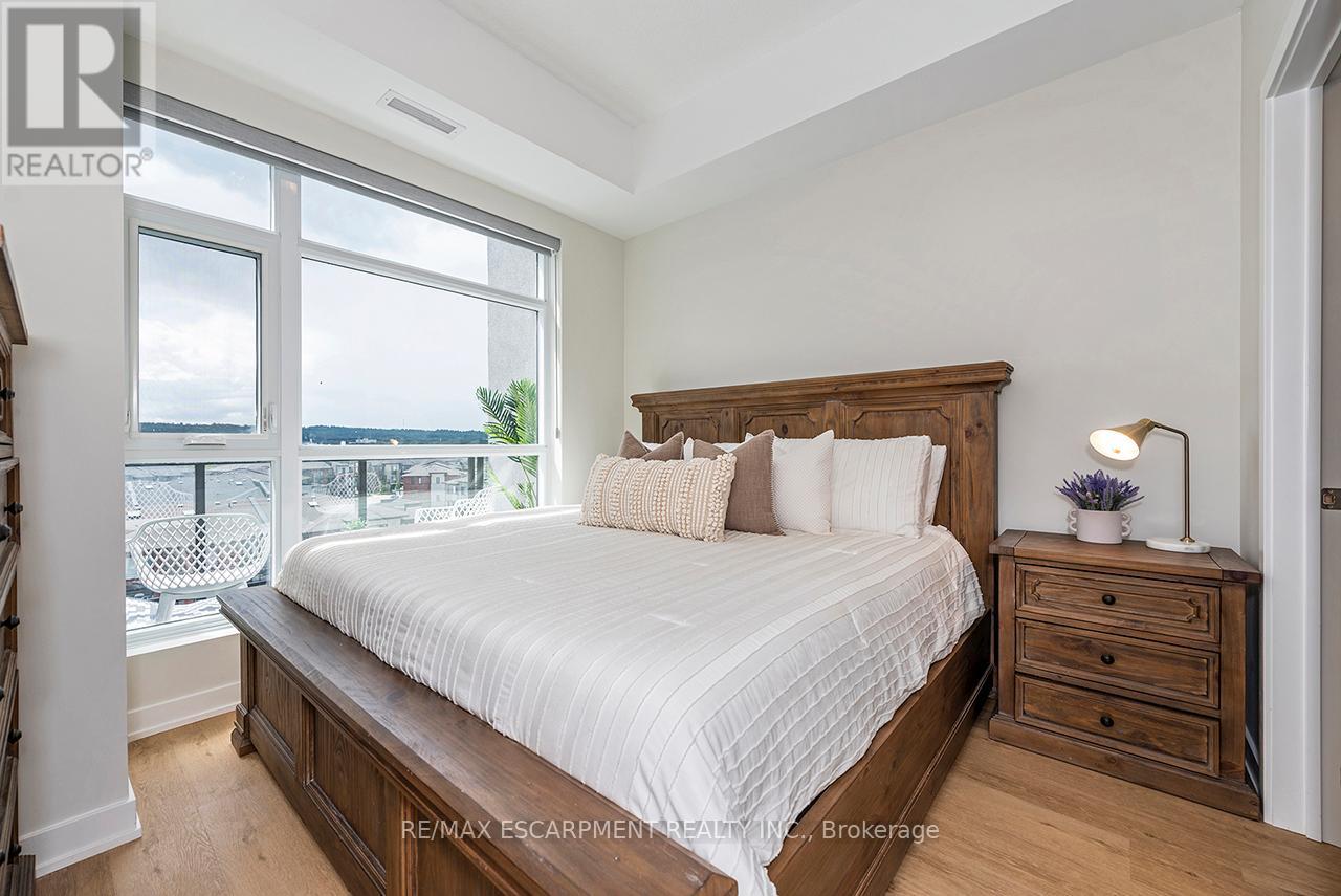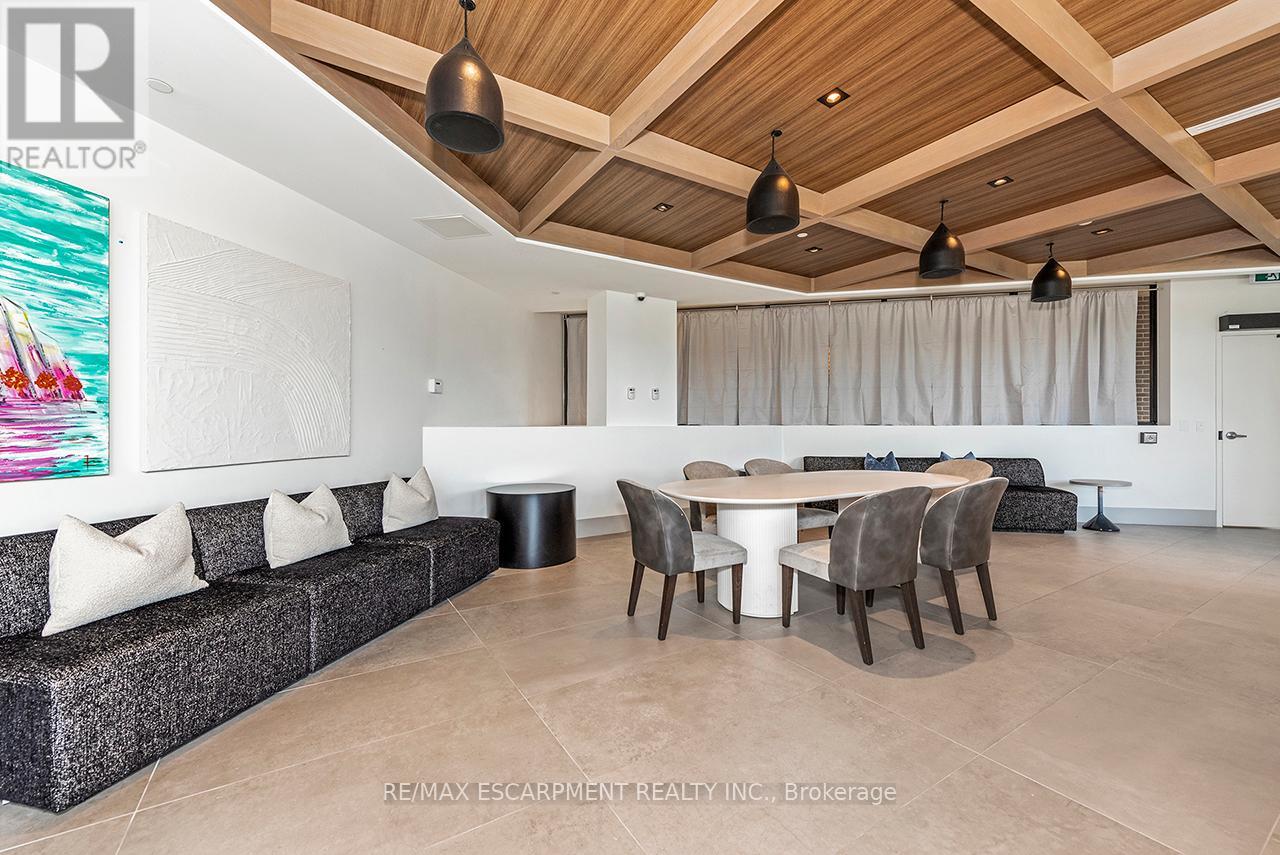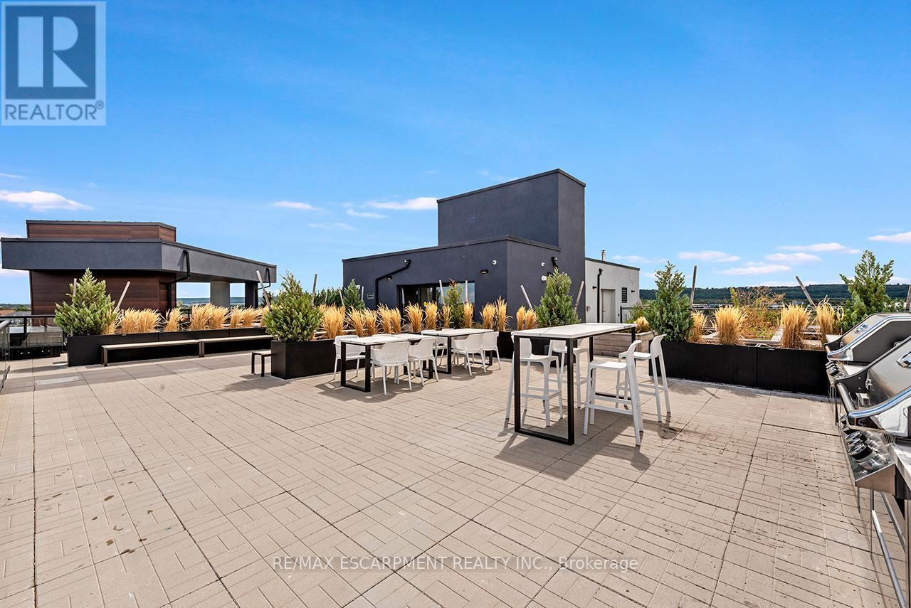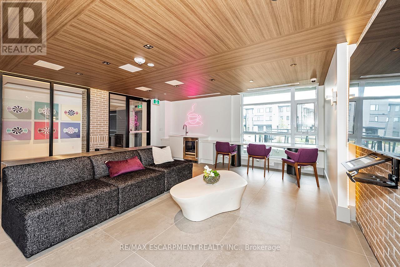 Welcome to your penthouse retreat at COMO Condos in Stoney Creek! This impressive penthouse suite features 9-ft ceilings, a bright open-concept layout, and oversized windows that fill the space with natural light. The modern kitchen is beautifully appointed with quartz counters and backsplash, soft-close cabinetry with gold hardware, an upgraded MOEN faucet and sink, and plenty of counter space for cooking or entertaining. The chic bathroom showcases upgraded tile work, recessed shower lighting, and ceiling tiles above the tub for a spa-like touch. The spacious bedroom with a walk-in closet and motorized roller blinds, provides both comfort and function, while the private balcony offers escarpment views and spectacular sunsets. With vinyl flooring throughout, elegant finishes, and a prime location just minutes to the GO Station, QEW, hiking trails, shops, dining, and Niagara's renowned wineries, this penthouse combines convenience, sophistication, and lifestyle in one exceptional package. (id:64974)