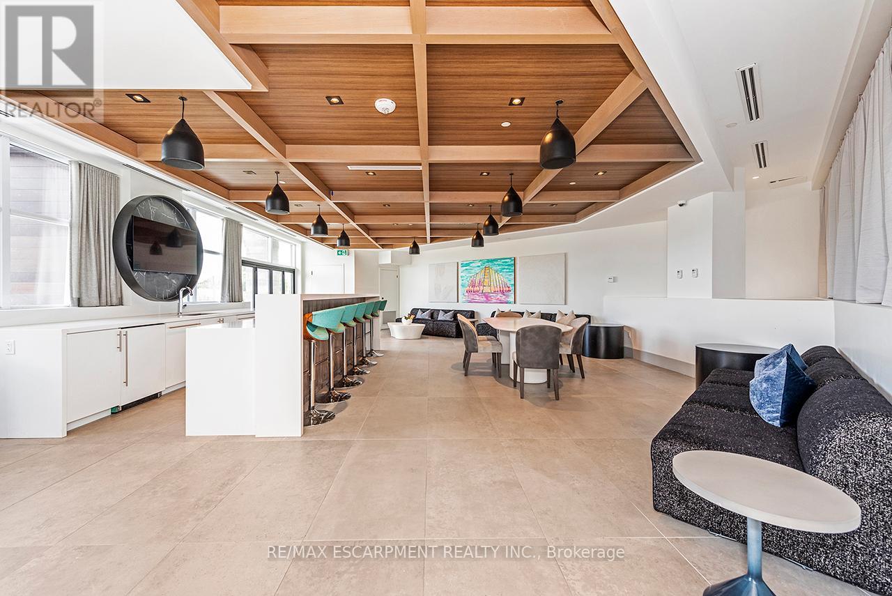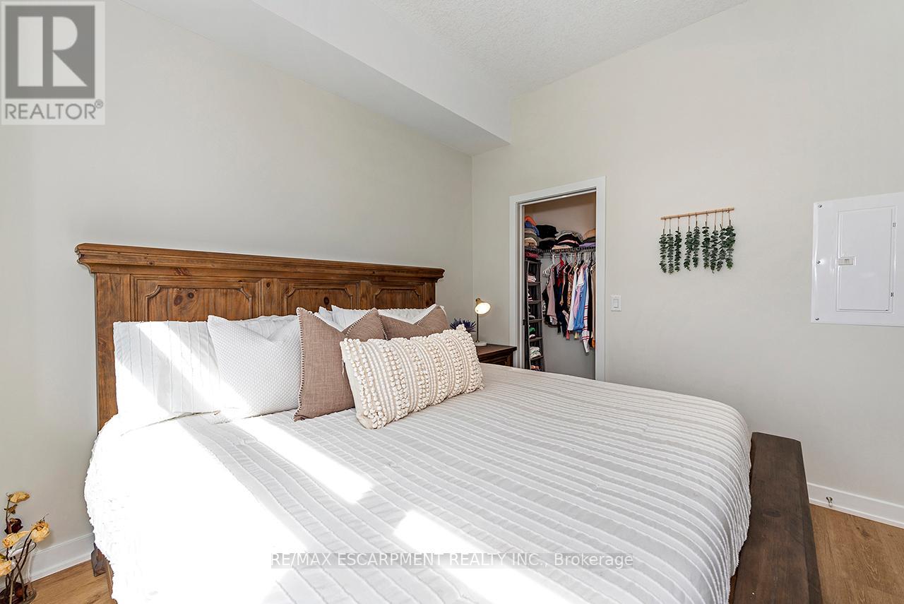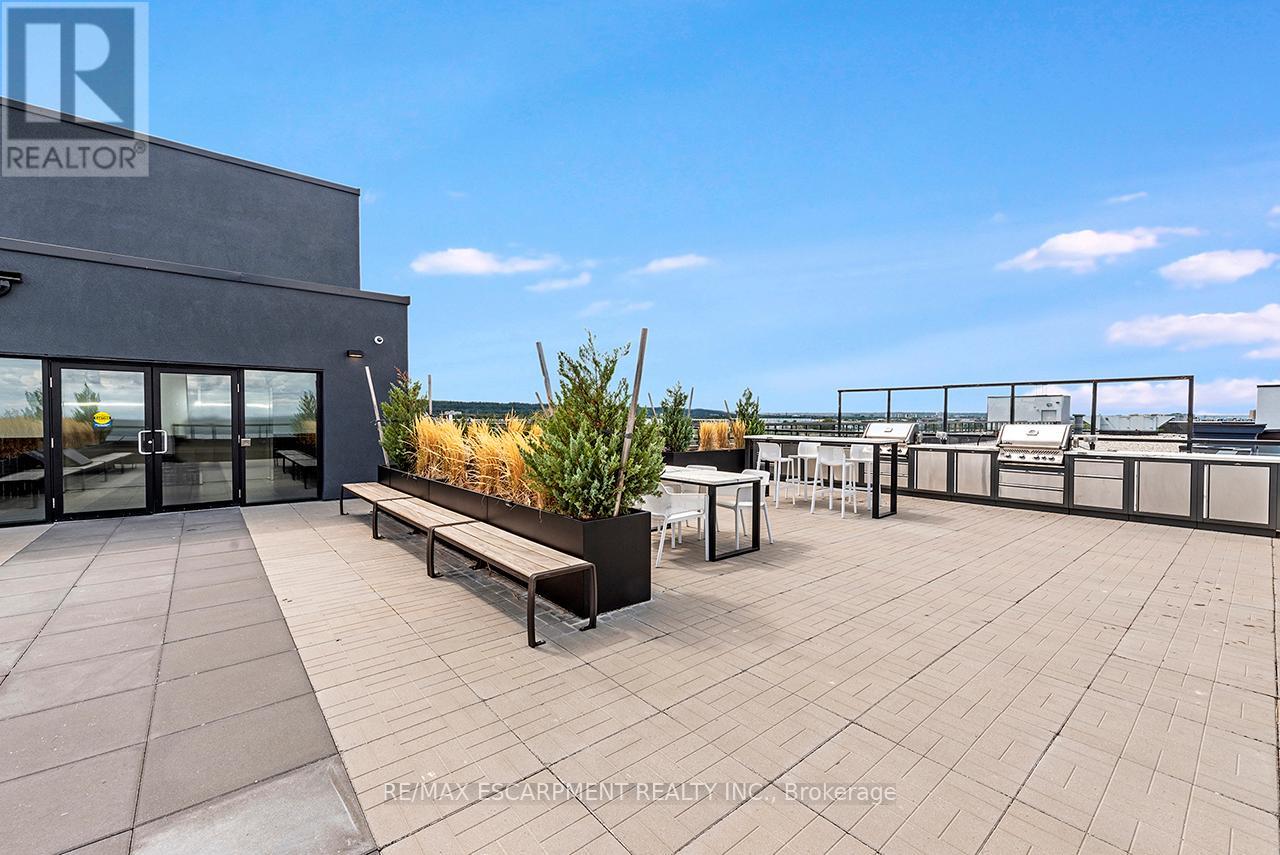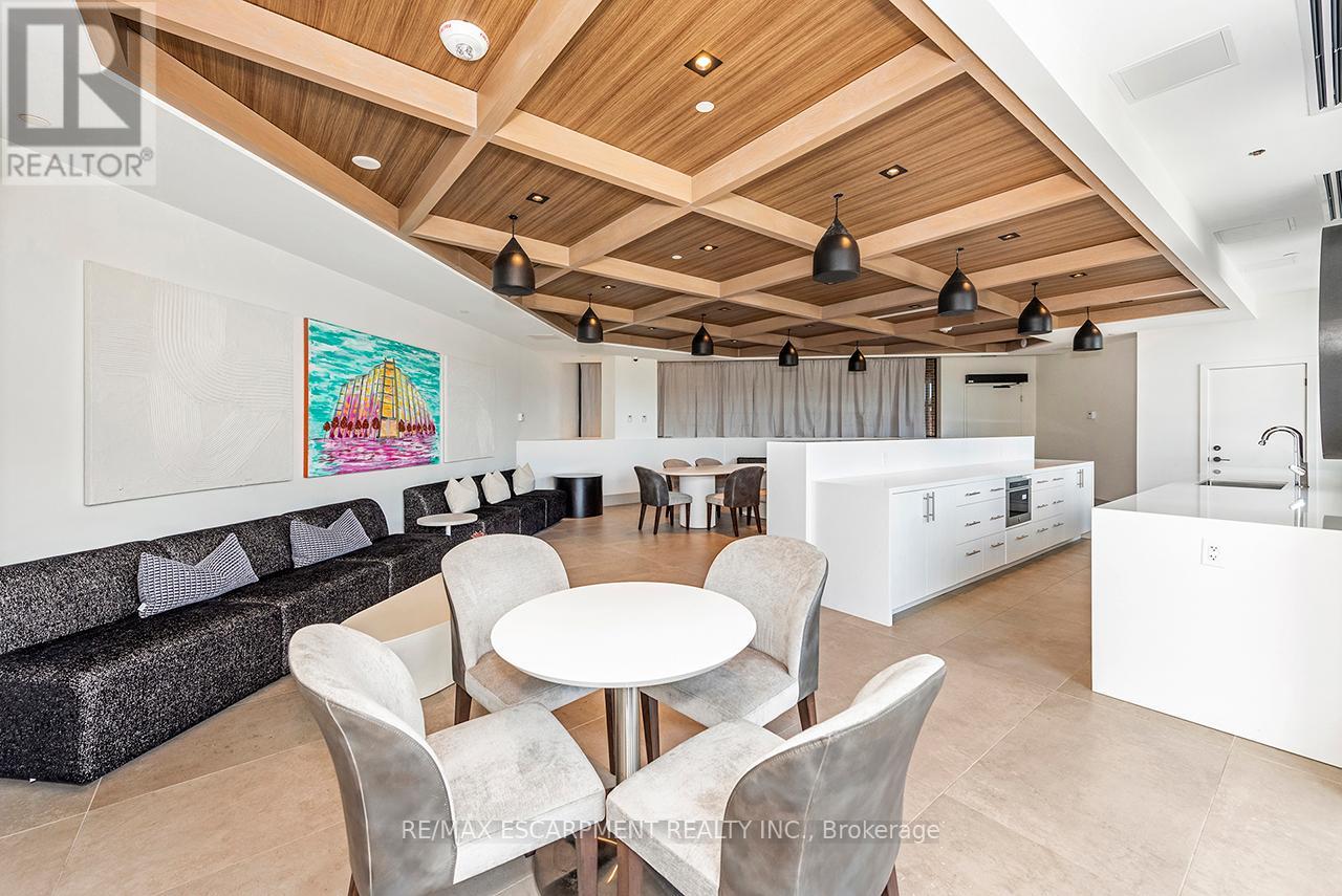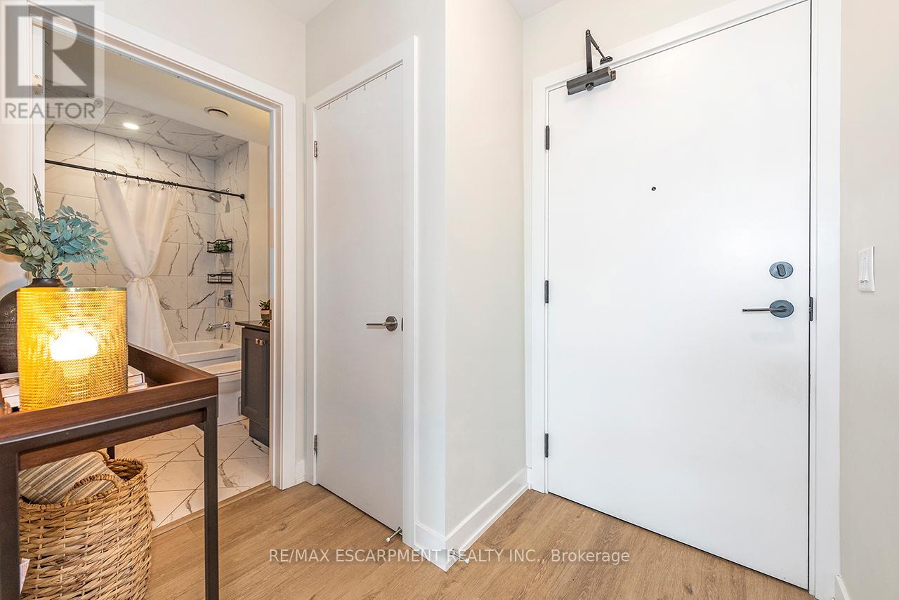 Welcome to your penthouse retreat at COMO Condos in Stoney Creek! This impressive penthouse suite features 9-ft ceilings, a bright open-concept layout, and oversized windows that fill the space with natural light. The modern kitchen is beautifully appointed with quartz counters and backsplash, soft-close cabinetry with gold hardware, an upgraded MOEN faucet and sink, and plenty of counter space for cooking or entertaining. The chic bathroom showcases upgraded tile work, recessed shower lighting, and ceiling tiles above the tub for a spa-like touch. The spacious bedroom with a walk-in closet and motorized roller blinds, provides both comfort and function, while the private balcony offers escarpment views and spectacular sunsets. With vinyl flooring throughout, elegant finishes, and a prime location just minutes to the GO Station, QEW, hiking trails, shops, dining, and Niagara's renowned wineries, this penthouse combines convenience, sophistication, and lifestyle in one exceptional package. (id:64974)