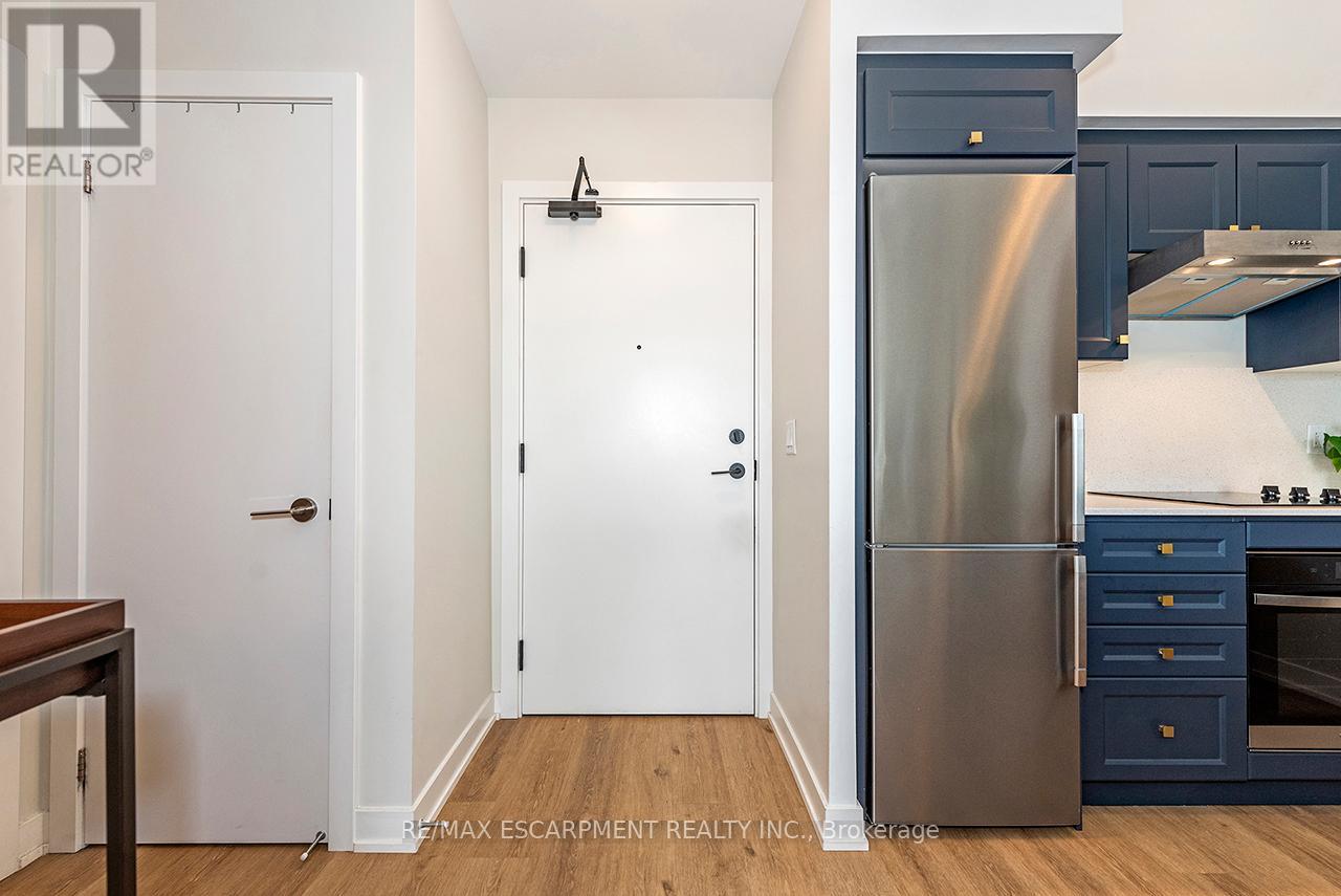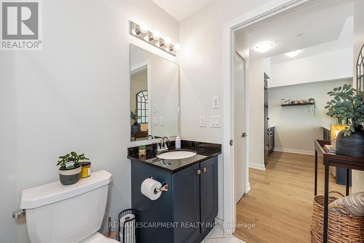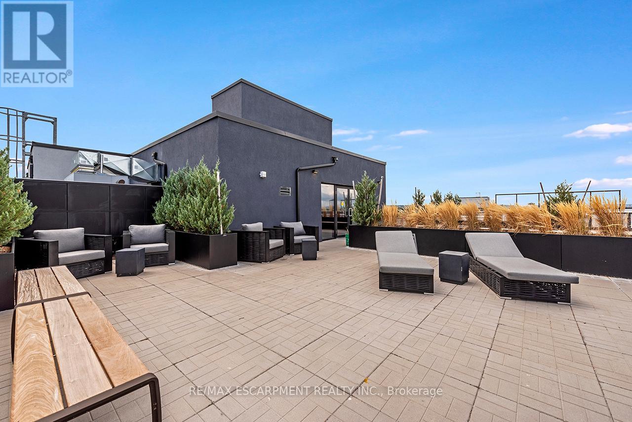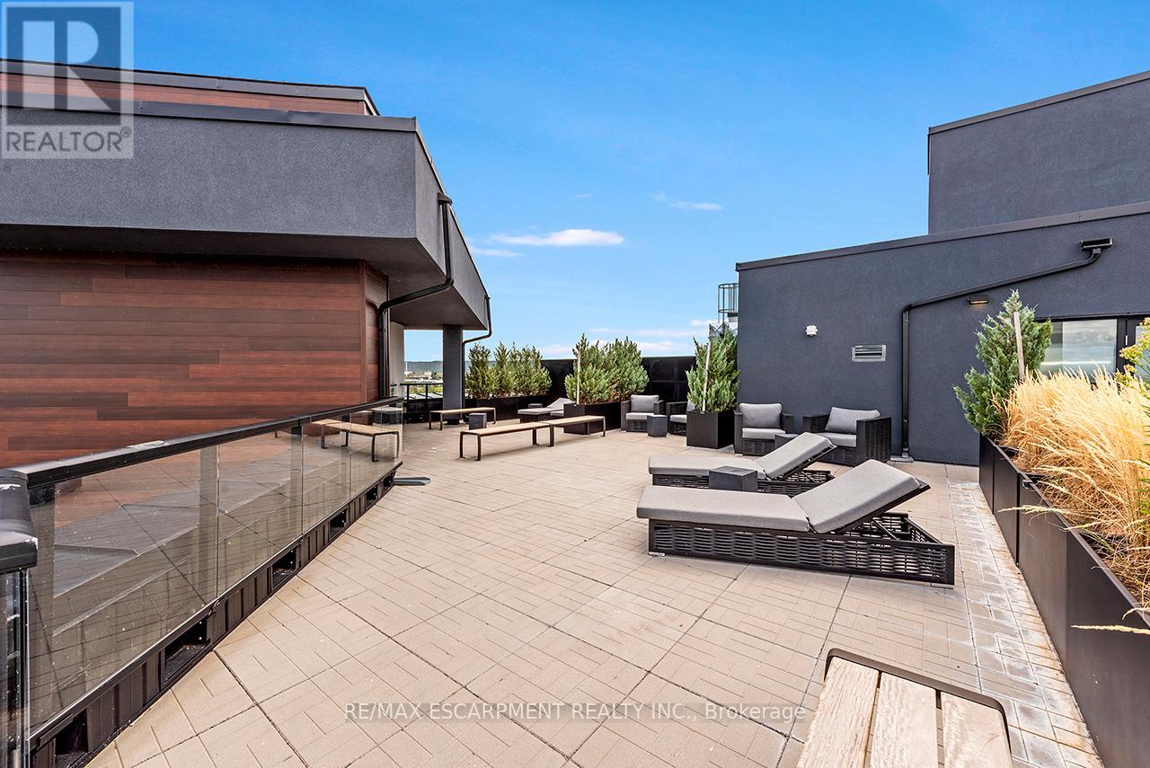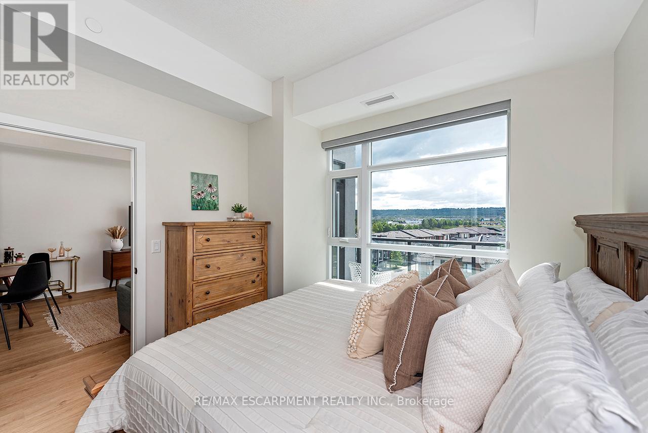 Welcome to your penthouse retreat at COMO Condos in Stoney Creek! This impressive penthouse suite features 9-ft ceilings, a bright open-concept layout, and oversized windows that fill the space with natural light. The modern kitchen is beautifully appointed with quartz counters and backsplash, soft-close cabinetry with gold hardware, an upgraded MOEN faucet and sink, and plenty of counter space for cooking or entertaining. The chic bathroom showcases upgraded tile work, recessed shower lighting, and ceiling tiles above the tub for a spa-like touch. The spacious bedroom with a walk-in closet and motorized roller blinds, provides both comfort and function, while the private balcony offers escarpment views and spectacular sunsets. With vinyl flooring throughout, elegant finishes, and a prime location just minutes to the GO Station, QEW, hiking trails, shops, dining, and Niagara's renowned wineries, this penthouse combines convenience, sophistication, and lifestyle in one exceptional package. (id:64974)