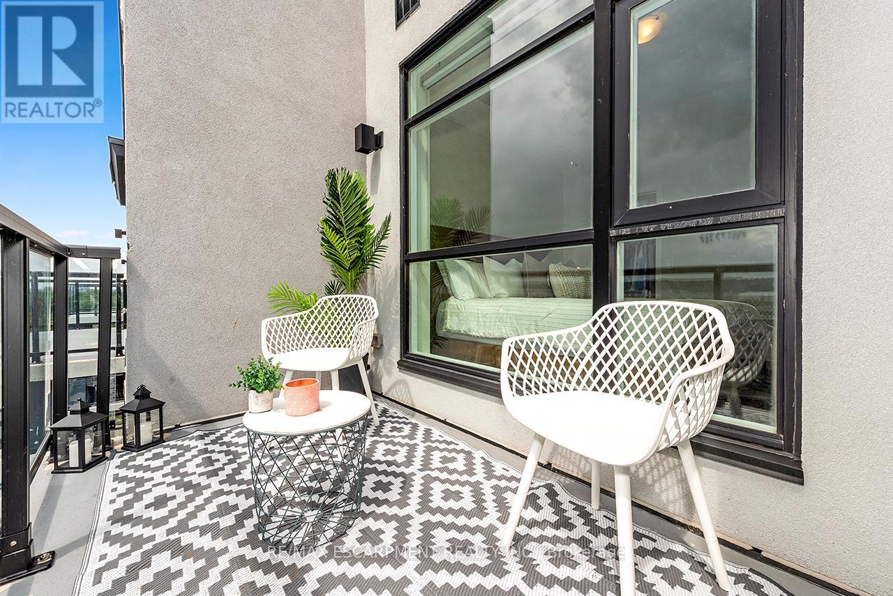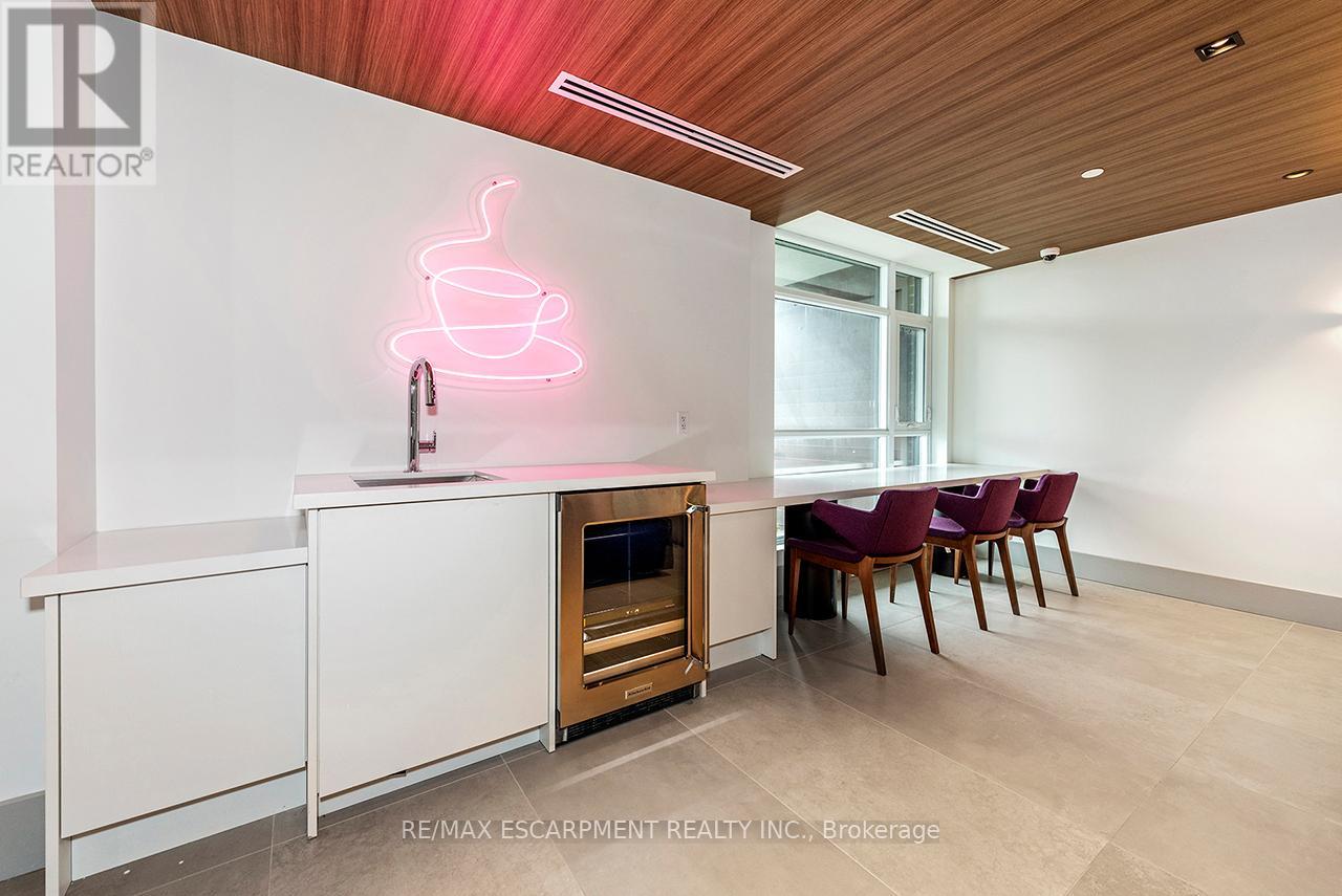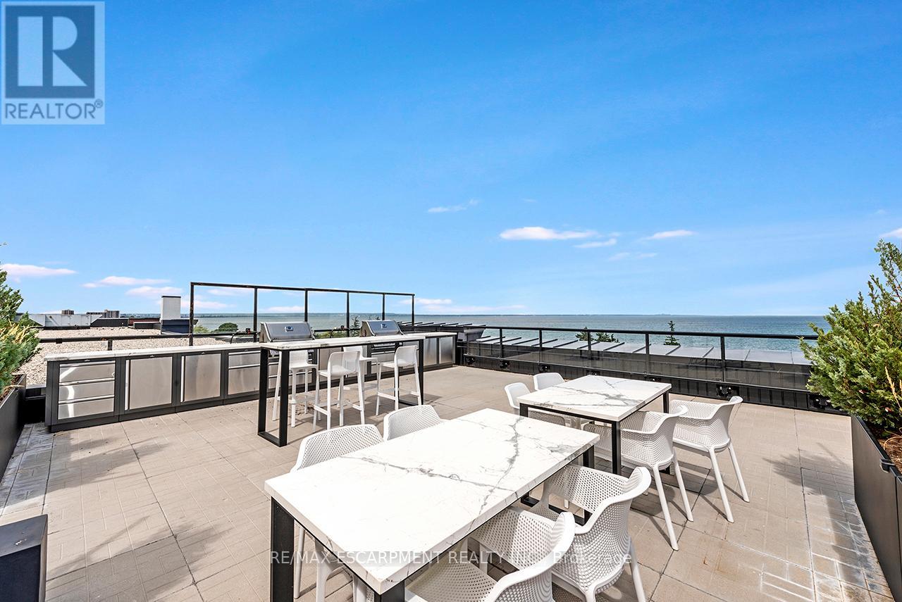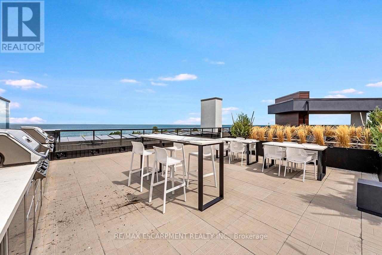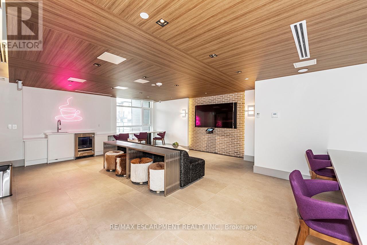 Welcome to your penthouse retreat at COMO Condos in Stoney Creek! This impressive penthouse suite features 9-ft ceilings, a bright open-concept layout, and oversized windows that fill the space with natural light. The modern kitchen is beautifully appointed with quartz counters and backsplash, soft-close cabinetry with gold hardware, an upgraded MOEN faucet and sink, and plenty of counter space for cooking or entertaining. The chic bathroom showcases upgraded tile work, recessed shower lighting, and ceiling tiles above the tub for a spa-like touch. The spacious bedroom with a walk-in closet and motorized roller blinds, provides both comfort and function, while the private balcony offers escarpment views and spectacular sunsets. With vinyl flooring throughout, elegant finishes, and a prime location just minutes to the GO Station, QEW, hiking trails, shops, dining, and Niagara's renowned wineries, this penthouse combines convenience, sophistication, and lifestyle in one exceptional package. (id:64974)