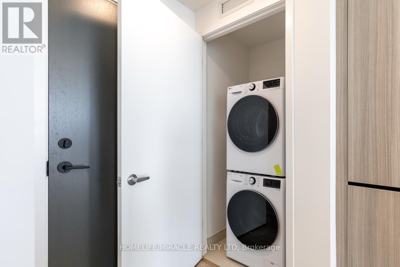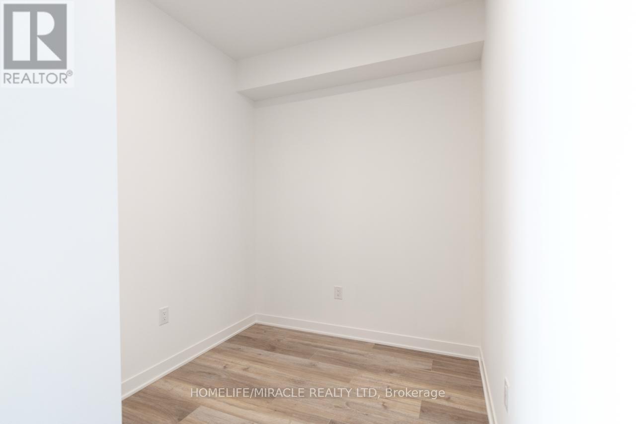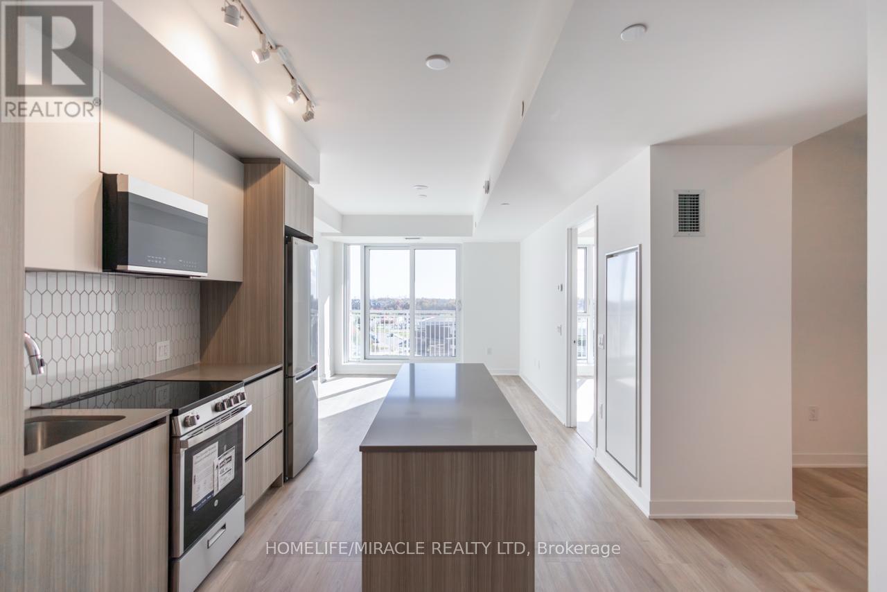 Stunning, brand-new one-bedroom plus den condo in the highly desirable Mount Pleasant community. This never-lived-in unit offers a thoughtfully designed layout with 9-foot ceilings, smooth finishes, LED lighting, and laminate flooring throughout. The unit includes one parking space and convenient LG in-suite laundry. The modern kitchen features quartz countertops, soft-close cabinetry and drawers, a ceramic backsplash, under-cabinet lighting, an under-mount sink, a center island with added storage, a paneled GE dishwasher, and stainless steel appliances. The open-concept living and dining area seamlessly extends to the balcony, creating a bright and inviting space. The primary bedroom boasts a large double mirrored closet, while the generously sized den is perfect for a home office. The stylish 4-piece bathroom includes a vanity with soft-close drawers and a relaxing soaker tub. Residents enjoy access to premium building amenities, including a fitness centre, activity zone, co-working space, kids' club, games lounge, party room, and outdoor barbecue area. Situated just minutes from Mount Pleasant GO Station, shopping, parks, trails, schools and highways. (id:64974)