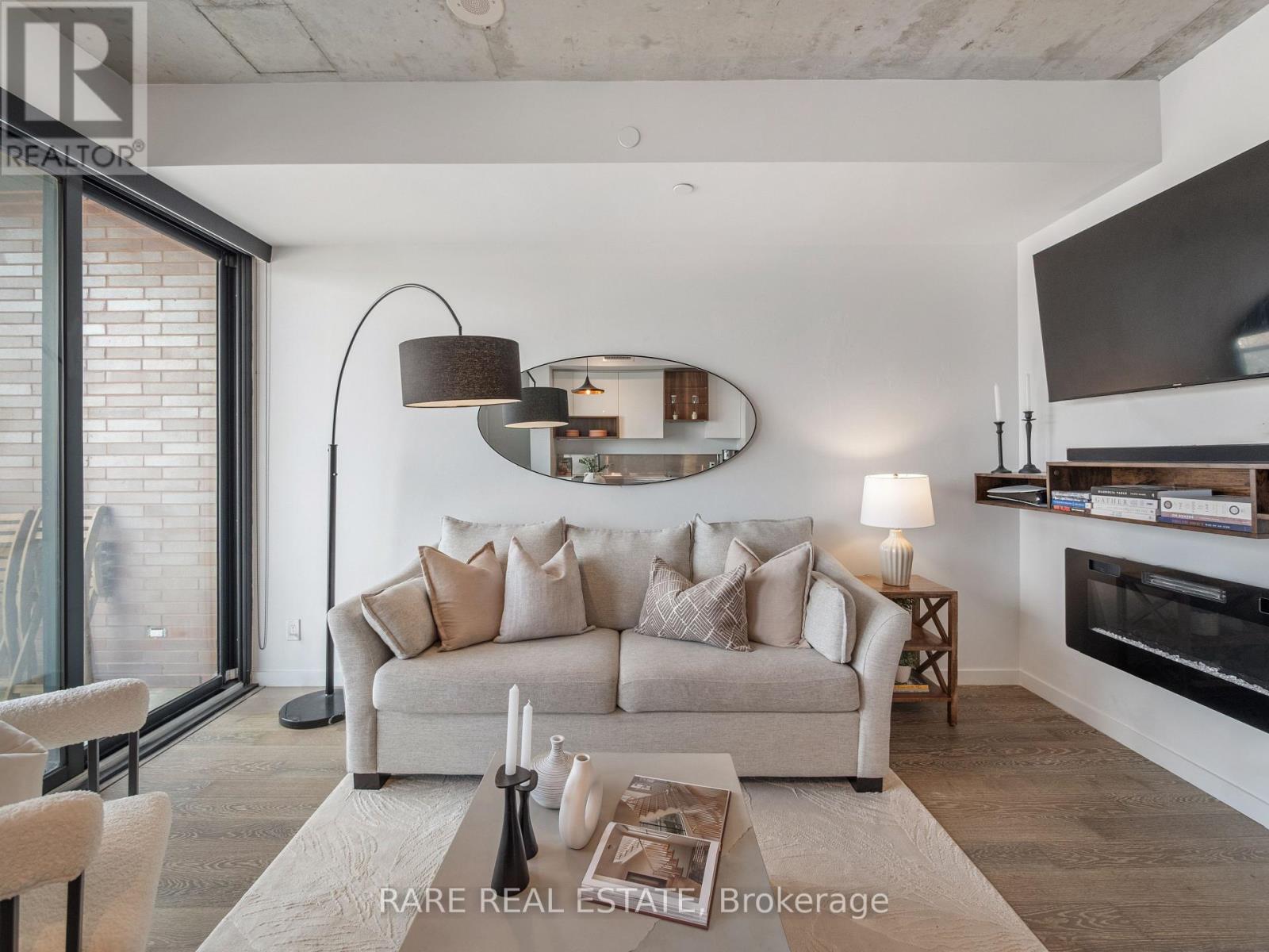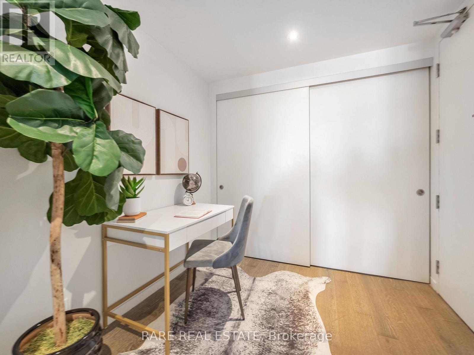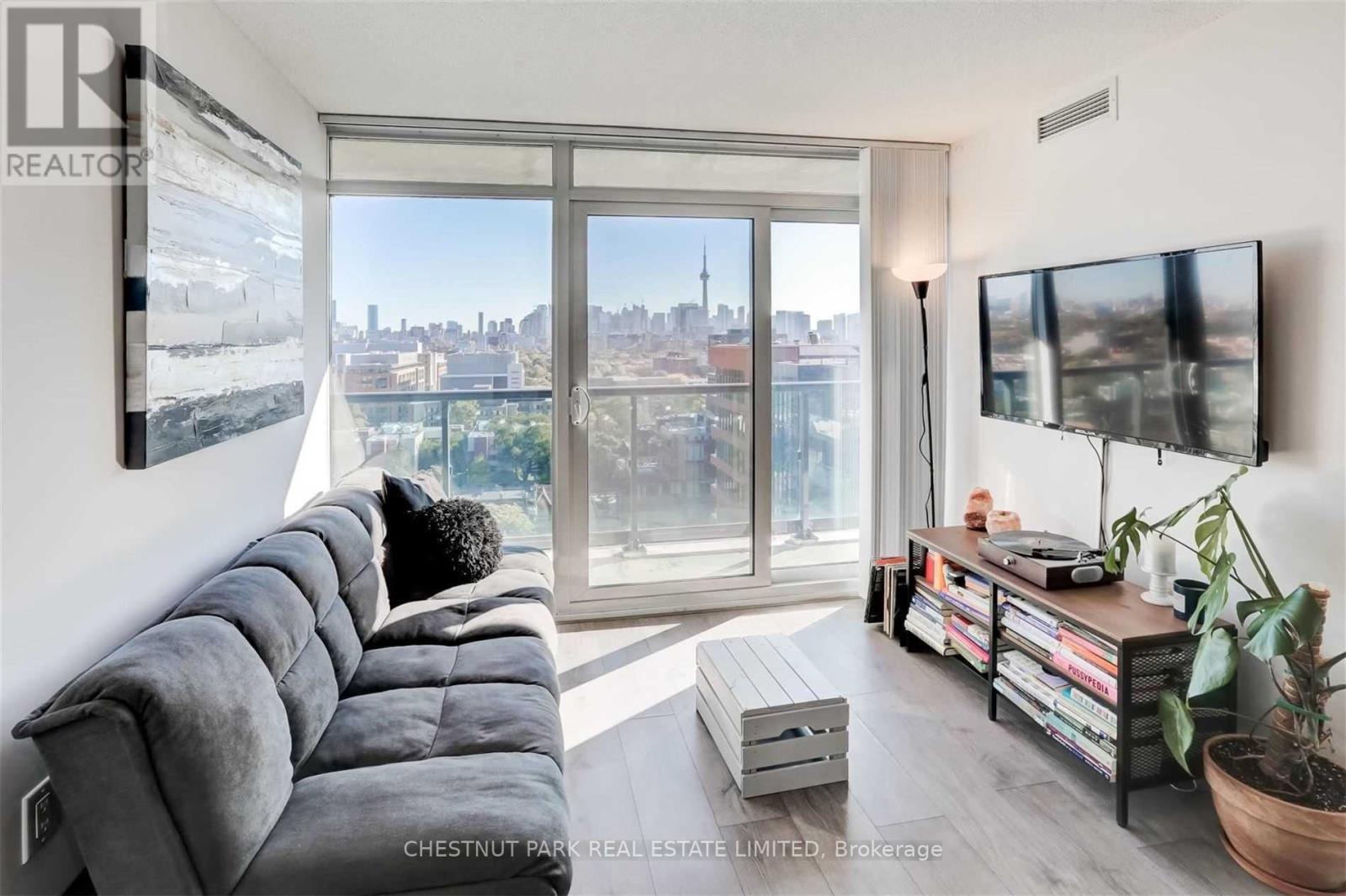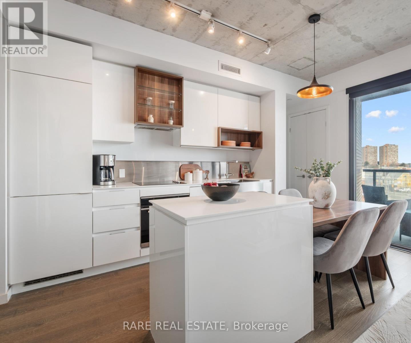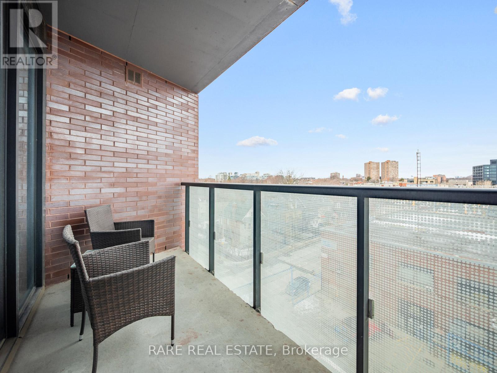 Offers anytime! Welcome to Suite 608 at 383 Sorauren Avenue, a stylish one-bedroom plus den boutique condo in the heart of Roncesvalles. Tucked away on a quiet, tree-lined street, this light-filled suite blends modern loft-inspired design with the charm of one of Toronto's most vibrant neighbourhoods. Inside, you'll find soaring 9-foot exposed concrete ceilings, hardwood floors, and large windows showcasing unobstructed north-west views and filling the space with natural light. The thoughtfully designed layout offers flexibility for a home office, guest space, or creative studio, while the modern kitchen features an island, integrated appliances, and sleek finishes perfect for everyday living and entertaining. Storage is exceptional with a full wall of custom built-in closets providing generous clothing organization, a spacious in-suite storage area just off the dining room, and an additional storage locker. Step outside to enjoy a large private balcony and immediate access to Sorauren Park with its popular farmers' market and dog park. Just minutes away, Roncesvalles Avenue, Dundas Street West, and Queen Street West offer an incredible selection of cafés, restaurants, galleries, and independent shops. Residents enjoy premium amenities including a fully equipped gym, concierge service, party room, guest suite, visitor parking, and bike storage. Boutique condo living paired with the vibrant lifestyle of Roncesvalles. (id:64974)