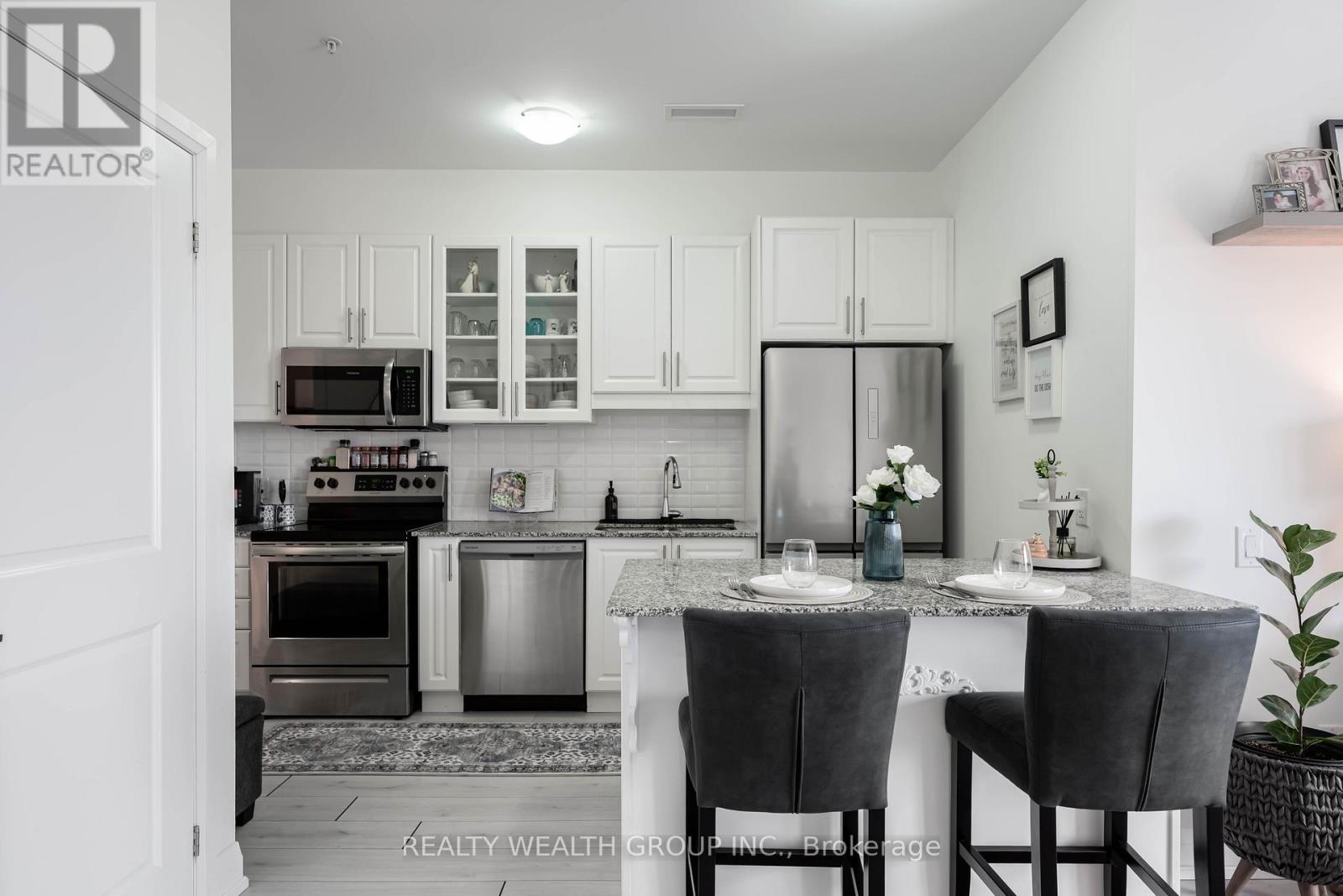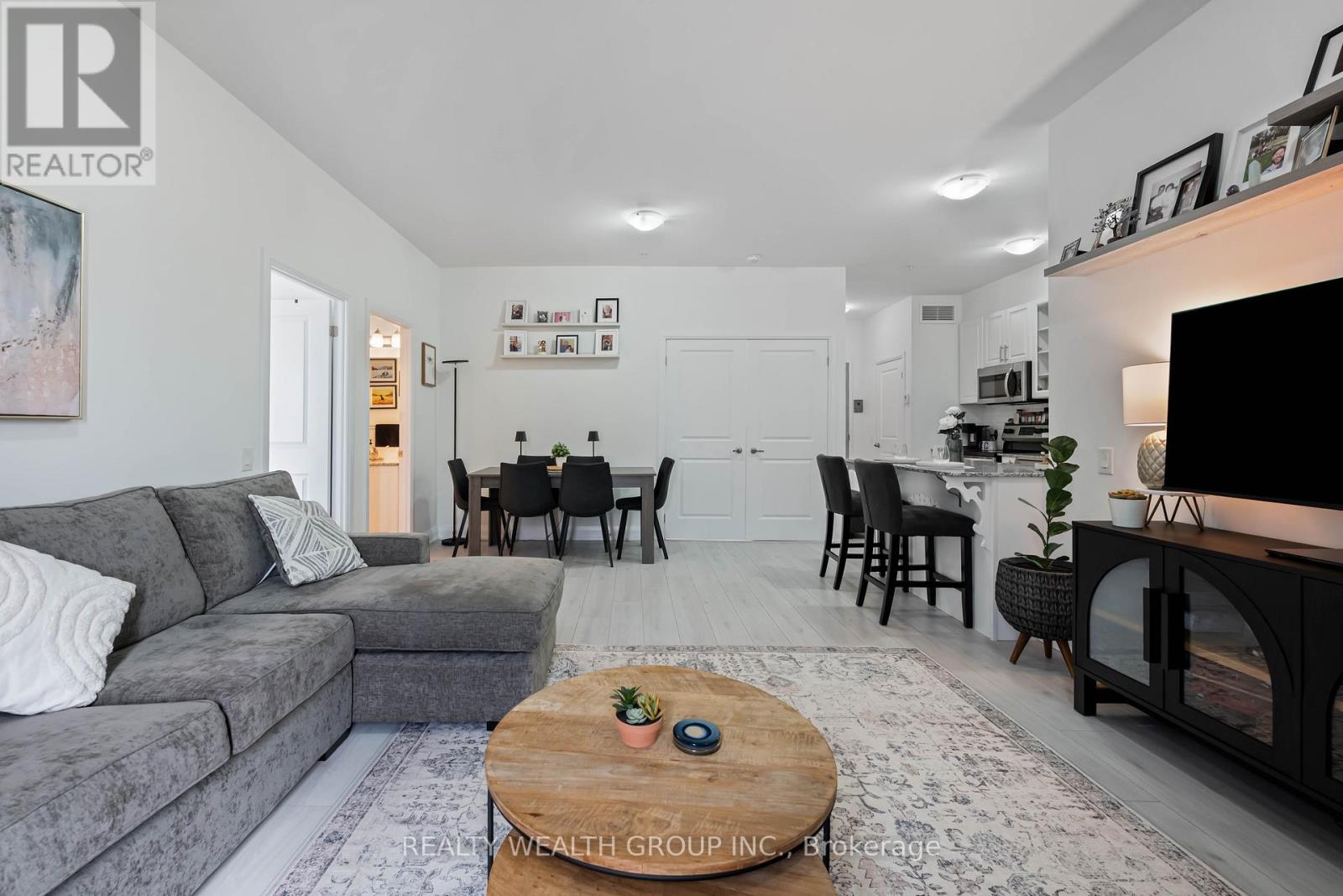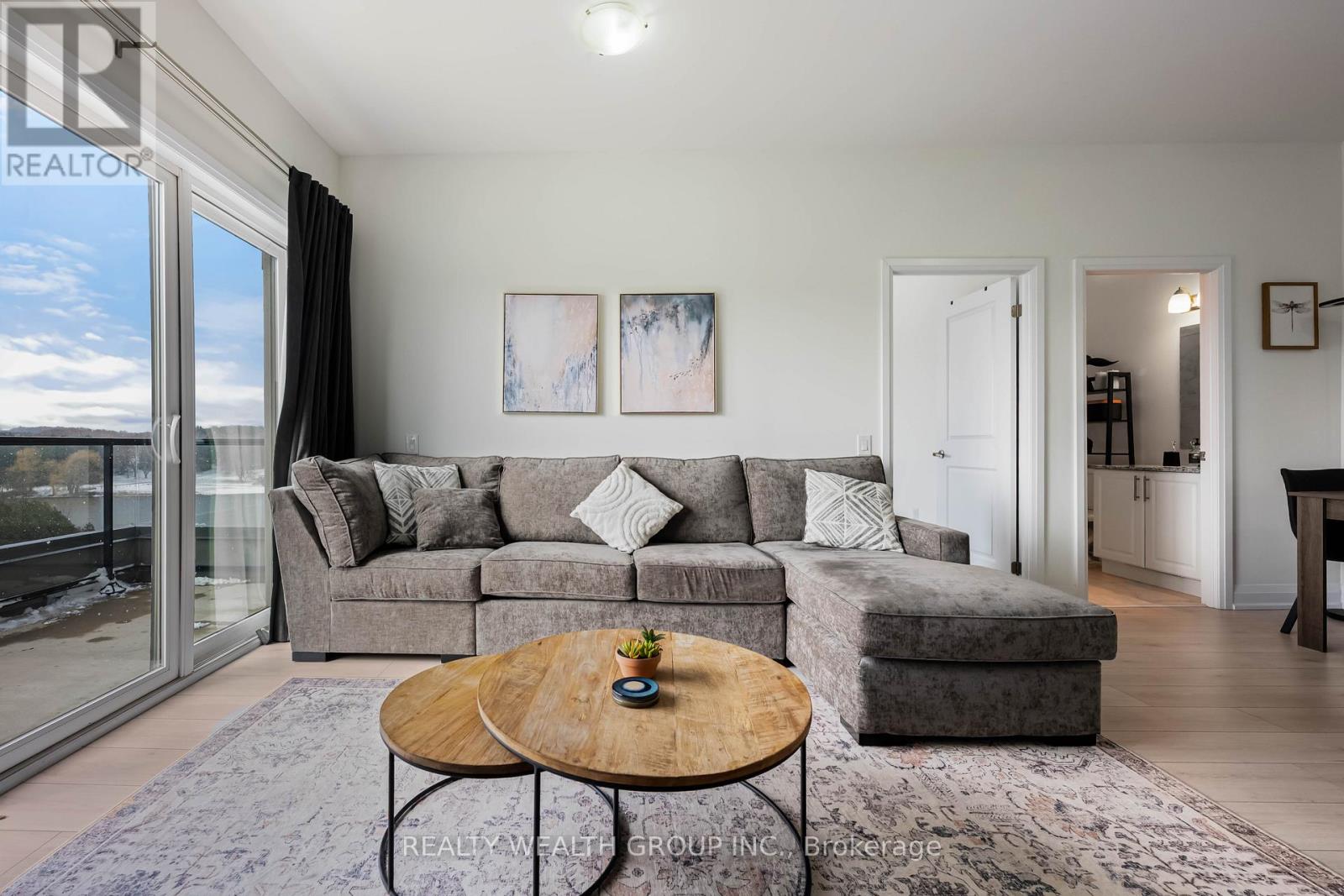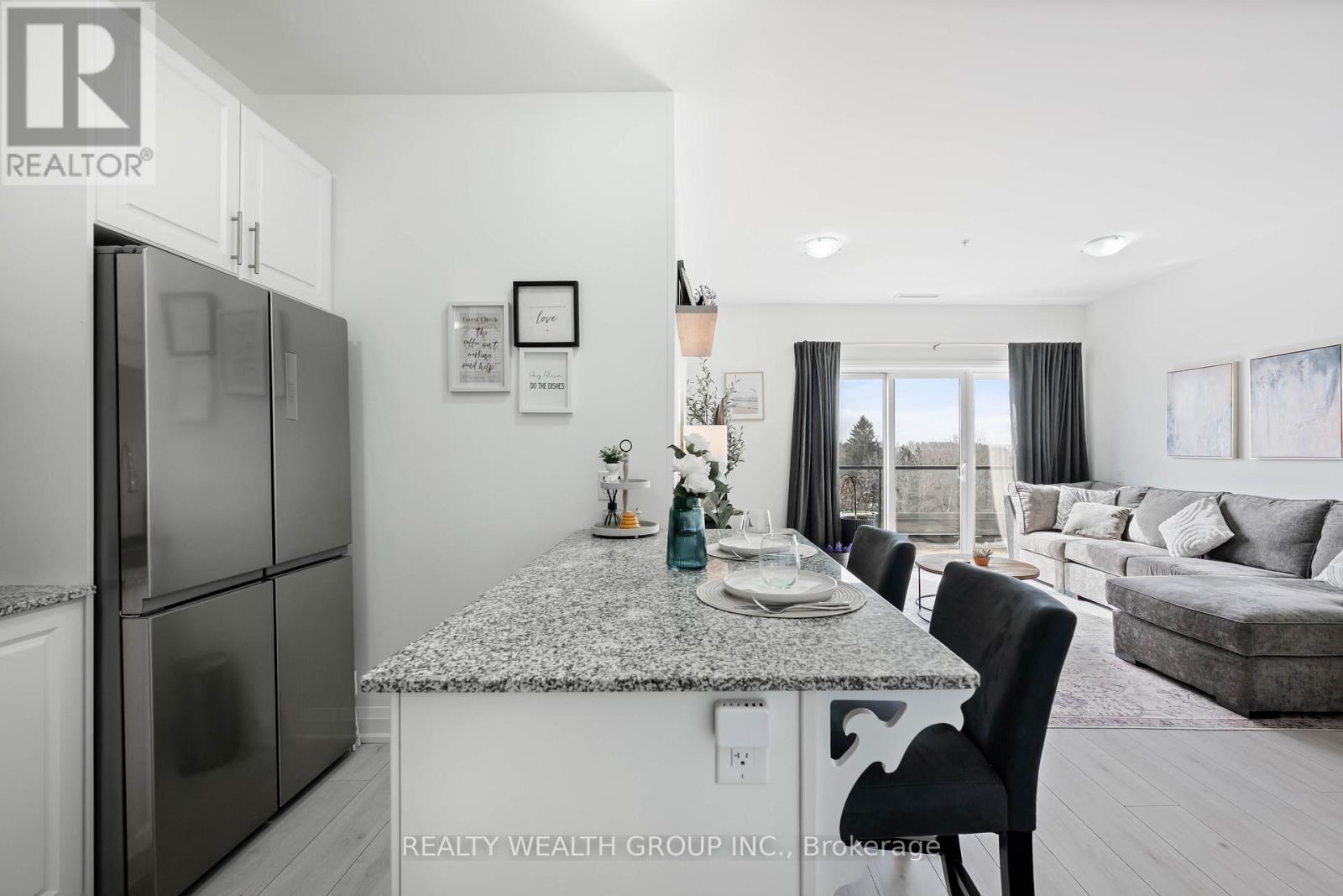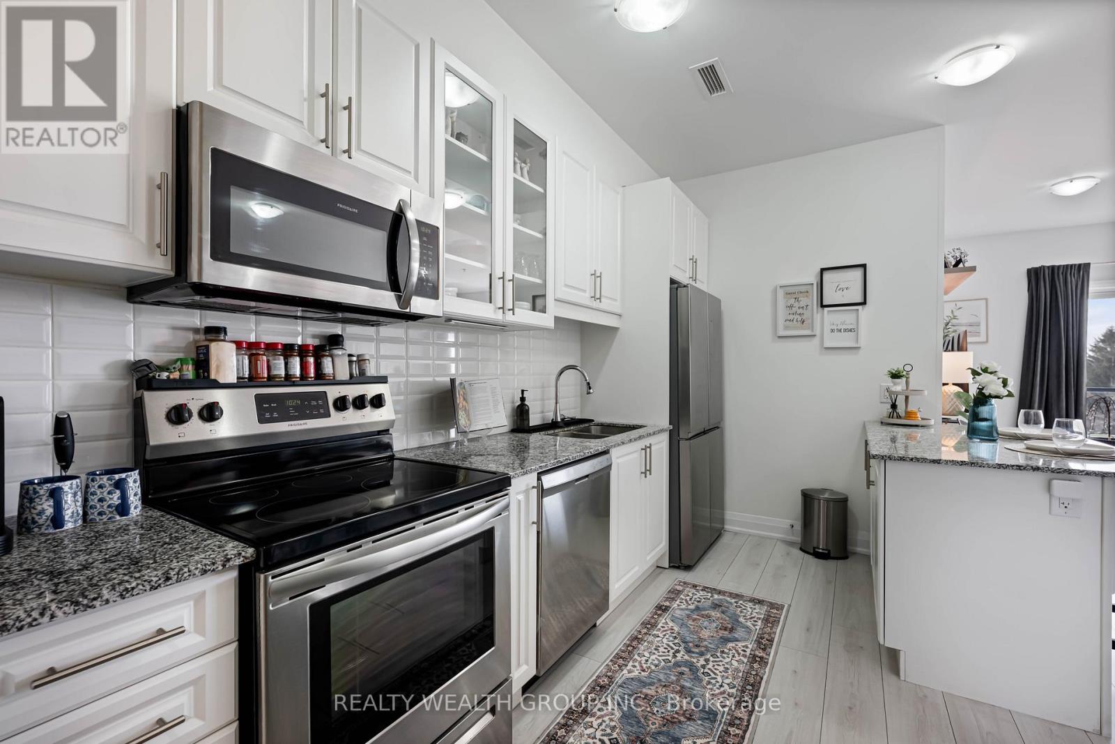 Welcome to penthouse living at its finest in the highly sought after Vista Blue Community. This stunning 1-bedroom, 2 bathroom condo offers 990 sq' of bright, beautifully maintained living, with an unobstructed view of the Tottenham Conservation / Pond! Step inside and be greeted by soaring 10ft Flat ceilings and an open concept layout designed for both comfort and style. The modern kitchen features elegant granite countertops, extended upper cabinets, 60" kitchen Island, SS appliances and ample space for cooking and entertaining. The spacious bedroom includes his & hers double closets and easy access to a spa-inspired bathroom complete with a custom floor to ceiling glass walking in shower! This thoughtfully upgraded unit includes a $5000 water filtration system and on demand hot water tank, ensuring convenience and peace of mind. Enjoy your morning coffee or unwind under the stars on your private balcony, complete with a BBQ gas hookup! This unit is perfect for taking in the sunsets!! offering a perfect blend of nature, luxury and convenience ! Additional features include exclusive underground parking space and locker, steps to a vibrant plaza and access to the Caledon Trail for walking and biking!! minutes to the 400 hwy!! Condo fee includes, Heat, Water, Parking, common Elements (id:64974)