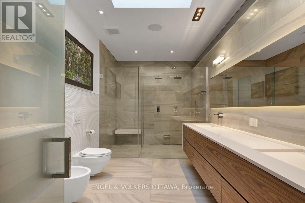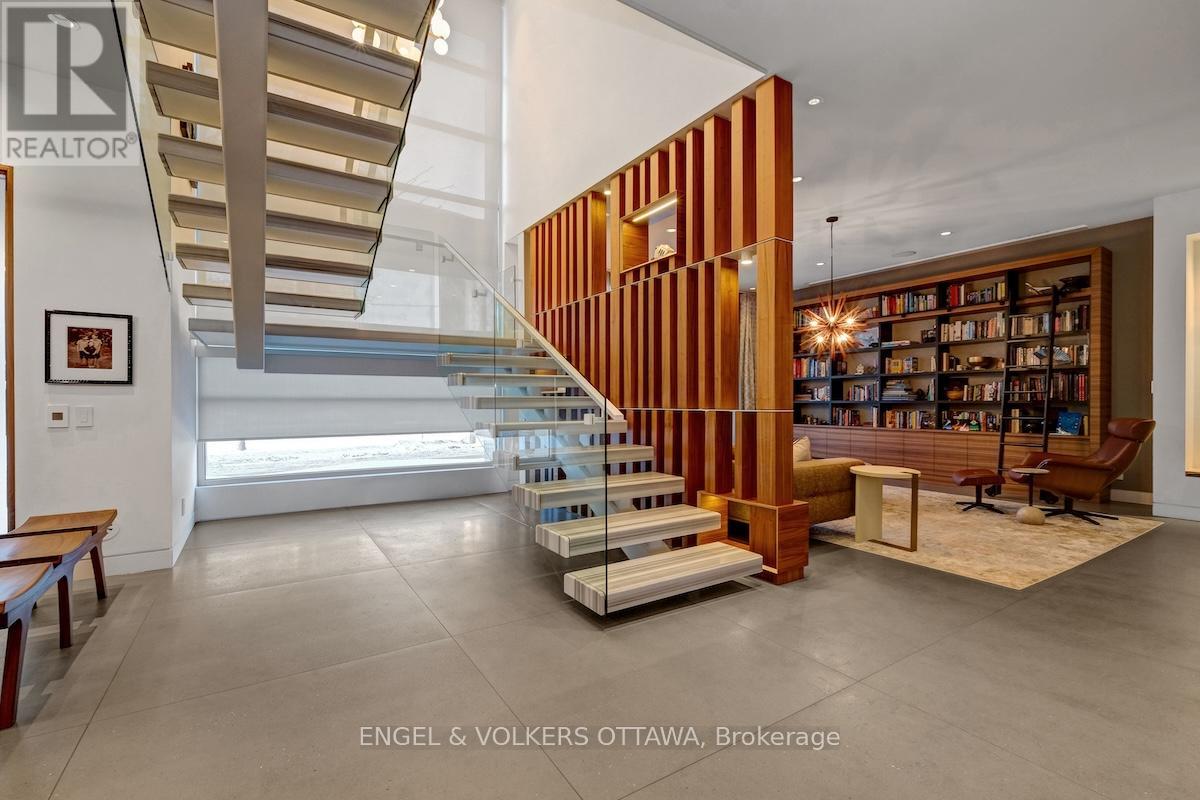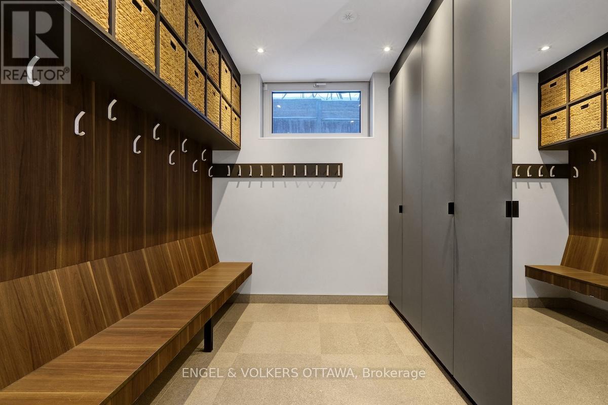 An exceptional contemporary residence in the heart of Westboro, offering over 4,400 square feet of architectural intention and elevated comfort across three levels. Custom built and professionally designed, with an exemplary standard of craftsmanship throughout, every element has been carefully considered. Clean lines, generous scale, and carefully selected finishes define the interior, beginning with a light-filled main level framed by 10-foot ceilings, oversized porcelain tile floors and floor to ceiling windows illuminating the marble encased floating staircase. The linear gas fireplace subtly delineates the living and dining areas while also serving as a sculptural centrepiece. Custom millwork forms a bespoke library wall introducing depth and architectural interest to the main living space. The kitchen is a statement in contemporary design and performance, featuring custom European-inspired cabinetry, integrated professional-grade appliances, an expanded island, and a thoughtfully curated coffee and beverage station. Clean sight lines, concealed hardware, and seamless storage solutions reinforce the home's tailored, minimalist aesthetic. The primary suite offers a quiet retreat with custom walnut built-ins and a five-piece ensuite that includes a skylight, curbless glass shower with wet and dry zones, and an extended floating double vanity. Secondary bedrooms are well proportioned, and a home office with private balcony provides flexible space for work or study. The lower level is designed for everyday use and flexibility, offering a versatile recreation area, ideal for fitness enthusiasts, a full bathroom, and a well-organized laundry room with built-in storage and folding surfaces. A custom mudroom with integrated cubbies provides direct access to the oversized heated garage, reinforcing a practical and well-resolved layout. Located just steps from river pathways, cafes, and boutiques in one of Ottawa's most walkable neighbourhoods. (id:64974)