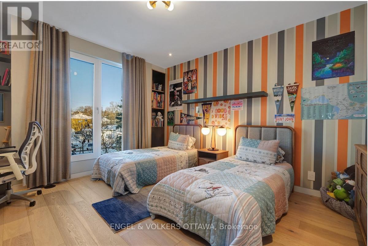 An exceptional contemporary residence in the heart of Westboro, offering over 4,400 square feet of architectural intention and elevated comfortacross three levels. Custom built and professionally designed, with an exemplary standard of craftsmanship throughout, every element has beencarefully considered. Clean lines, generous scale, and carefully selected finishes define the interior, beginning with a light-filled main level framedby 10-foot ceilings, oversized porcelain tile floors and floor to ceiling windows illuminating the marble encased floating staircase. The linear gasfireplace subtly delineates the living and dining areas while also serving as a sculptural centrepiece. Custom millwork forms a bespoke librarywall introducing depth and architectural interest to the main living space. The kitchen is a statement in contemporary design and performance,featuring custom European-inspired cabinetry, integrated professional-grade appliances, an expanded island, and a thoughtfully curated coffeeand beverage station. Clean sight lines, concealed hardware, and seamless storage solutions reinforce the home's tailored, minimalist aesthetic.The primary suite offers a quiet retreat with custom walnut built-ins and a five-piece ensuite that includes a skylight, curbless glass shower withwet and dry zones, and an extended floating double vanity. Secondary bedrooms are well proportioned, and a home office with private balconyprovides flexible space for work or study. The lower level is designed for everyday use and flexibility, offering a versatile recreation area, ideal forfitness enthusiasts, a full bathroom, and a well-organized laundry room with built-in storage and folding surfaces. A custom mudroom withintegrated cubbies provides direct access to the oversized heated garage, reinforcing a practical and well-resolved layout. Located just stepsfrom river pathways, cafes, and boutiques in one of Ottawa's most walkable neighbourhoods. (id:64974)