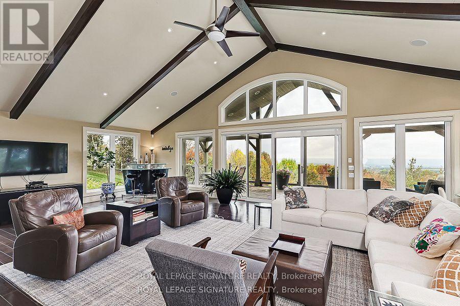 A Nature Lovers and Gardeners Paradise! 50 acres of fields and woods with a spectacular view over the Beaver Valley. Pesticide free farming for over 50 years. Property abuts the Bruce Trail, and several kilometers of private trails developed in co-operation with adjacent landowners, used for hiking, horseback riding and cross-country skiing. Water, free of sulphur and iron, is from an artesian spring, shared with a neighbour, with uninterrupted flow for over a century. In the spring, watercress from the creek and wild leeks from the woods herald the growing season. The house itself, with over 3500 sq.ft and 5 bedrooms, is surrounded by perennial garden beds, a large vegetable plot, a garden shed and a hot tub. Rebuilt in 2007, it has a 2-car built-in garage, essential during the winter months. The Great Room, is dominated by a two-sided field stone fireplace, and a 15 ft cathedral ceiling. It affords views over the valley and of spectacular sunsets. Beyond the separate dining room, is a glass-enclosed insulated sunroom, usable year-round. For multi-generational living, a design has been included in the attachments for construction of a self-contained one-bedroom flat, with access to the Great Room and separate exterior access over an extended garage. For added security, a 12kw propane generator starts automatically in case of a power failure. The Property blends privacy with exclusive on-site recreational opportunities and proximity to needed supplies and home-made bread and pies at the nearby popular Ravenna Country market. The 12th Line has little traffic, not being a through road, however it is on the school bus route and and receives early morning snow-ploughing in the winter. The present owners hope the new owners will enjoy life on this unique property as much as they have for almost 50 years! (id:64974)