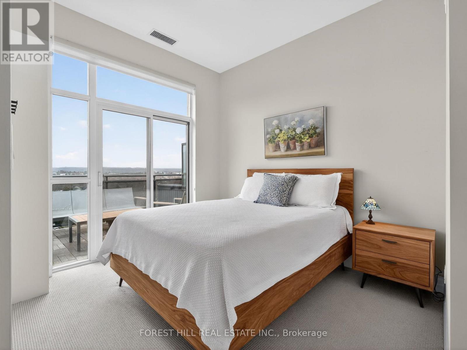 Stunning penthouse 2-bedroom, 2-bathroom residence, offering sought-after western exposure with breathtaking views over park and greenery. Located in the desirable Ridgewood 2 Condominium, this unit combines luxury finishes with functional design. Features include granite countertops, under-mount cabinet lighting, a custom granite desk, and a spacious kitchen complemented by 10-foot smooth ceilings. Enjoy seamless indoor-outdoor living with a private 251 sq ft balcony spanning the entire unit, complete with three separate access doors, gas line BBQ hookup, decking cover, and awning-perfect for relaxing or entertaining while taking in the sunset views Enjoy an exceptional lifestyle at Ridgewood 2 Condominium, offering premium building amenities including a full-service concierge, saltwater outdoor pool, hot tub, fully equipped fitness centre, party/meeting room, guest suite, and convenient pet spa. Ideally situated within walking distance to the GO Station, scenic walking trails, senior centre, shopping, theatre, and a variety of restaurants, this location combines comfort, convenience, and vibrant community living (id:64974)