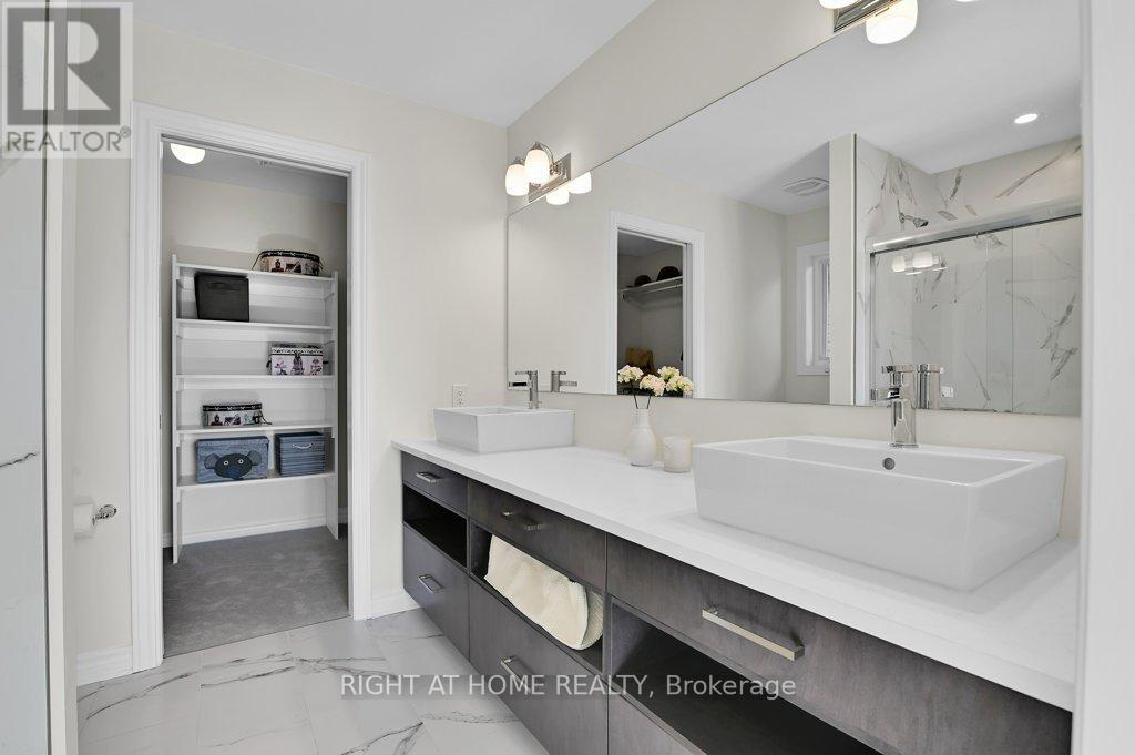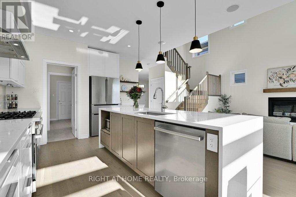 Welcome to a truly exceptional, newly built luxury home with over $100,000 in high-end upgrades-set on a premium lot backing onto a tranquil trail and pond. This is the kind of street where kids still play outside like the old days. With a rare walk-out basement and nature behind you, this home delivers the lifestyle buyers hope for, but rarely find.At the heart of the home is a chef-inspired gourmet kitchen-an absolute showpiece designed for everyday living and entertaining. Enjoy exquisite Caesarstone quartz countertops, custom white thermo-glossy cabinetry with bifold flip-up uppers, soft-close drawers, select hardwood maple details, a gas cooktop, a double-sink island, and a walk-in pantry that keeps everything beautifully organized. The living and dining spaces are dramatic and welcoming, flooded with natural light and anchored by soaring 18-foot ceilings. Rich 6" oak hardwood and upgraded tile run throughout, complemented by real oak staircases that add warmth and architectural impact. Custom built-in ceiling speakers complete the ambiance-perfect for intimate evenings, family movie nights, and effortless entertaining.Upstairs, you'll find three generously sized bedrooms plus a massive bonus room-ideal for two people working from home, a playroom, or a second lounge space. The primary suite feels like a retreat, featuring a large walk-in closet and a spa-inspired ensuite with his-and-her sinks and a glass-enclosed ceramic shower. Monthly POTL fee: $122.Notable upgrades and investments:Walk-out basement: $45,000; Kitchen and bathroom upgrades (flip-up cabinets, upgraded drawers, white MDF, maple island details, waterfall quartz,upgraded ensuite cabinetry and counters): $20,000O; oak staircase (basement to second floor): $11,0006"; oak flooring and upgraded tile: $9,200; Ceiling speakers + electrical/mechanical upgrades: $3,500; Doors and closet door upgrades: $2,500; Extra basement window: $1,000; (id:64974)