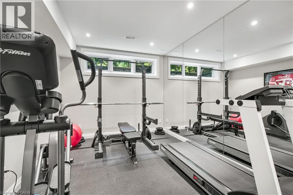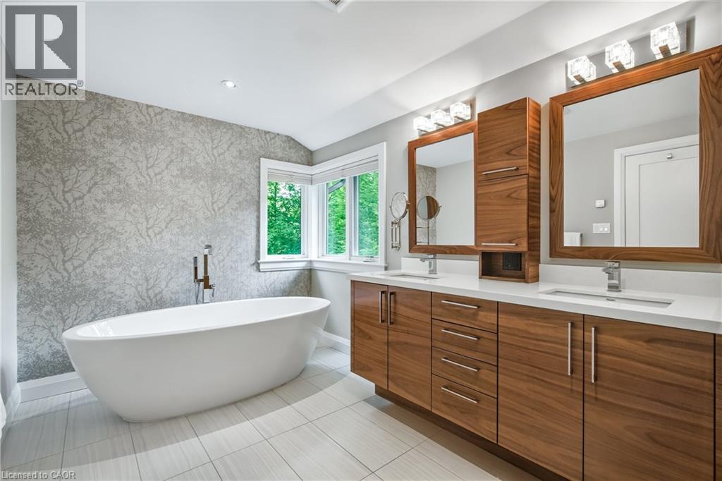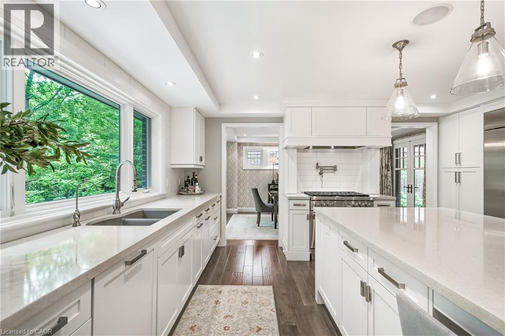 Welcome to unparalleled luxury and sophistication. With meticulous attention to detail throughout, this is an extraordinary opportunity for the discerning buyer who values precision, quality & timeless design. Nestled in one of the city’s most prestigious enclaves & backing onto the Royal Botanical Gardens Forest, this 5 bedroom, 5 bathroom residence offers over 4,100sqft of refined living where natural beauty meets exceptional craftsmanship. Every element has been thoughtfully curated from hand-selected finishes to custom millwork. The main floor features a gourmet chef's kitchen outfitted with Wolf, Sub-Zero, and Miele appliances, generous prep space, a large island with seating, & an open layout that flows seamlessly into the living and dining area all framed by enchanting forest views. Additional main floor highlights include an executive office with a separate entrance to a covered porch, a spacious mudroom with heated floors, custom cabinetry & direct access from the tandem double-car garage. Upstairs, the serene primary suite is a true retreat, complete with a gas fireplace, spa-inspired ensuite with heated floors & a walk-in closet. A second-floor laundry room with heated floors, along with heated flooring in every bathroom, adds comfort & convenience throughout. The lower level is equally impressive, featuring a guest suite, gym, rec/media room, kitchenette, rough-in for laundry & a separate entrance all enhanced with heated flooring. Step outside & enjoy thoughtfully designed outdoor living spaces that invite you to unwind & connect with nature. Multiple seating areas & professionally landscaped gardens provide the perfect setting for al fresco dining, morning coffee, or evening gatherings all set against the peaceful backdrop of the forest. This is a rare opportunity to experience true tranquility and connection to nature without compromising access to the city’s finest amenities. (id:64974)