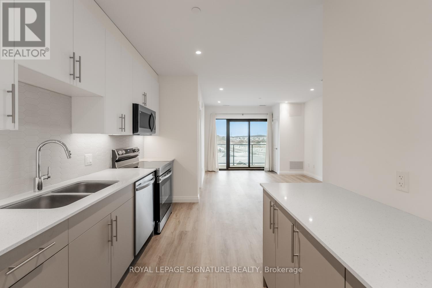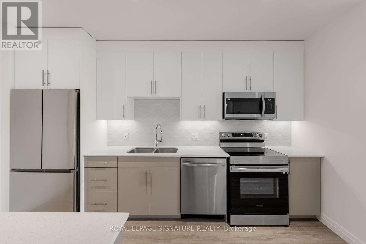 Forget the shovels! Welcome to The Flats at Rainbow Lake- one of Kitchener's best kept secrets. Set within a private lakeside conservation enclave, this stunning 2 bedroom, 2 bathroom suite offers 912sqft (+92sqft balcony) of carpet-free living plus 1 parking space. The bright white kitchen features quartz countertops, stainless steel appliances, sleek backspash and valance lighting, blending modern elegance with everyday funtionality. The Scandinavian-inspired finishes extend from the unit and throughout the building, which is situated on 4.4 acres of lakeside property and surrounded by over 45 acres of protected conservation land, including one of the oldest growth forests in Southwestern Ontario. Enjoy swimming, fishing, canoeing, scenic trails and tranquil lake views right outside your door. Amenities include a co-working space, library, games and party room, outdoor dining and BBQ areas, gym with sauna, bike storage, dog wash station and EV chargers. Ideally located with immediate access to Highway 401 and just moments from transit, shopping, dining and school. Fantastic opportunity to live where nature meets modern living. (id:64974)