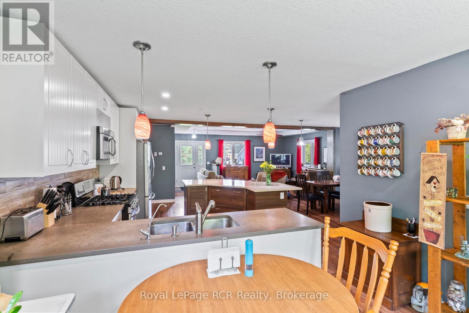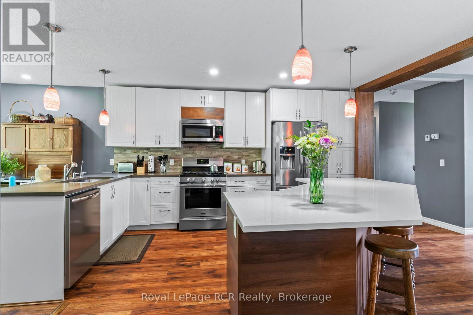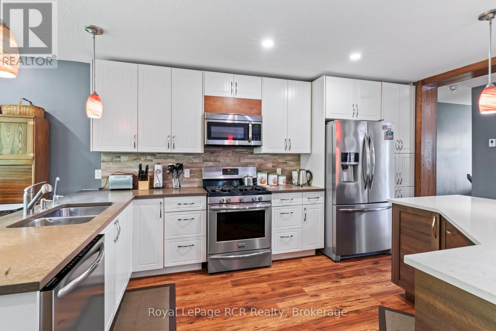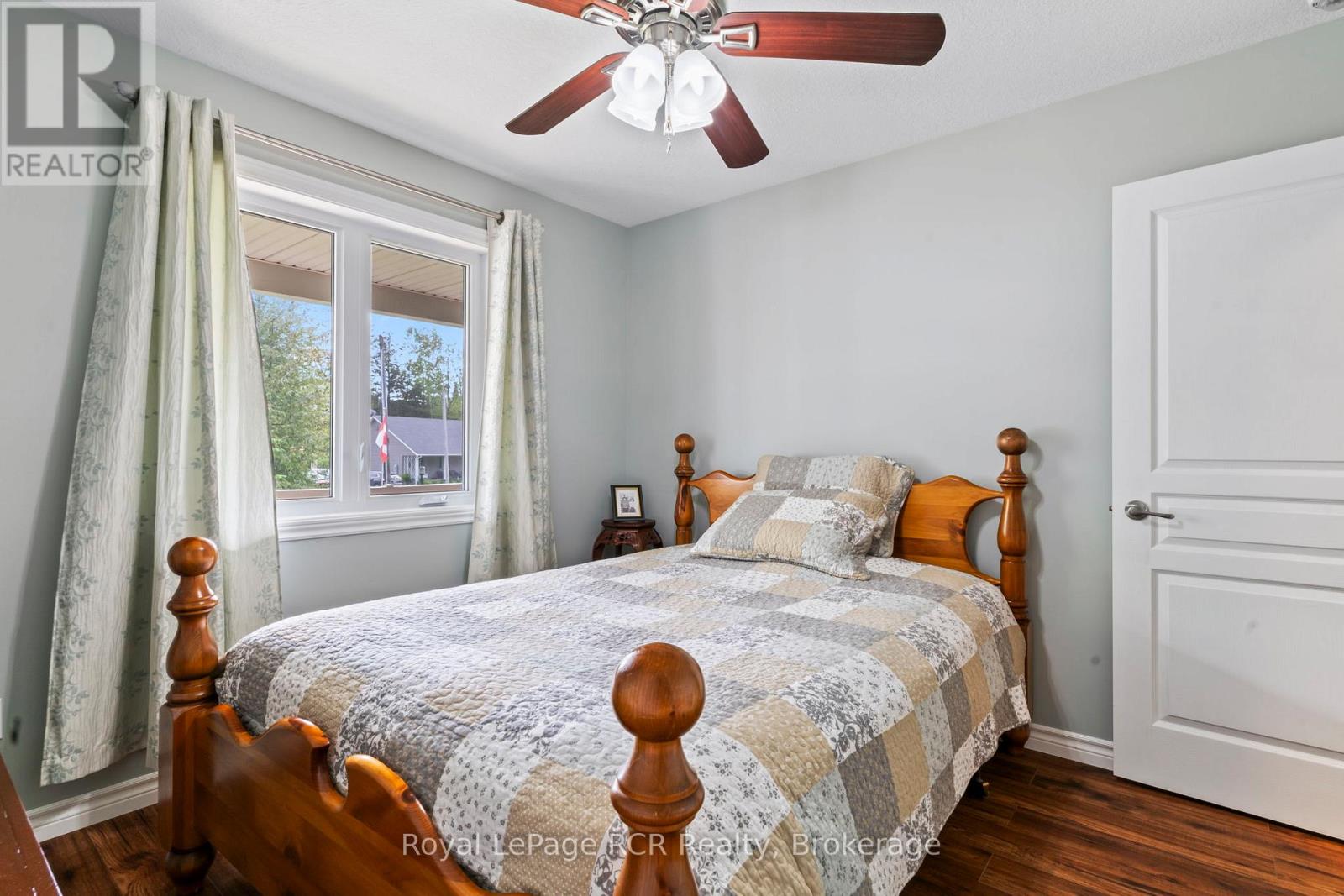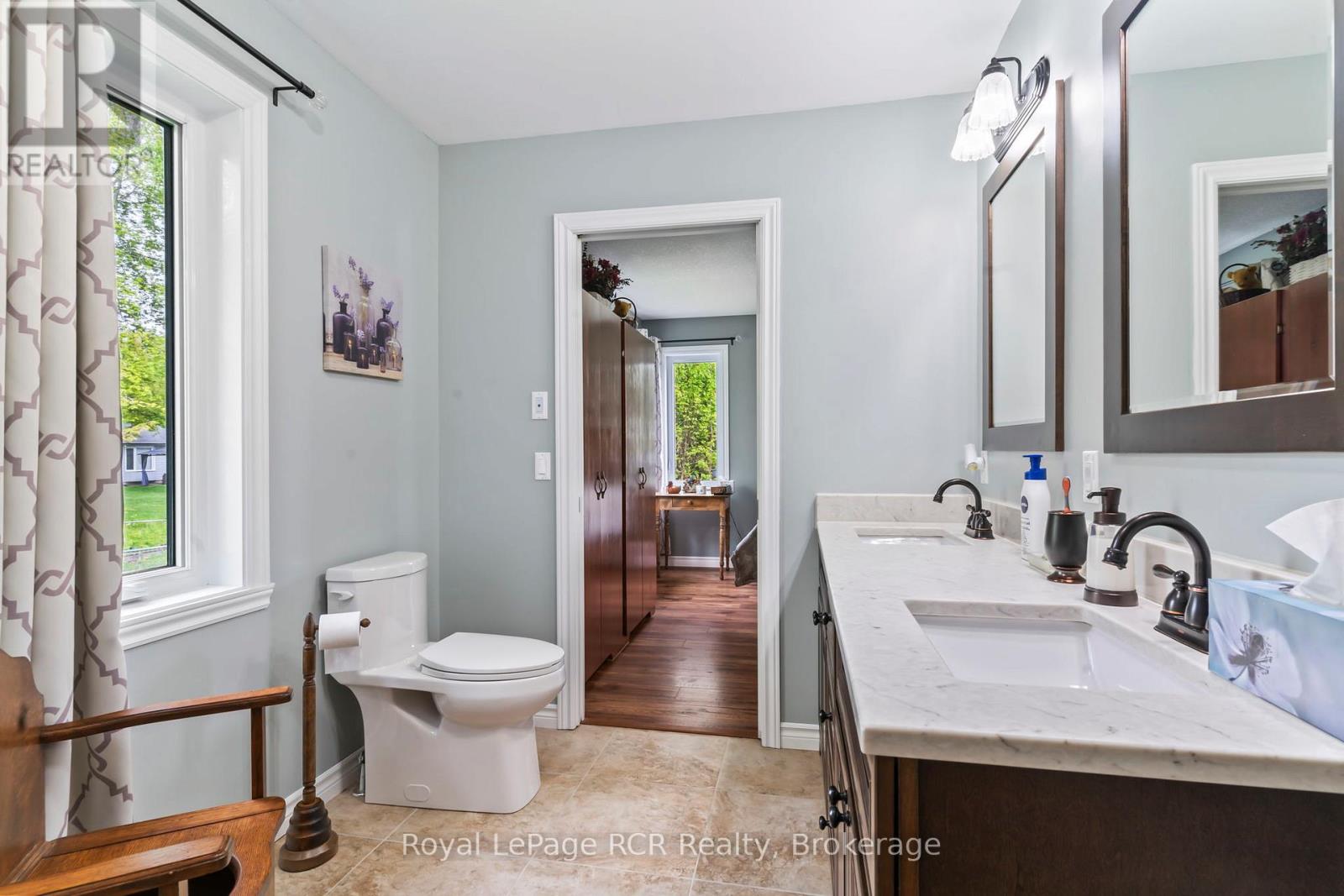 Welcome to this charming 3 bedroom bungalow located in the peaceful village setting of Point Clark. Situated on a dead-end cul-de-sac, this beautiful 8 year old home offers a serene and private setting, perfect for those seeking tranquility. Upon entering the home, imagine relaxing on the 130' of covered deck space, then you will be greeted by an open concept layout, creating a spacious & inviting atmosphere. The open kitchen, dining room, dinette and living room offer an entertainers delight. With an abundance of cabinetry, large working island with quartz and concrete countertops making it a chefs delight. Impressive ensuite bathroom with double sinks and large walk in shower, conveniently located off the primary bedroom with a large walk-in closet with custom made barn door. Added in 2025 was a split heat/air unit which will be a perfect for the summer heat. Whether you envision a home gym, a play area for the kids, or a cozy entertainment space, the full unspoiled basement provides ample room to bring creative ideas to life. For car or woodworking enthusiasts you will be pleased to know that this property includes a detached double car garage with an attached workshop. The home features in-floor heat throughout the main floor, basement and workshop. This additional space allows you to indulge in your hobbies or provides ample storage for your vehicles and equipment. The exterior of the house boasts immaculate landscaping, creating a visually appealing and well maintained curb appeal. The yard is thoughtfully designed, making it a perfect space for outdoor activities, gardening (which if fully fenced to avoid wild life) or simply to enjoy the fresh air. Another major bonus is the location to the beach/lighthouse and marina. Imagine taking leisurely strolls along the shoreline, enjoying the sunsets, and embracing the natural beauty mother nature surrounds you in. (id:64974)