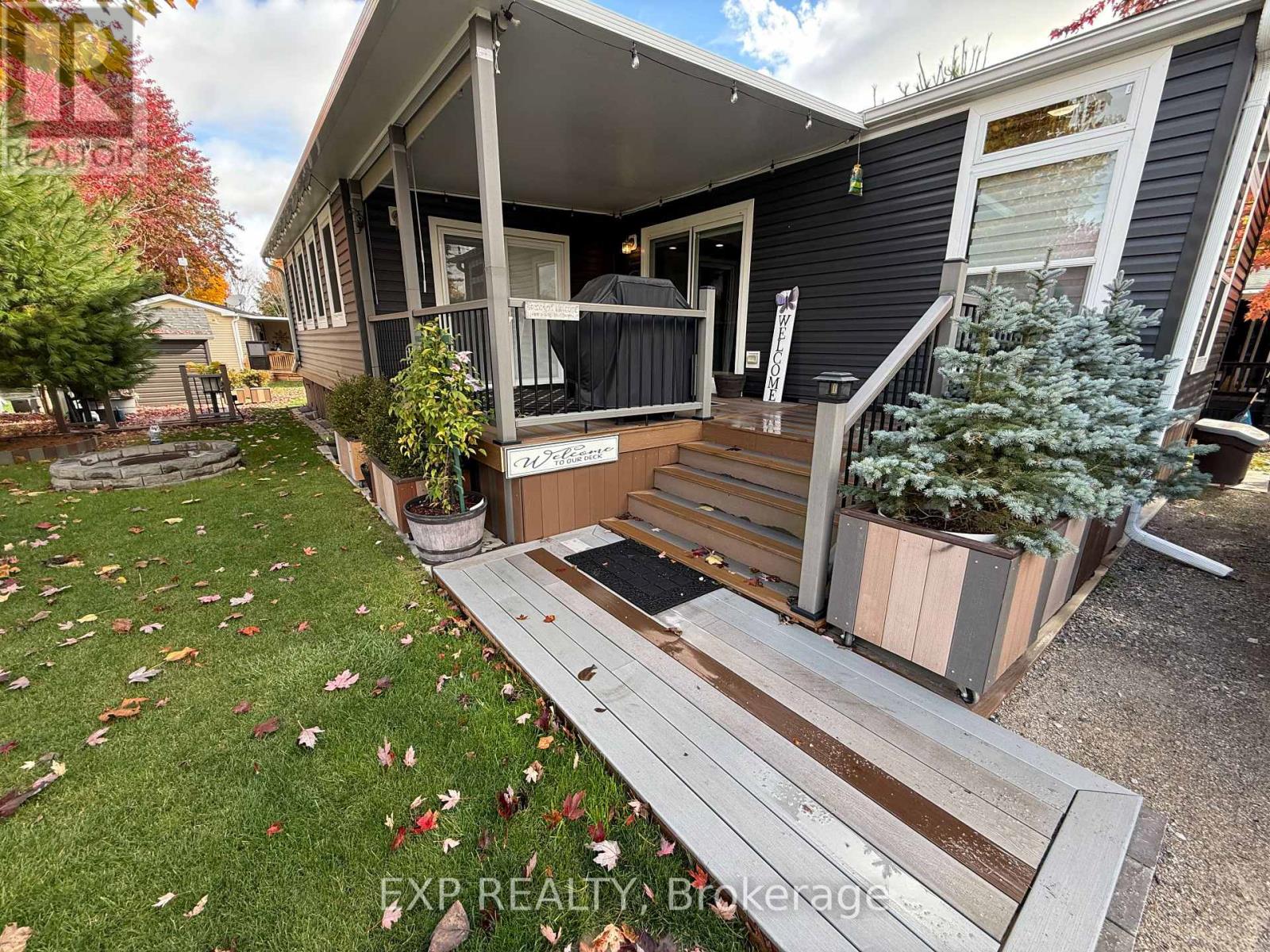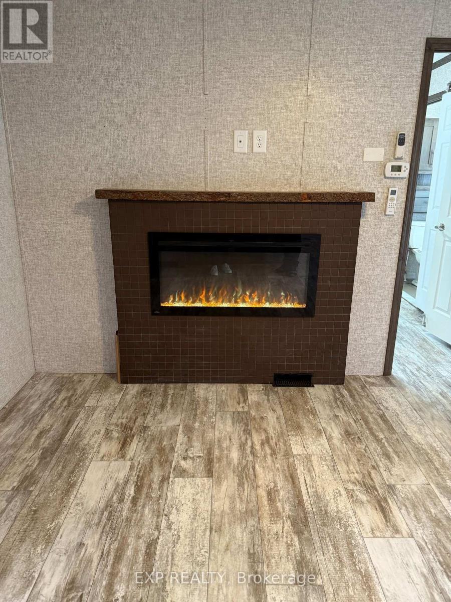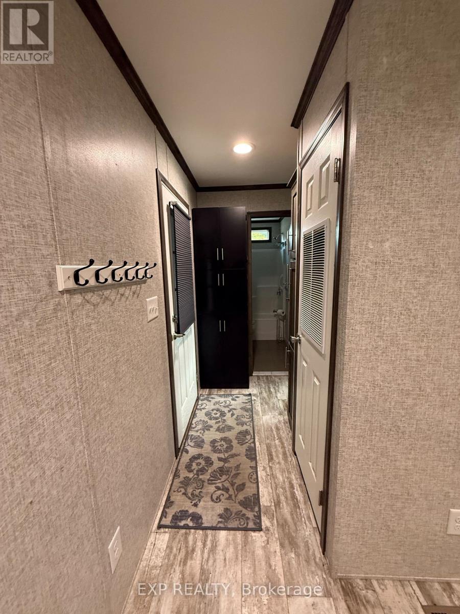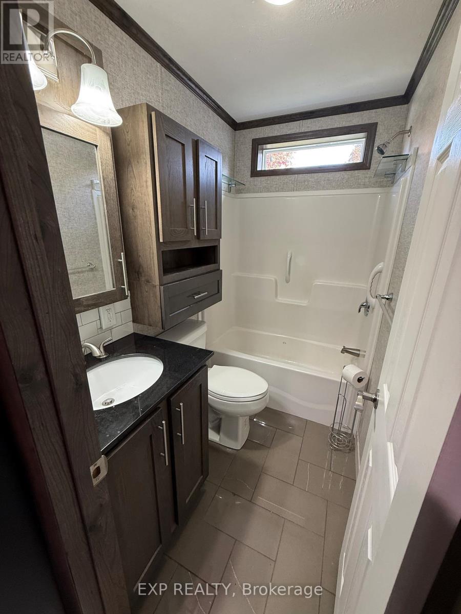 Located in 9 month section of award winning Happy Hills Resort. Gorgeous Custom Built 2021 Commodore Park Model with Additional Sunroom (16 x 42 and 12 x 20). 8ft ceilings throughout allow for extra large double hung windows and transoms. Zebra blinds on all. Eye catching composite deck and skirting with hard top coverage. Sunroom also has composite flooring with loads of added storage, 3 ft windows and pendant lighting. Open concept kitchen has new fully upgraded stainless steel appliances including a higher end gas stove with air fryer and grill, fridge with ice cube maker, a dishwasher, microwave and farm house sink. Solid oak cupboards, and pull out drawer storage including unique pull out storage in "dead space corner". Cupboards are pulled over the fridge and gabled. 3 Stage Home Filter System and higher particle filter for kitchen sink and ice maker. Electric Fireplace in the living room. Both bathrooms have granite vanities and marble flooring. Built in dressers and extra storage in the master bedroom. The laundry is located in the closet in the second bedroom. Both bedrooms fit king size beds. Cement pad and insulated spray foam under both modular and sunroom. 7 x7 shed with hydro. BBQ included on front deck and there is another composite deck off the back door. Lovely castor planters with Blue Spruce in front. Newer lawn mower stays. A truly beautiful location with a large heated family swimming pool, children's splash pad, heated adult's only swimming pool, a 9 hole golf course and driving range, Bocce Ball, Lighted Tennis court, Pickleball, Volleyball, Basketball, Shuffleboard, Horseshoe pits, Daily children's crafts/activities, hayrides, bingos, movies, special tournaments, mini animal farm, hiking trails, several playgrounds, lighted skateboard and bicycle activity center and more. Get in on this lovely lifestyle early! Contact listing agent for fees, deposit and occupancy requirements. 15 minutes to the 401and 10 minutes to amenities. (id:64974)