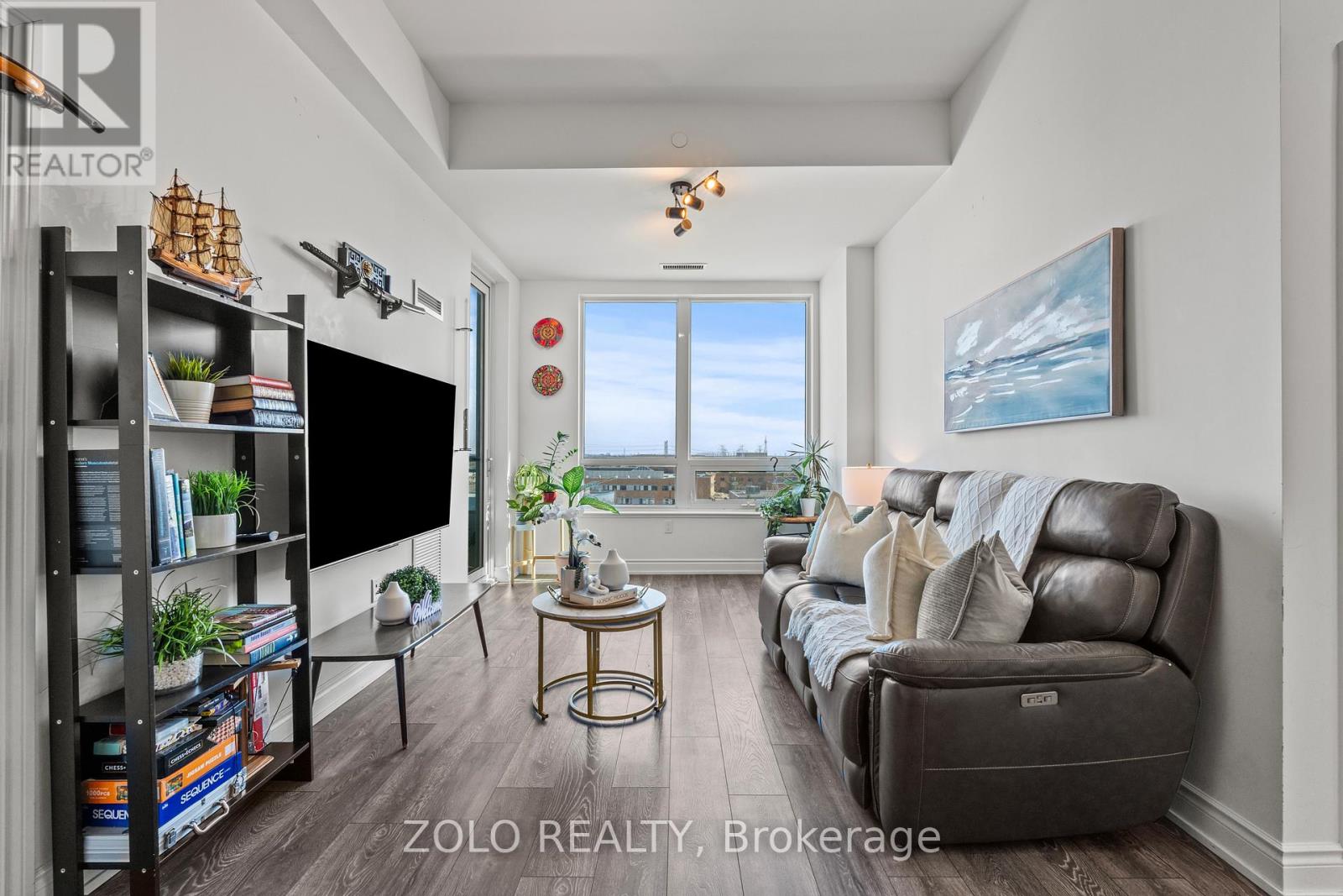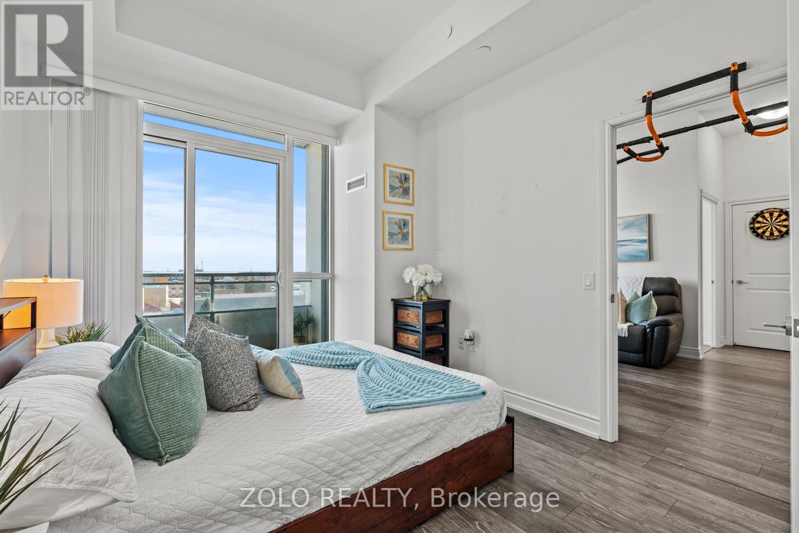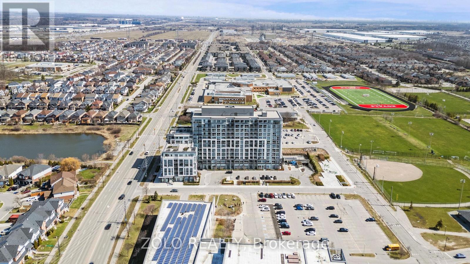 Picture this... It's Saturday morning, the coffee is brewing, sunlight is pouring through the oversized windows, and from your 6th floor balcony you're watching your kids' soccer game unfold at Lions Sports Park right below you. You didn't drive anywhere. You just stepped outside. This is life at Art on Main. Your family has outgrown the smaller apartment but you're not quite ready for the full detached commitment.. This beautifully appointed 2-bedroom + den gives you the space you actually need. Inside this 920+ sqft unit, you're greeted with 10-foot ceilings and beautiful open concept layout. The den has sliding doors and large enough to be a proper kids' bedroom or home office. One of the few units with the luxury of storage locker on the same floor so the stroller, the bikes, and the camping gear are all within reach. With one underground parking spot you never have to scrape windshields in January again! Come summer, the rooftop deck and outdoor pool become your backyard. The gym is downstairs when motivation strikes and when grandparents visit, guest suites mean nobody's sleeping on the pullout. Did your partner take the car today? Doesn't matter. You don't need it. Step outside and everything your family needs couldn't be closer. Milton Commons plaza is steps away. The Leisure Centre, Library, Lions Sports Park, and Bishop Reding are practically in your backyard. And when the city calls, the GO station is under 1km away. This is the chapter between where you were and where you're going. Your next home is waiting. *Virtual staging on balcony* (id:64974)