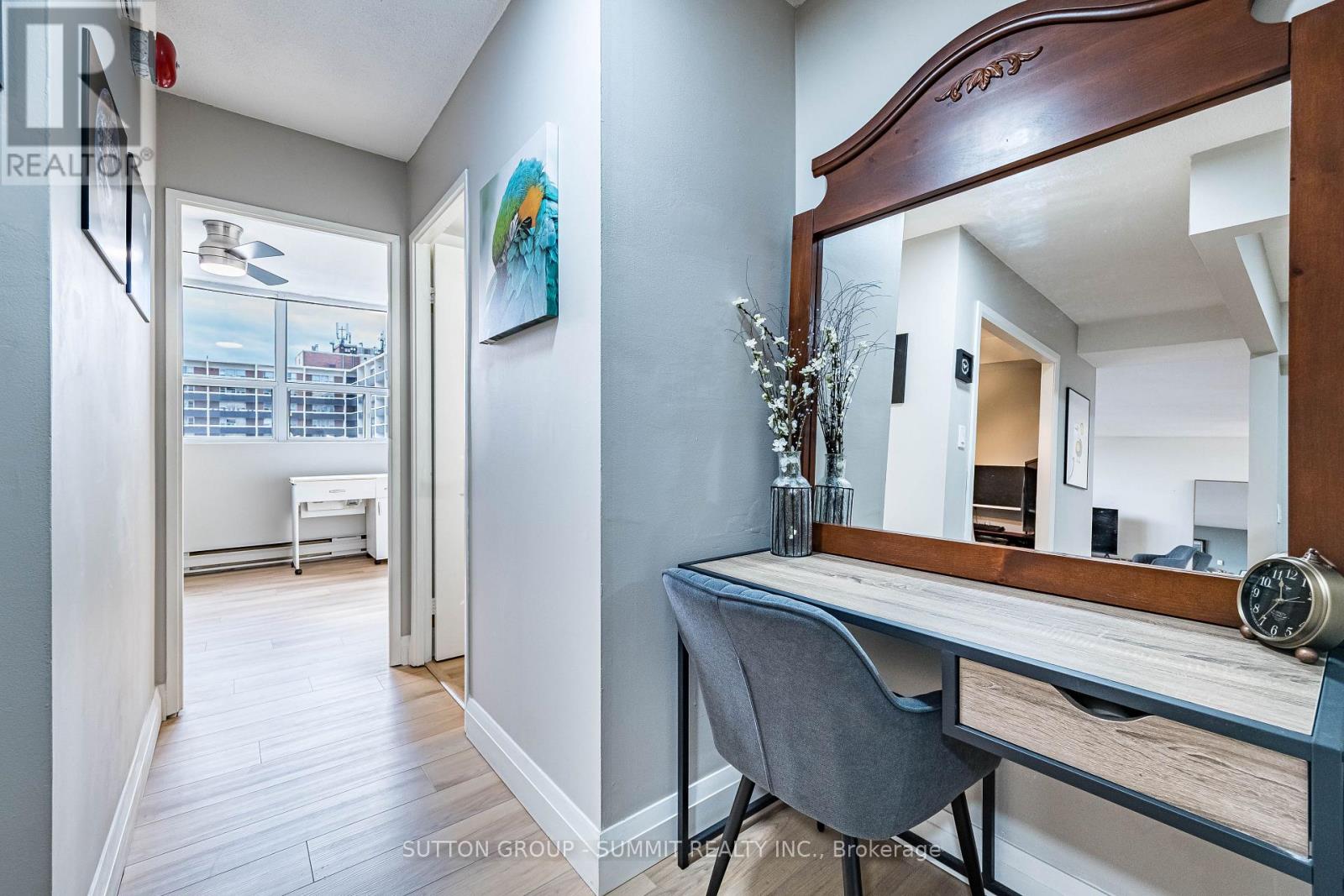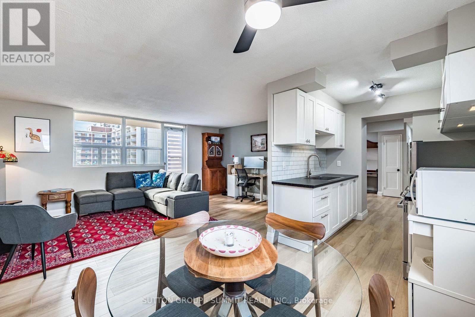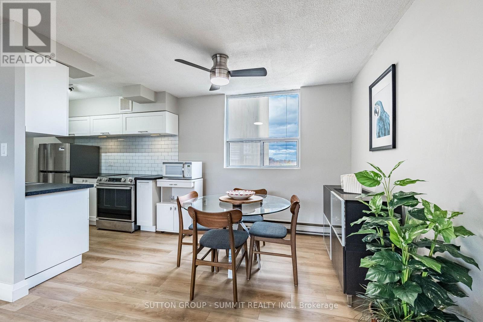 Beautifully Renovated & Move-In Ready! Located in The Empress, one of Burlington's most sought-after condominium communities. This oversized 1-bedroom + den suite is the largest one-bedroom layout in the building, offering over 1,000 sq. ft. of bright, open living space with east and west exposures - perfect for enjoying both sunrise and sunset views. Completely renovated in 2023-2024, this suite features new flooring and base boards throughout, freshly painted walls and ceilings, new doors, modern light fixtures, and ceiling fans. The custom kitchen shines with sleek cabinetry, extended counter space, and stainless steel appliances - ideal for cooking and entertaining. The updated bathroom offers a new tub, toilet, vanity, and elegant touch-light mirror for a spa-like feel. The bright living and dining area opens to a large private balcony, perfect for relaxing outdoors. The spacious bedroom includes two large double closets, while the versatile den is ideal for a home office. In-suite laundry and one underground parking space complete this exceptional home. Building Amenities include: 24-hourconcierge, outdoor pool, fitness centre, sauna, party room, library, car wash bay, workshop, barbecues, EV charging station, and ample visitor parking. Enjoy comfort, security, and convenience just steps from shopping, dining, transit, and the Burlington Centre Mall. (id:64974)
