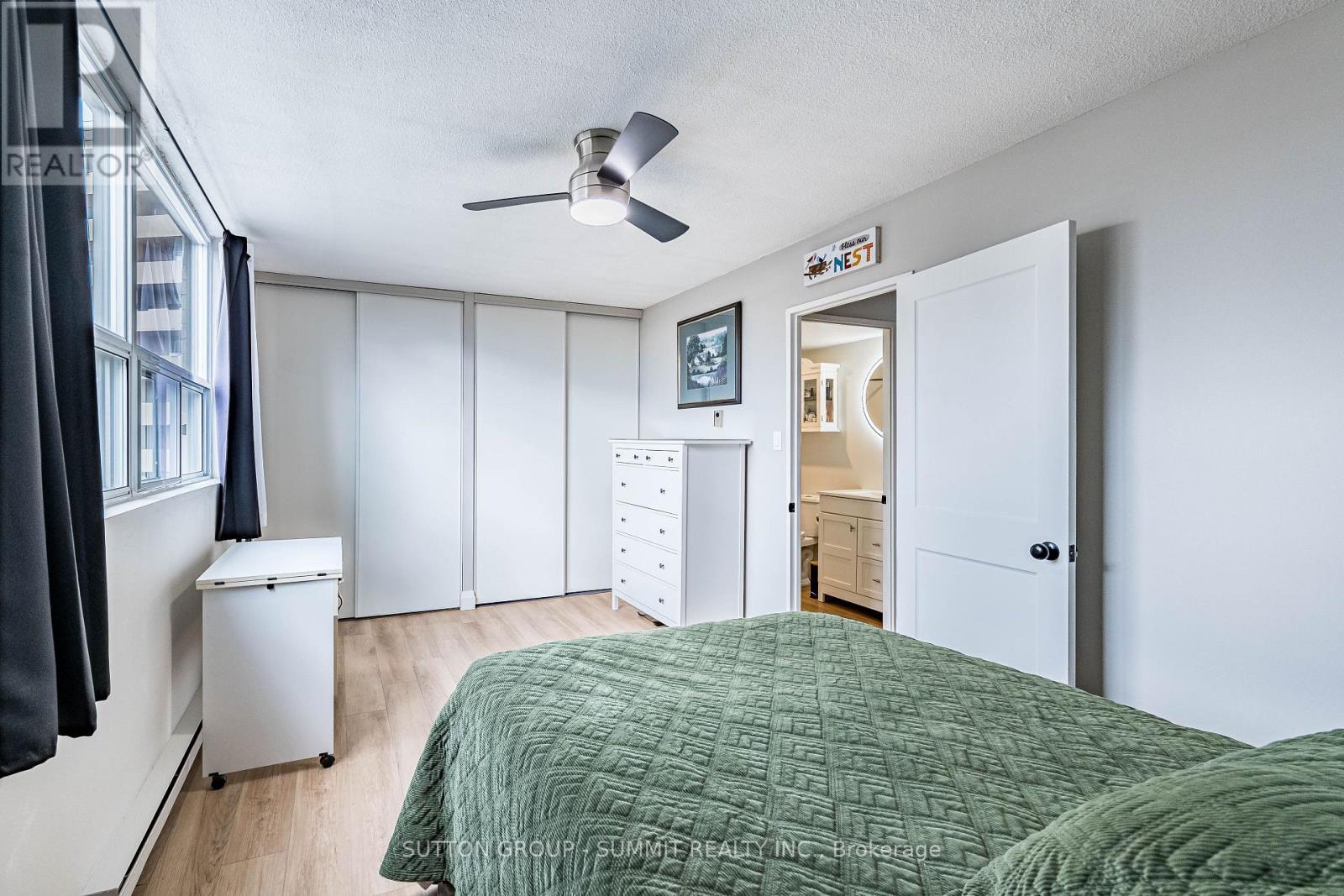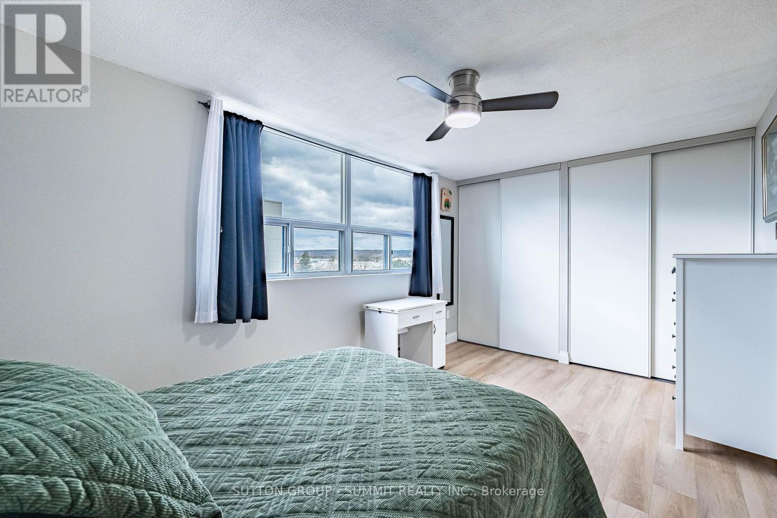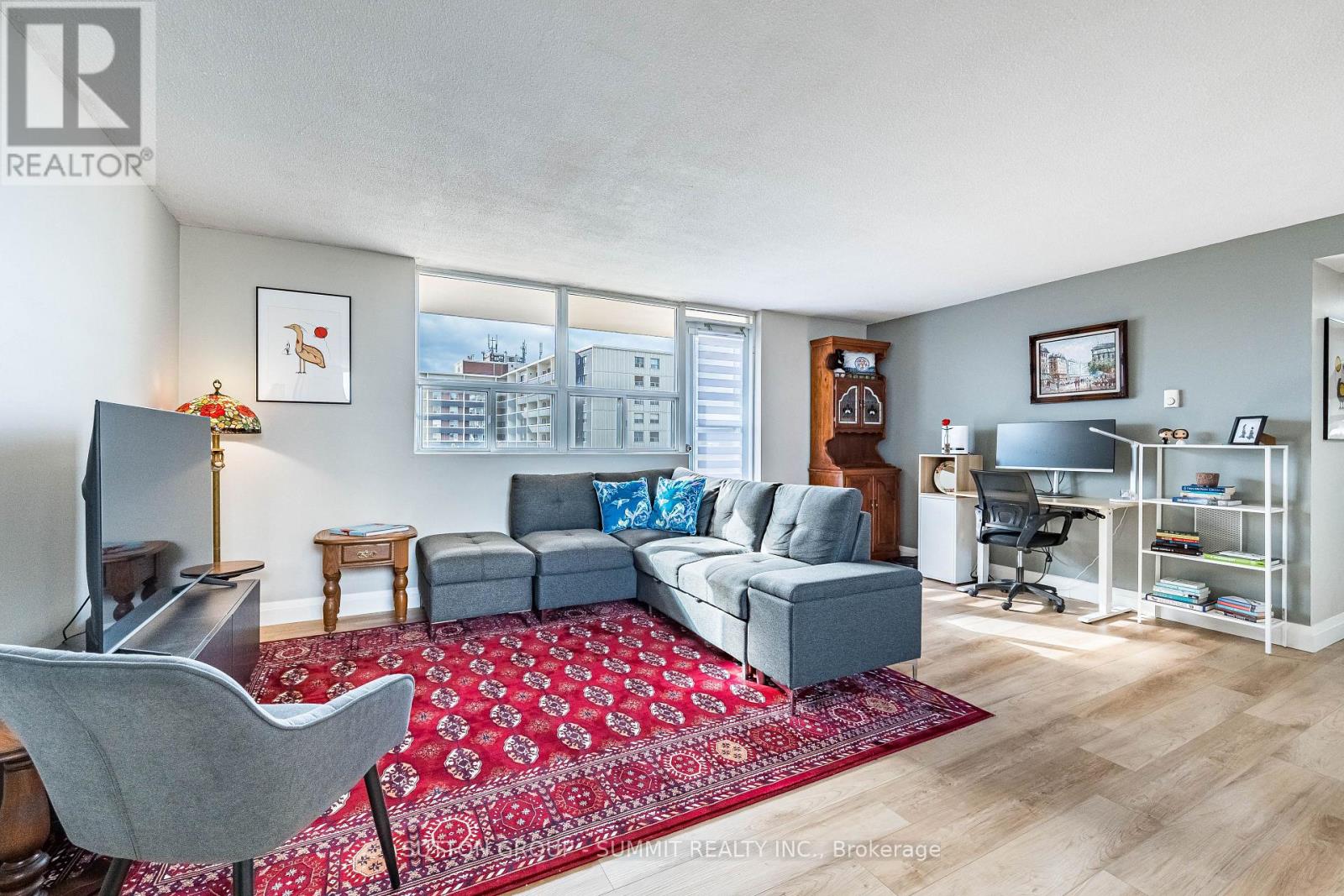 Beautifully Renovated & Move-In Ready! Located in The Empress, one of Burlington's most sought-after condominium communities. This oversized 1-bedroom + den suite is the largest one-bedroom layout in the building, offering over 1,000 sq. ft. of bright, open living space with east and west exposures - perfect for enjoying both sunrise and sunset views. Completely renovated in 2023-2024, this suite features new flooring and base boards throughout, freshly painted walls and ceilings, new doors, modern light fixtures, and ceiling fans. The custom kitchen shines with sleek cabinetry, extended counter space, and stainless steel appliances - ideal for cooking and entertaining. The updated bathroom offers a new tub, toilet, vanity, and elegant touch-light mirror for a spa-like feel. The bright living and dining area opens to a large private balcony, perfect for relaxing outdoors. The spacious bedroom includes two large double closets, while the versatile den is ideal for a home office. In-suite laundry and one underground parking space complete this exceptional home. Building Amenities include: 24-hourconcierge, outdoor pool, fitness centre, sauna, party room, library, car wash bay, workshop, barbecues, EV charging station, and ample visitor parking. Enjoy comfort, security, and convenience just steps from shopping, dining, transit, and the Burlington Centre Mall. (id:64974)