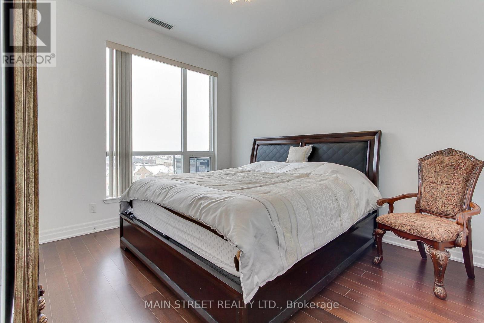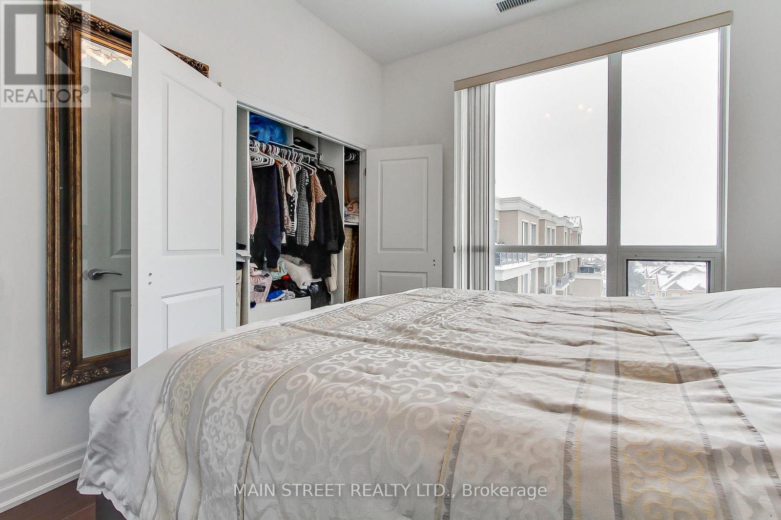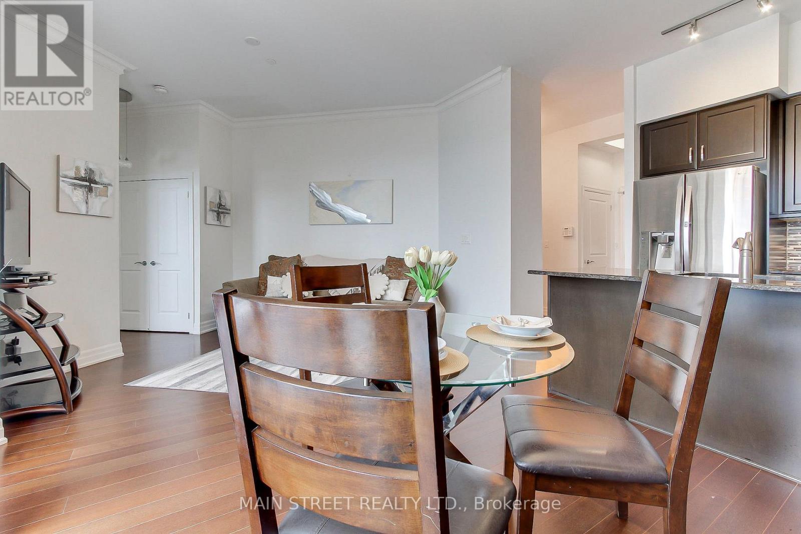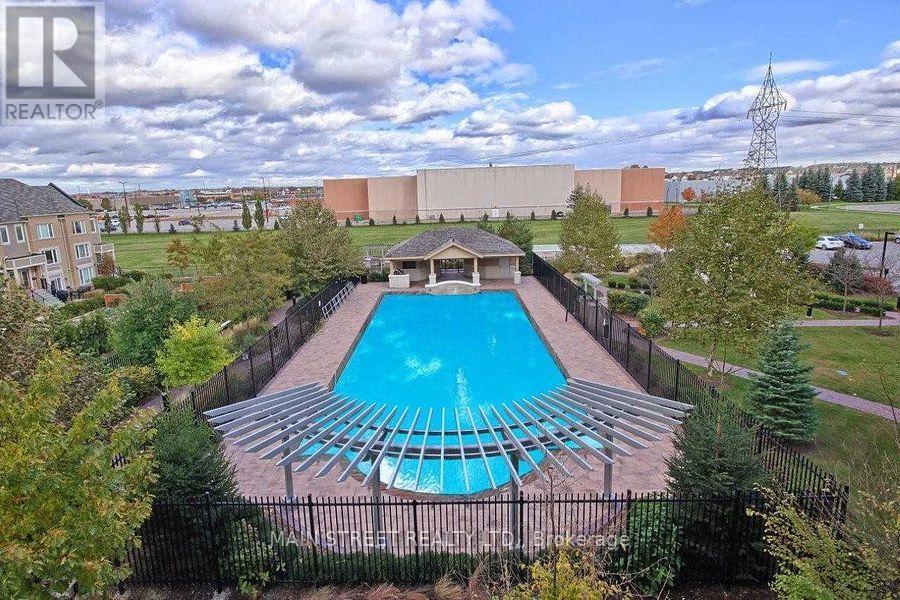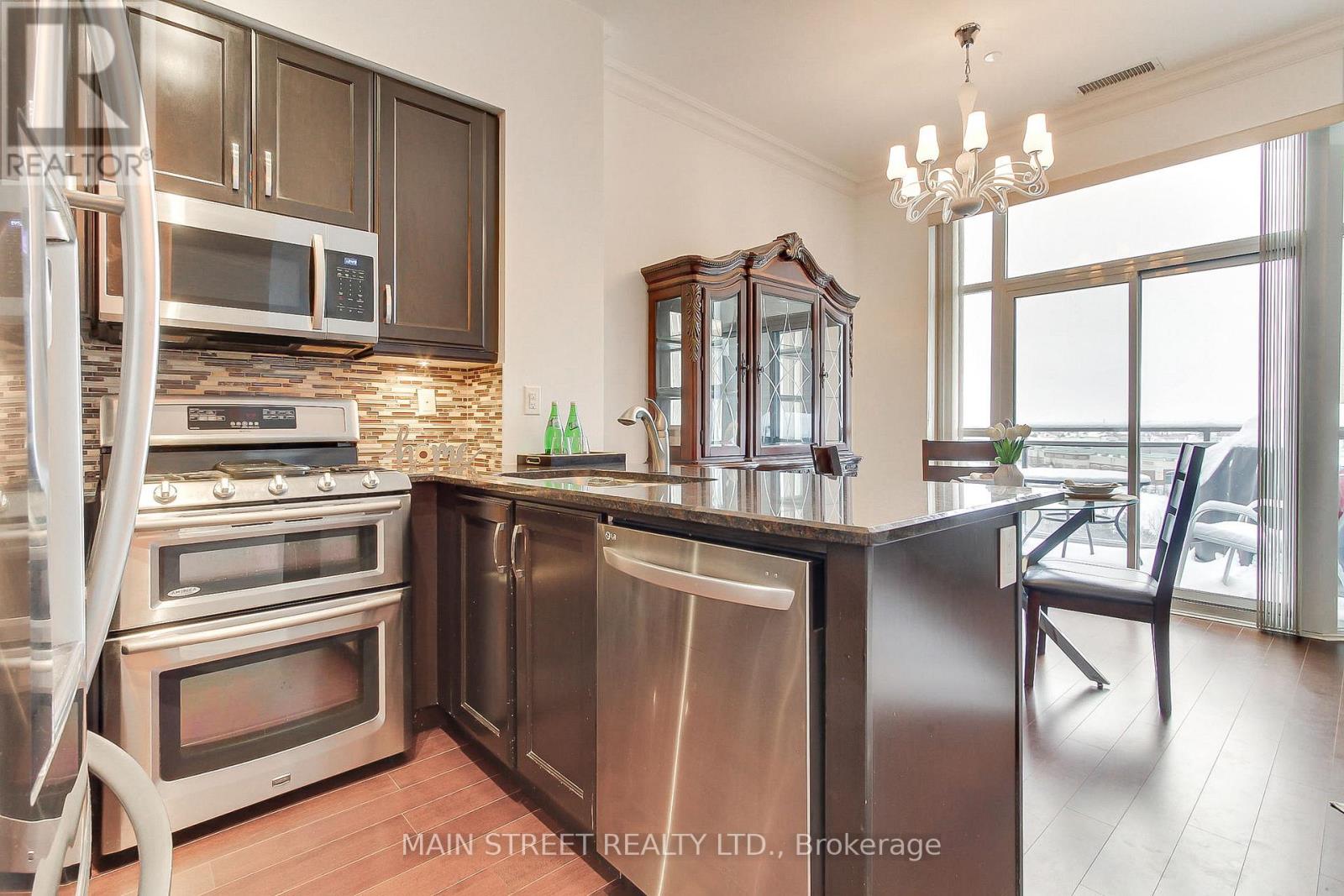 Welcome to this lovely, move-in-ready 1 Bedroom + Den penthouse in the highly sought-after Ridgewood Condo. This sun-filled suite features unobstructed east-facing panoramic views, offering breathtaking sunrises and an abundance of natural light through soaring 10' ceilings. The open-concept layout is both stylish and functional, showcasing granite countertops, stainless steel appliances, dark chocolate engineered flooring, and upgraded light fixtures. Enjoy a spacious primary bedroom, a versatile den ideal for a home office, and a spa-inspired 3-piece bathroom with a frameless glass shower. Additional highlights include crown moulding in the living and dining areas and convenient ensuite laundry with ample storage space. Step out onto your private balcony overlooking the beautifully landscaped grounds and saltwater outdoor pool the perfect spot for morning coffee or evening relaxation. This meticulously maintained building offers resort-style amenities, including: A tranquil library and media rooms, fully equipped fitness centre/spa, outdoor BBQ and lounge areas, dog spa, on-site concierge for added comfort and peace of mind. Ideally located within walking distance to schools, shopping, restaurants, parks, and public transit. A short drive to the Go station and 404 highway. Summer photos of surrounding building included. Thank you for showing! (id:64974)