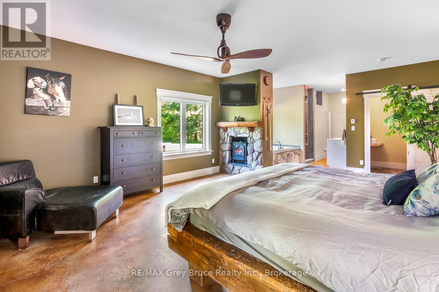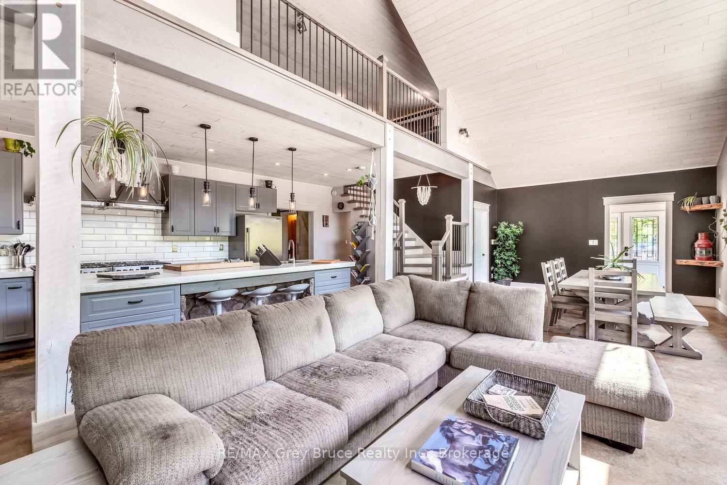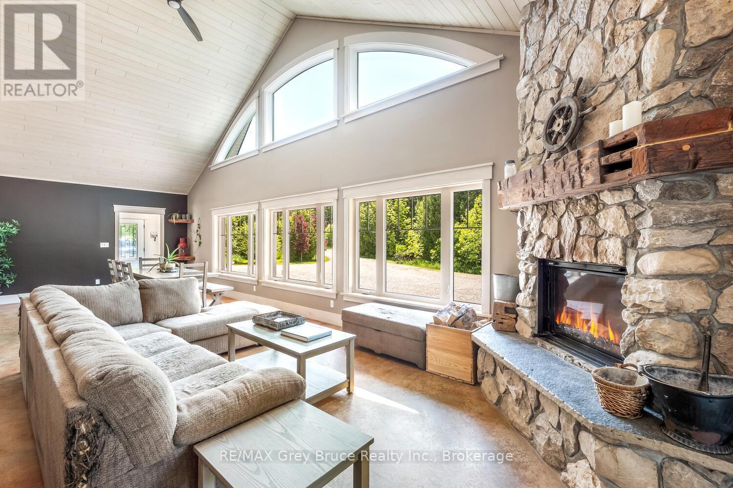 Elegance Meets Country Living on 24 Acres! Welcome to your private rural retreat just minutes from Tobermory. This exceptional country property offers the perfect balance of peaceful acreage living and convenient access to shops, amenities, recreation, and the stunning natural attractions of Northern Bruce Peninsula. Established in 2018, this custom 3-bedroom, 2.5-bath home offers approximately 2,760 sq. ft. of thoughtfully designed living space, ideal as a full-time residence, executive country home, or recreational getaway. The open-concept layout features soaring vaulted ceilings, expansive windows, and abundant natural light, creating a bright and inviting atmosphere for everyday living and entertaining. Designed with efficiency and comfort in mind, the home includes radiant in-floor heating and passive solar design for year-round energy savings. The chef-inspired kitchen is a standout feature with a large island, dual propane ranges, farmhouse sink, and custom concrete countertops - perfect for hosting family and friends. The spacious primary suite serves as a private sanctuary, complete with a spa-like ensuite featuring a soaker tub, walk-in shower, double vanity, separate water closet, and direct access to a covered deck with hot tub. A generous walk-in closet adds functionality and style. The upper-level loft provides flexible space for a home office, fitness area, studio, or additional living area. Outdoors, enjoy the freedom of 24 acres of land, ideal for hobby farming, gardening, or simply embracing nature. A fully heated, attached double garage offers year-round parking, workshop potential, or storage for recreational equipment. With direct access to snowmobile trails plus nearby hiking trails and water access, this property supports an active four-season lifestyle. An outstanding opportunity to own a modern rural home with acreage in a sought-after location - perfect for buyers seeking privacy, recreation, and investment in Bruce Peninsula real estate. (id:64974)