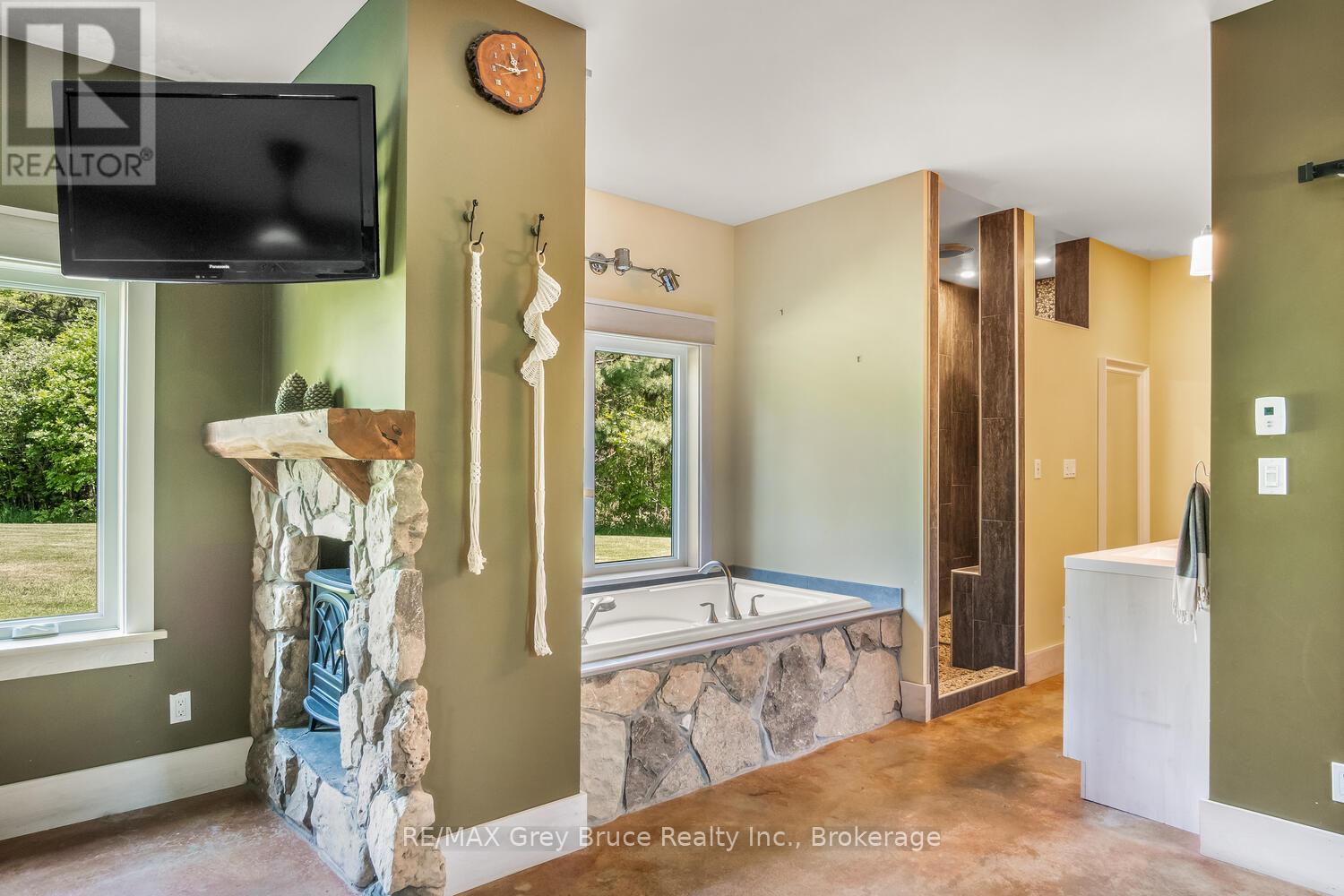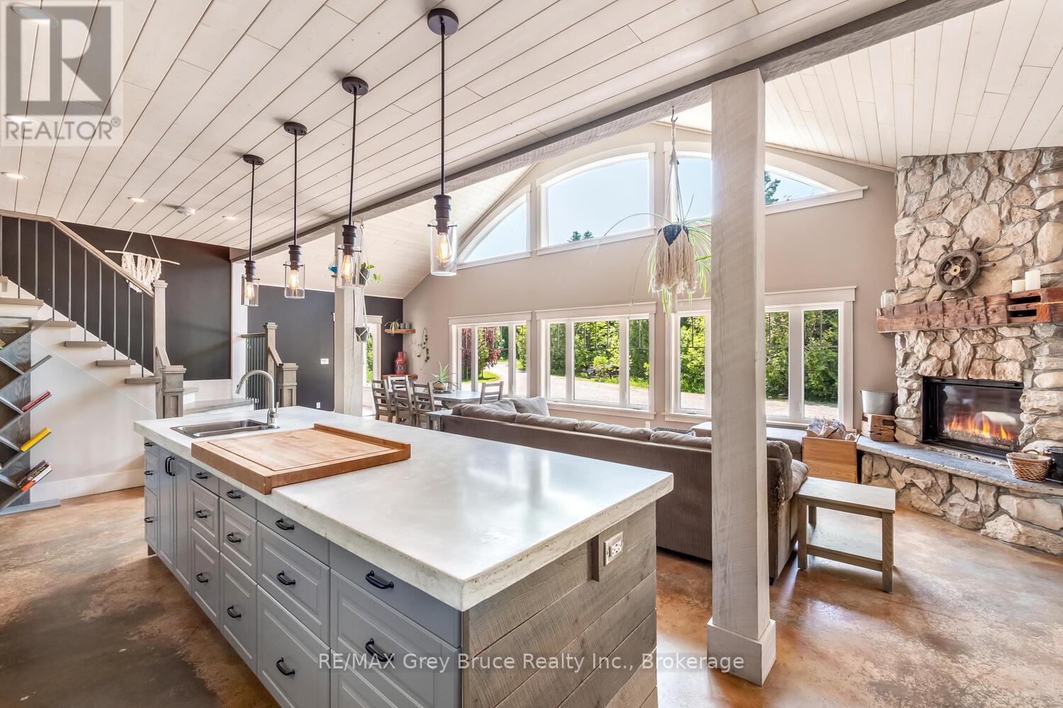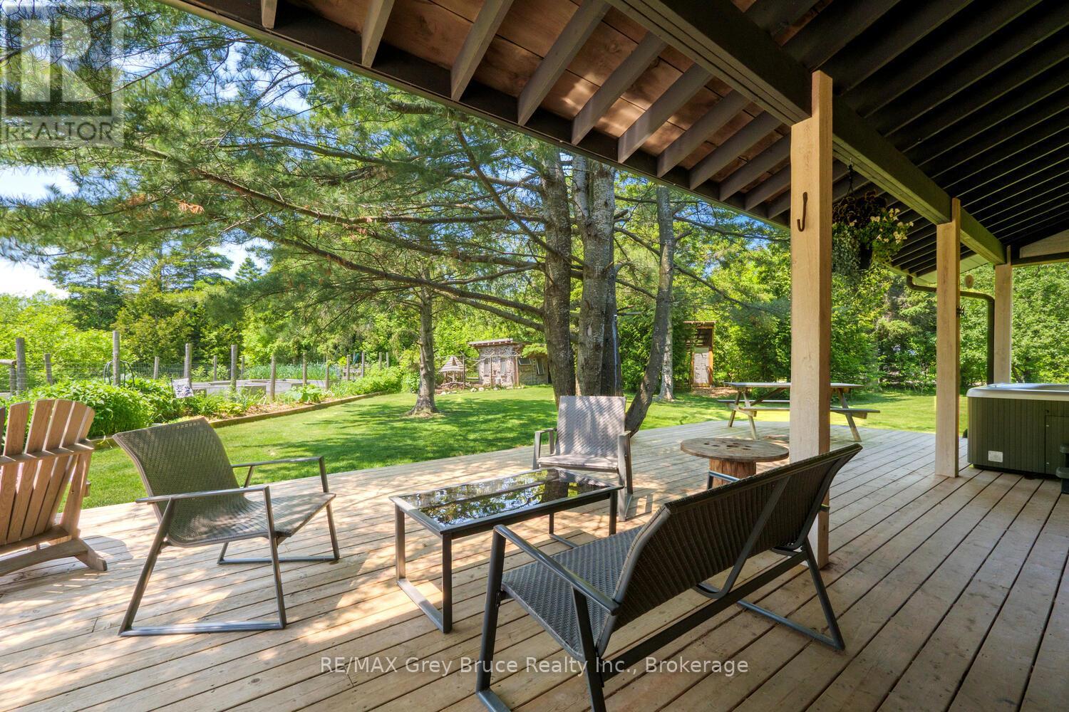 Elegance Meets Country Living on 24 Acres! Welcome to your private rural retreat just minutes from Tobermory. This exceptional country property offers the perfect balance of peaceful acreage living and convenient access to shops, amenities, recreation, and the stunning natural attractions of Northern Bruce Peninsula. Established in 2018, this custom 3-bedroom, 2.5-bath home offers approximately 2,760 sq. ft. of thoughtfully designed living space, ideal as a full-time residence, executive country home, or recreational getaway. The open-concept layout features soaring vaulted ceilings, expansive windows, and abundant natural light, creating a bright and inviting atmosphere for everyday living and entertaining. Designed with efficiency and comfort in mind, the home includes radiant in-floor heating and passive solar design for year-round energy savings. The chef-inspired kitchen is a standout feature with a large island, dual propane ranges, farmhouse sink, and custom concrete countertops - perfect for hosting family and friends. The spacious primary suite serves as a private sanctuary, complete with a spa-like ensuite featuring a soaker tub, walk-in shower, double vanity, separate water closet, and direct access to a covered deck with hot tub. A generous walk-in closet adds functionality and style. The upper-level loft provides flexible space for a home office, fitness area, studio, or additional living area. Outdoors, enjoy the freedom of 24 acres of land, ideal for hobby farming, gardening, or simply embracing nature. A fully heated, attached double garage offers year-round parking, workshop potential, or storage for recreational equipment. With direct access to snowmobile trails plus nearby hiking trails and water access, this property supports an active four-season lifestyle. An outstanding opportunity to own a modern rural home with acreage in a sought-after location - perfect for buyers seeking privacy, recreation, and investment in Bruce Peninsula real estate. (id:64974)