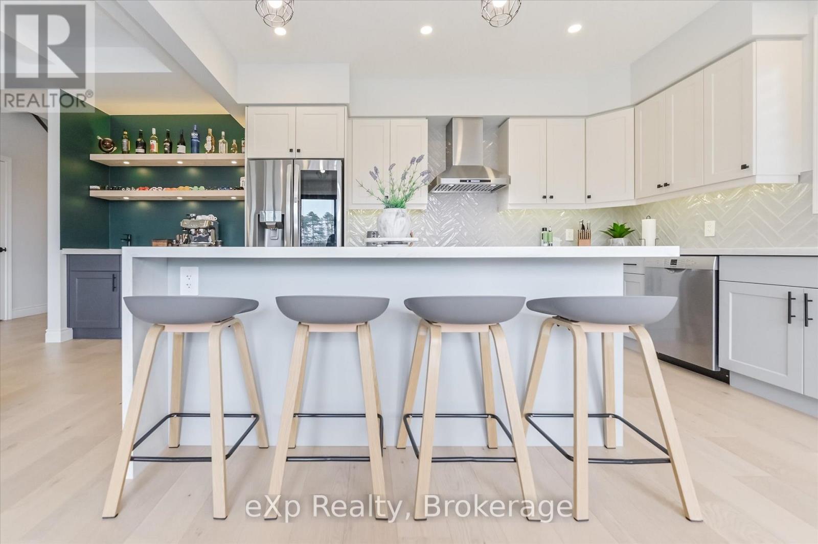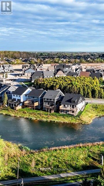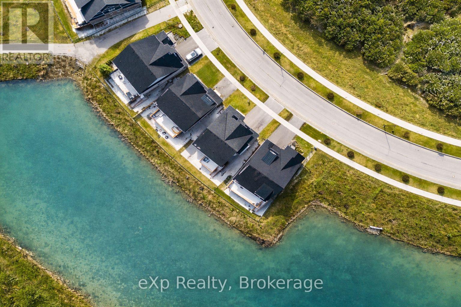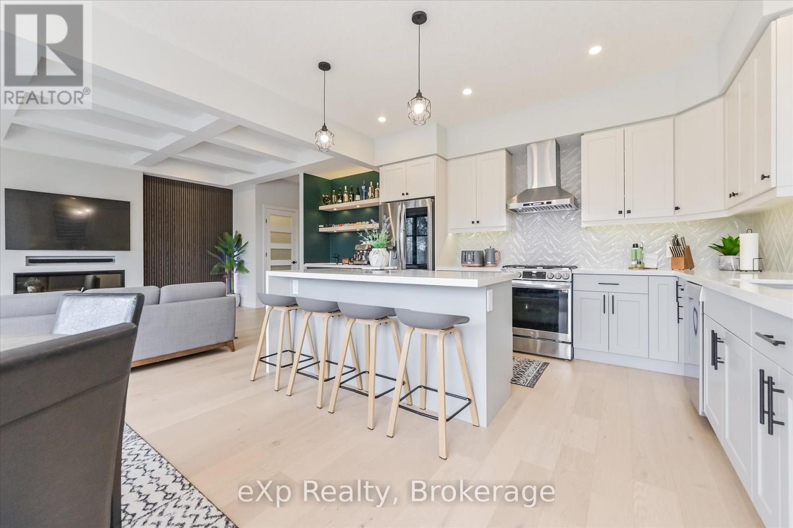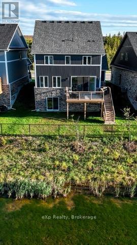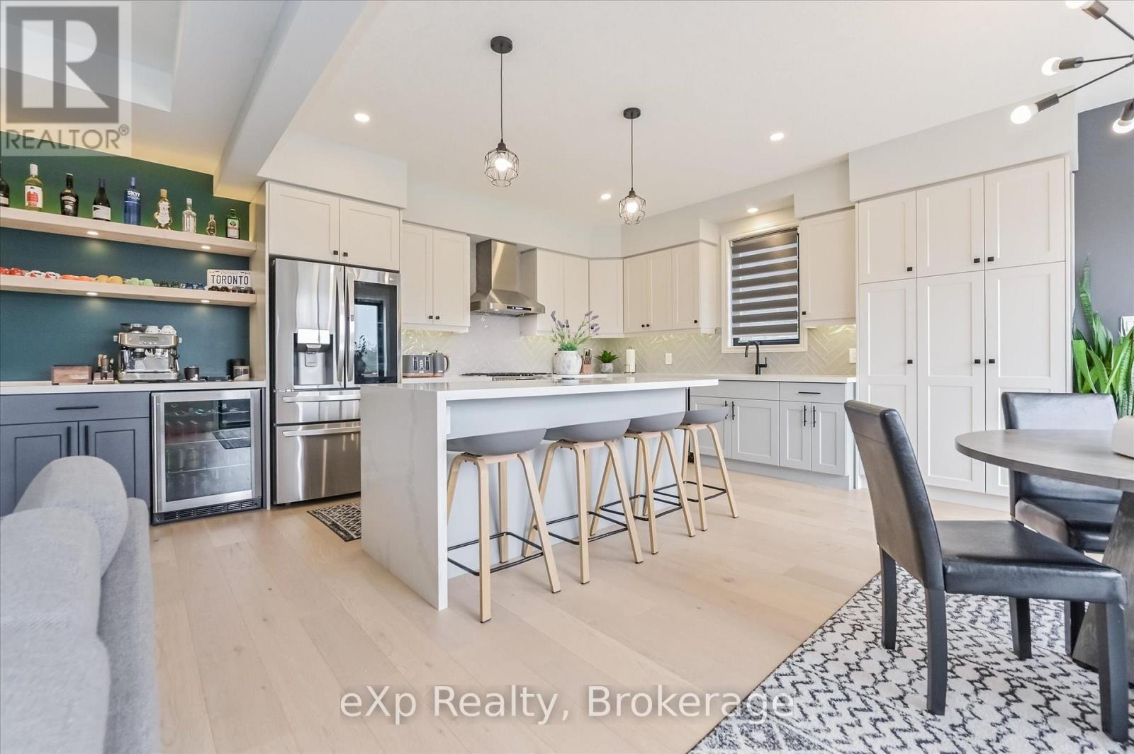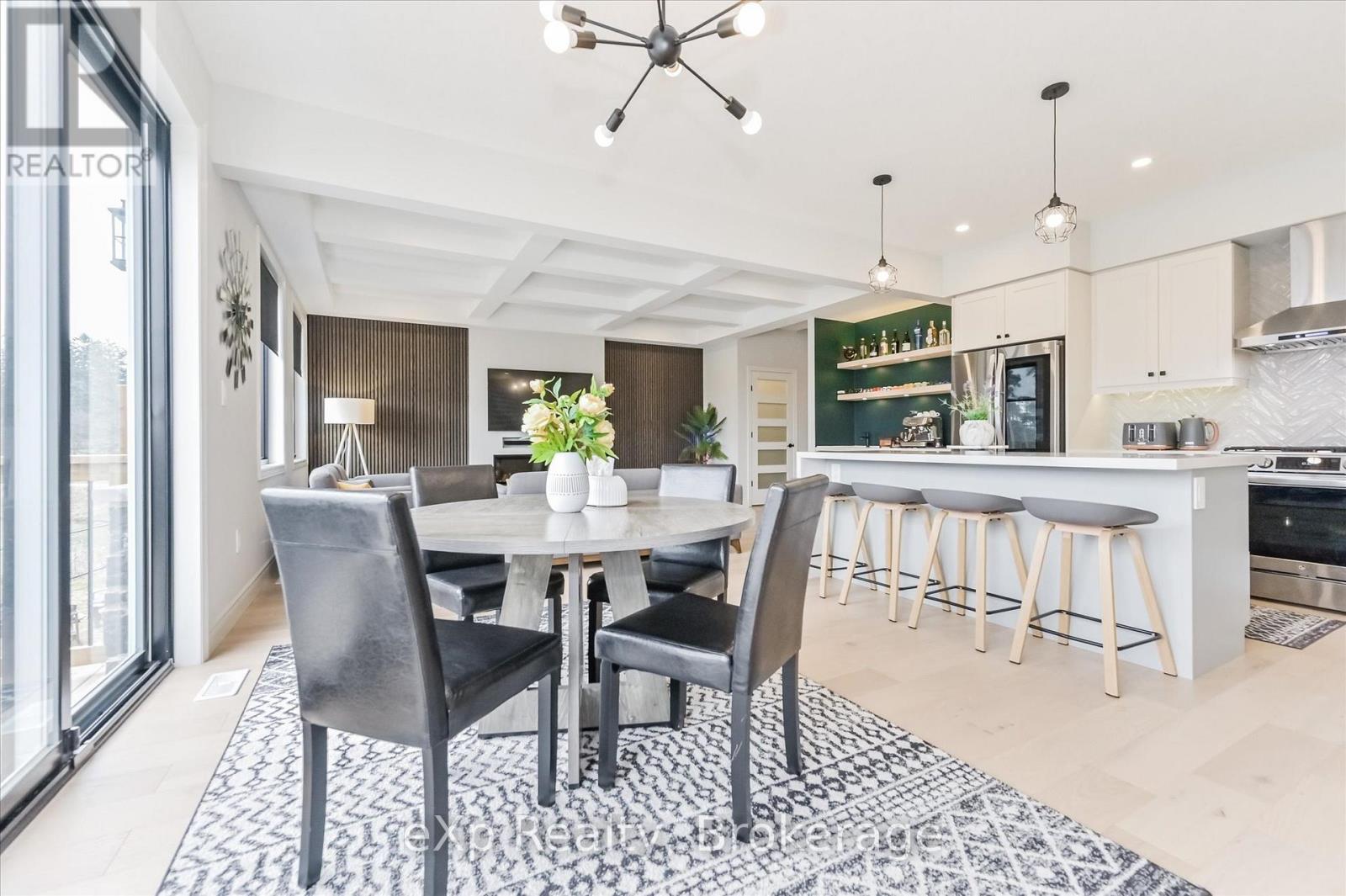 Overlooking a tranquil pond in Elora's highly sought-after South River community, this 2023 Granite Home build offers a seamless blend of modern design and relaxed, nature-inspired living. With 4 bedrooms, 3 full bathrooms and a powder room, this home is thoughtfully laid out for both everyday comfort and stylish entertaining, just a short walk to downtown Elora and nearby trails including the Trestle Bridge Trail.Inside, every detail has been carefully considered. The kitchen stands out with a herringbone backsplash, two-tone cabinetry featuring cream uppers and light grey lowers and island, waterfall quartz countertops, sleek black hardware, a gas stove, and a custom coffee bar. The family room is warm and inviting, highlighted by a gas fireplace, walnut slat feature walls, and coffered ceilings that add depth and character. A striking glass staircase leads to the upper level, where a spa-like bathroom features a waterfall shower with niche and glass surround. White oak flooring and black window frames carry a clean, modern feel throughout.The finished walkout basement is bright and functional, offering additional living space with direct access to the backyard and peaceful water views. Complete with a double car garage and refined finishes throughout, this home presents a beautifully finished opportunity in one of Elora's most desirable neighbourhoods. Quick closing available. (id:64974)