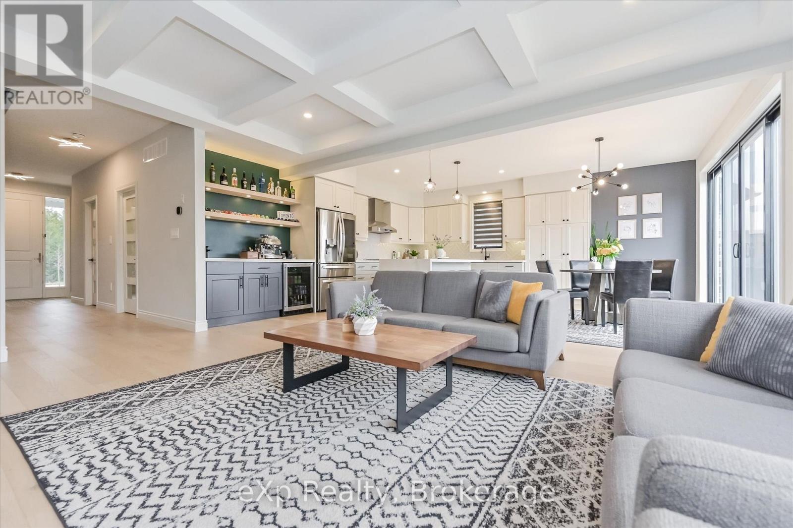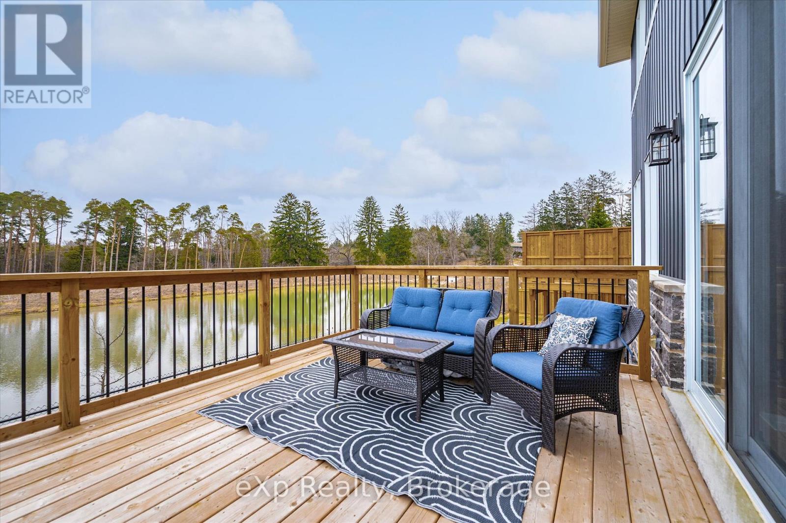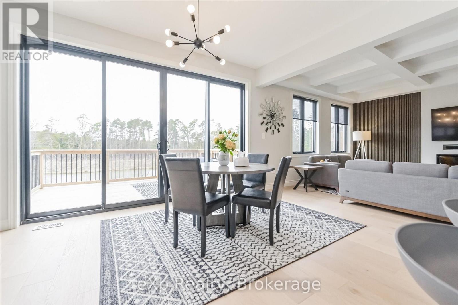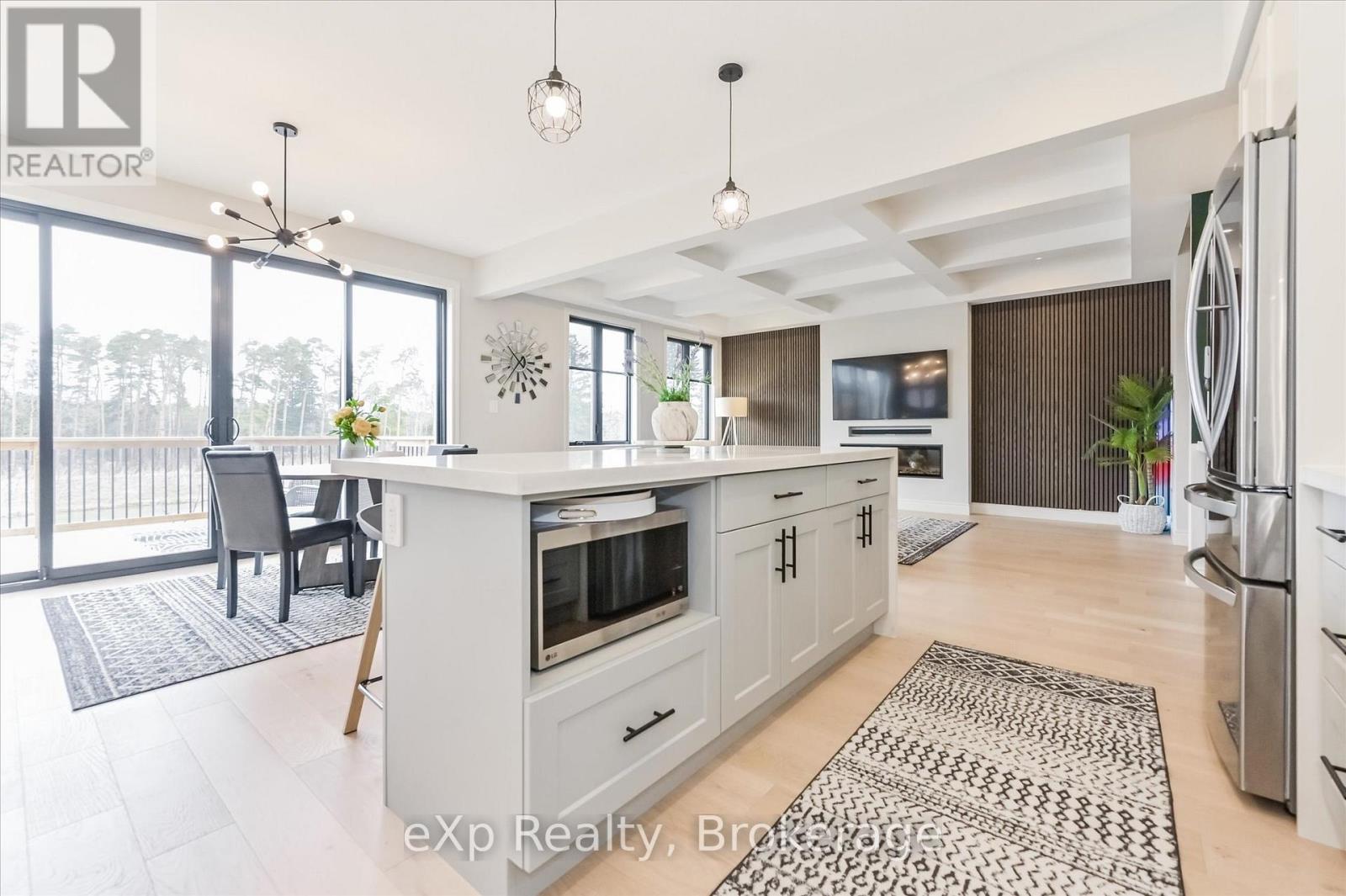 Overlooking a tranquil pond in Elora's highly sought-after South River community, this 2023 Granite Home build offers a seamless blend of modern design and relaxed, nature-inspired living. With 4 bedrooms, 3 full bathrooms and a powder room, this home is thoughtfully laid out for both everyday comfort and stylish entertaining, just a short walk to downtown Elora and nearby trails including the Trestle Bridge Trail.Inside, every detail has been carefully considered. The kitchen stands out with a herringbone backsplash, two-tone cabinetry featuring cream uppers and light grey lowers and island, waterfall quartz countertops, sleek black hardware, a gas stove, and a custom coffee bar. The family room is warm and inviting, highlighted by a gas fireplace, walnut slat feature walls, and coffered ceilings that add depth and character. A striking glass staircase leads to the upper level, where a spa-like bathroom features a waterfall shower with niche and glass surround. White oak flooring and black window frames carry a clean, modern feel throughout.The finished walkout basement is bright and functional, offering additional living space with direct access to the backyard and peaceful water views. Complete with a double car garage and refined finishes throughout, this home presents a beautifully finished opportunity in one of Elora's most desirable neighbourhoods. Quick closing available. (id:64974)
