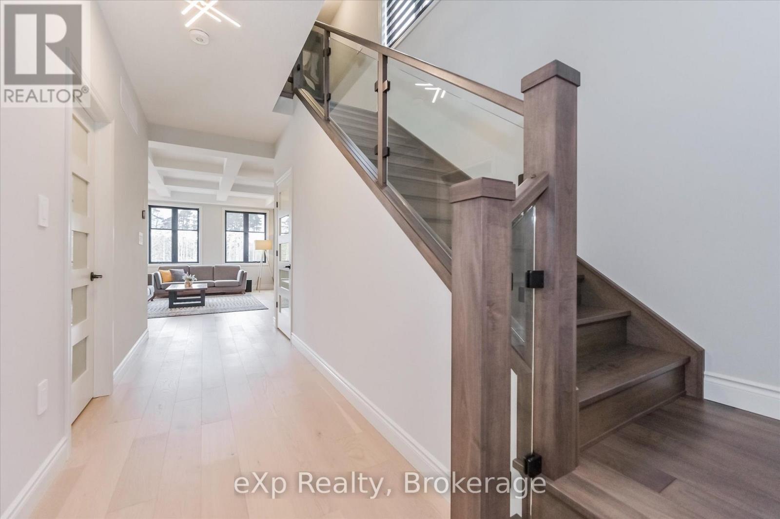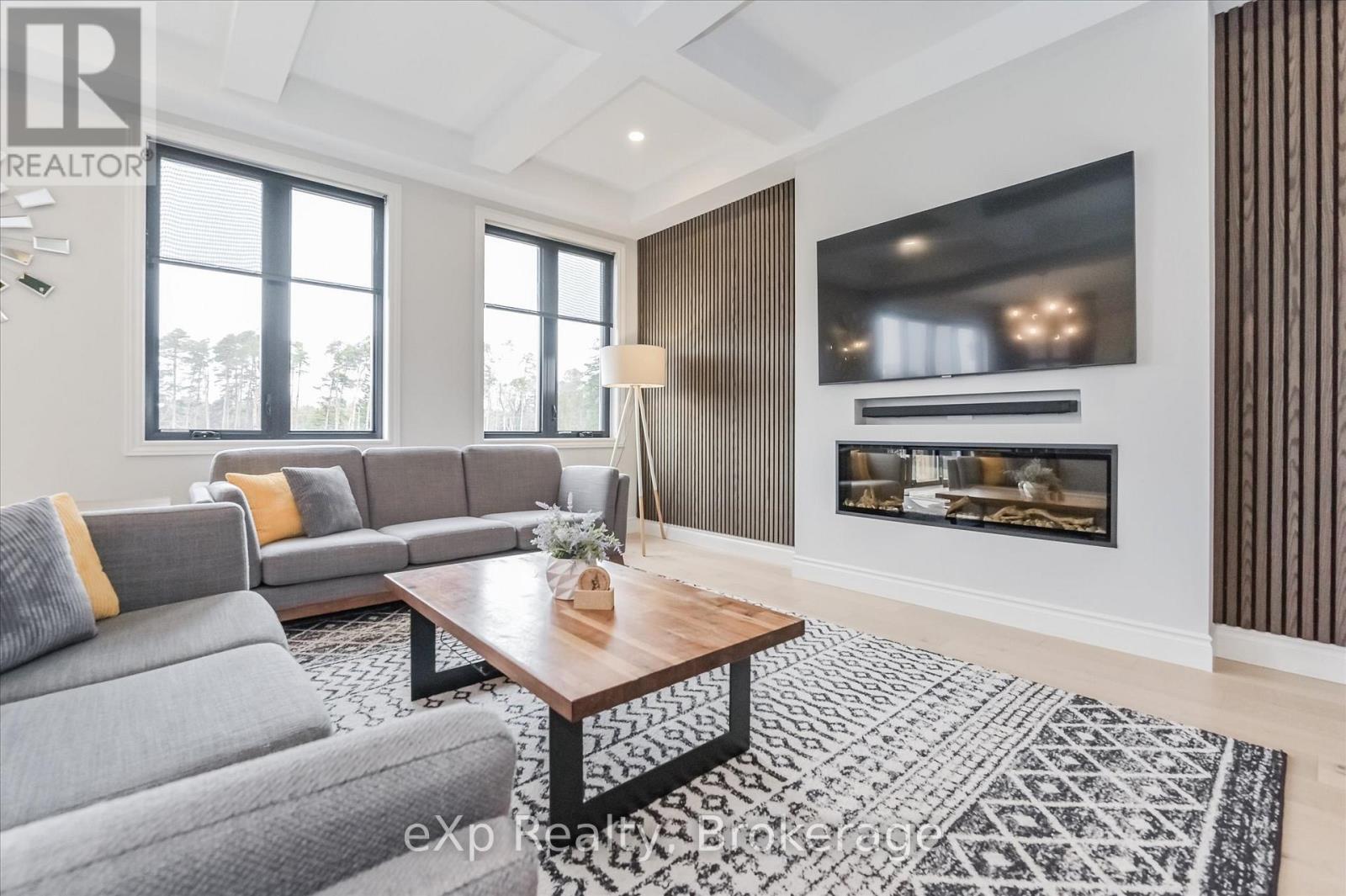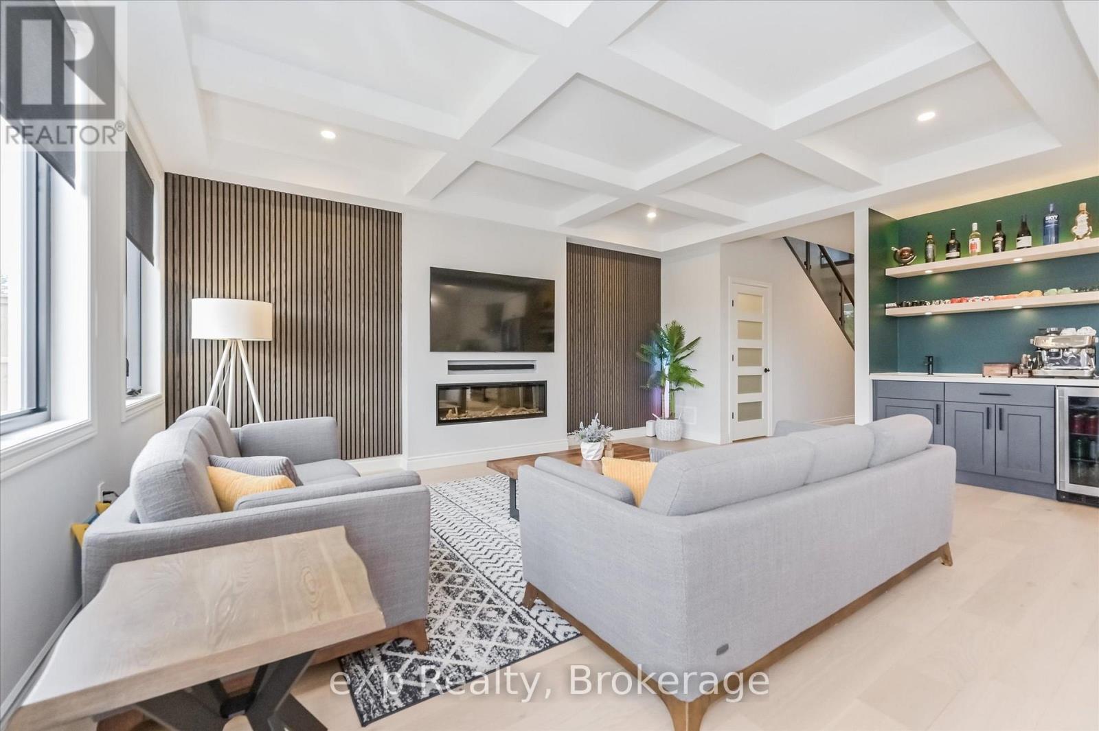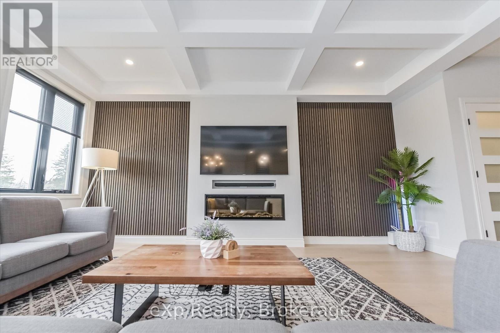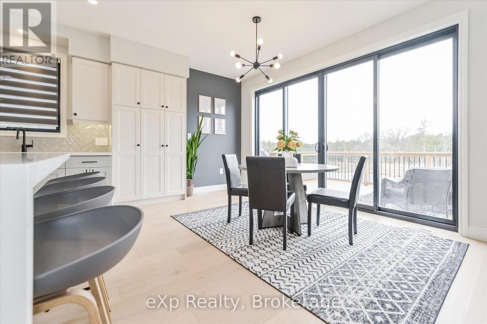 Overlooking a tranquil pond in Elora's highly sought-after South River community, this 2023 Granite Home build offers a seamless blend of modern design and relaxed, nature-inspired living. With 4 bedrooms, 3 full bathrooms and a powder room, this home is thoughtfully laid out for both everyday comfort and stylish entertaining, just a short walk to downtown Elora and nearby trails including the Trestle Bridge Trail.Inside, every detail has been carefully considered. The kitchen stands out with a herringbone backsplash, two-tone cabinetry featuring cream uppers and light grey lowers and island, waterfall quartz countertops, sleek black hardware, a gas stove, and a custom coffee bar. The family room is warm and inviting, highlighted by a gas fireplace, walnut slat feature walls, and coffered ceilings that add depth and character. A striking glass staircase leads to the upper level, where a spa-like bathroom features a waterfall shower with niche and glass surround. White oak flooring and black window frames carry a clean, modern feel throughout.The finished walkout basement is bright and functional, offering additional living space with direct access to the backyard and peaceful water views. Complete with a double car garage and refined finishes throughout, this home presents a beautifully finished opportunity in one of Elora's most desirable neighbourhoods. Quick closing available. (id:64974)