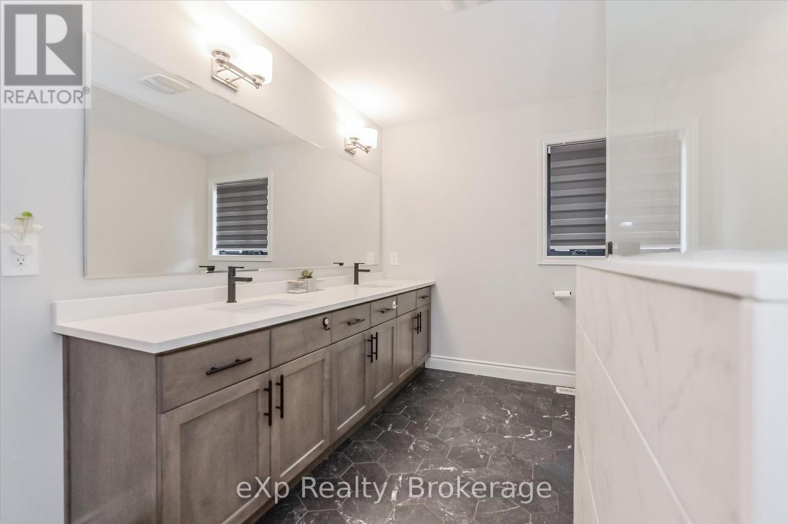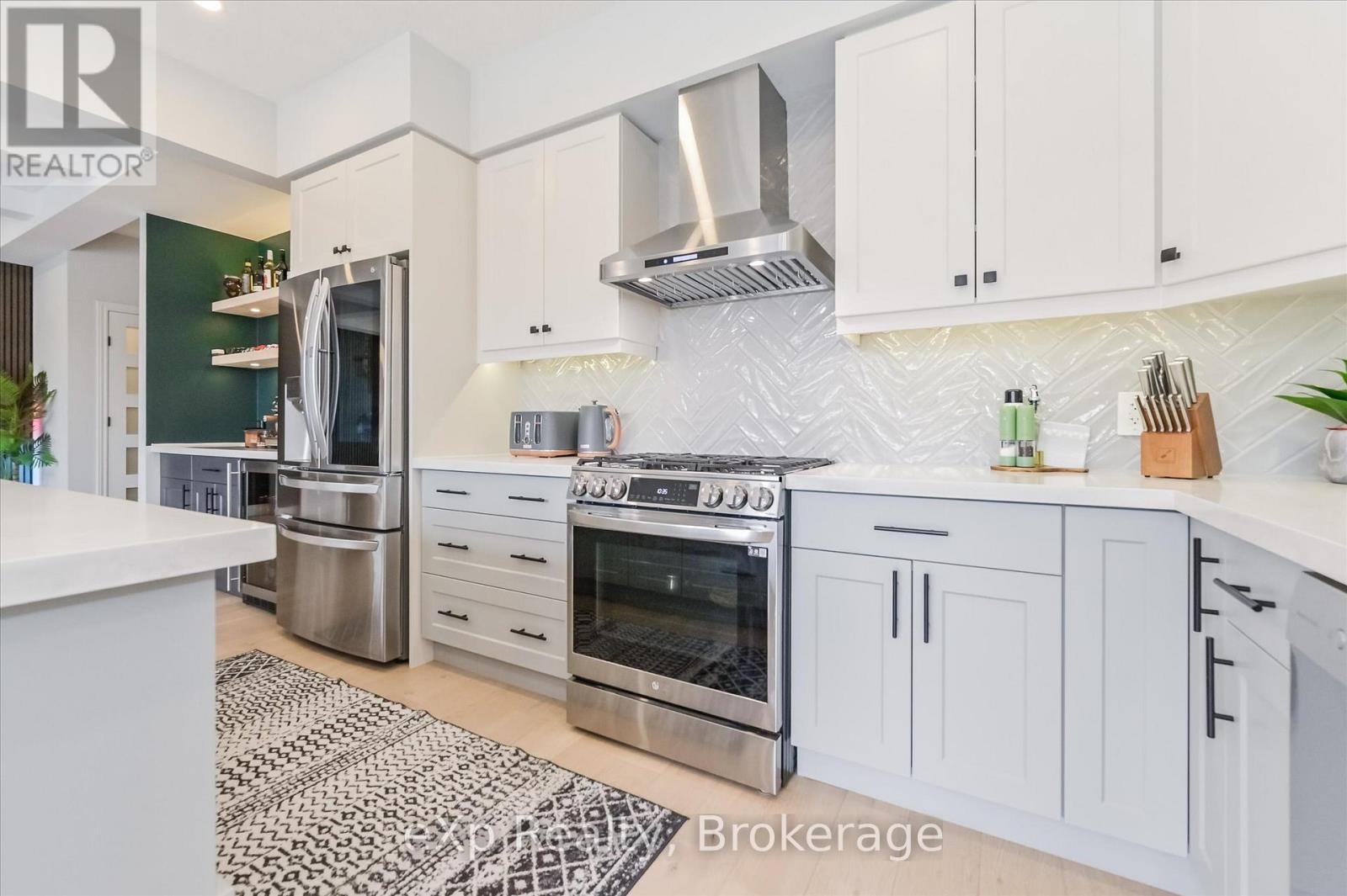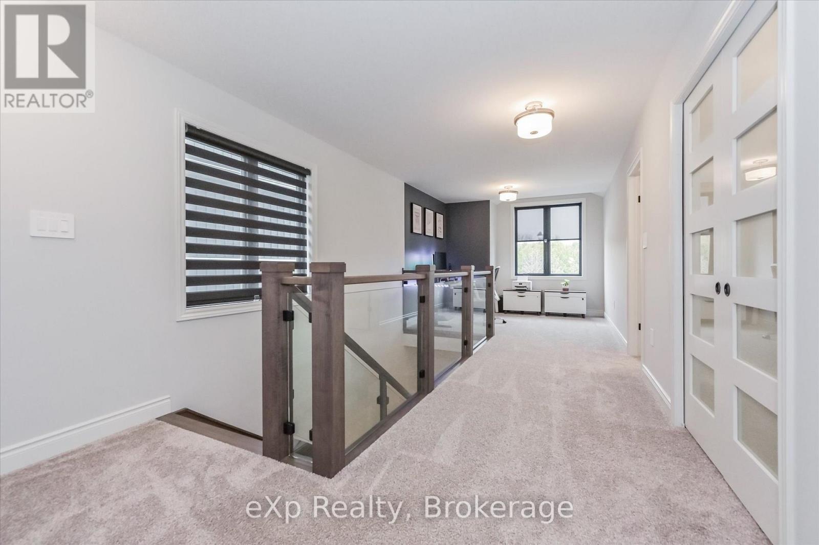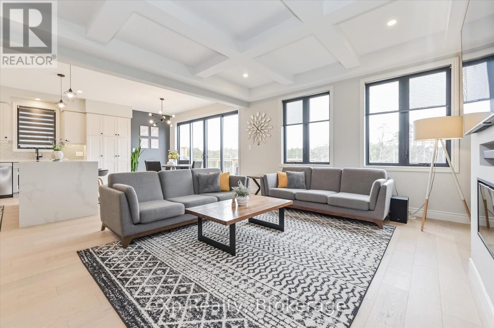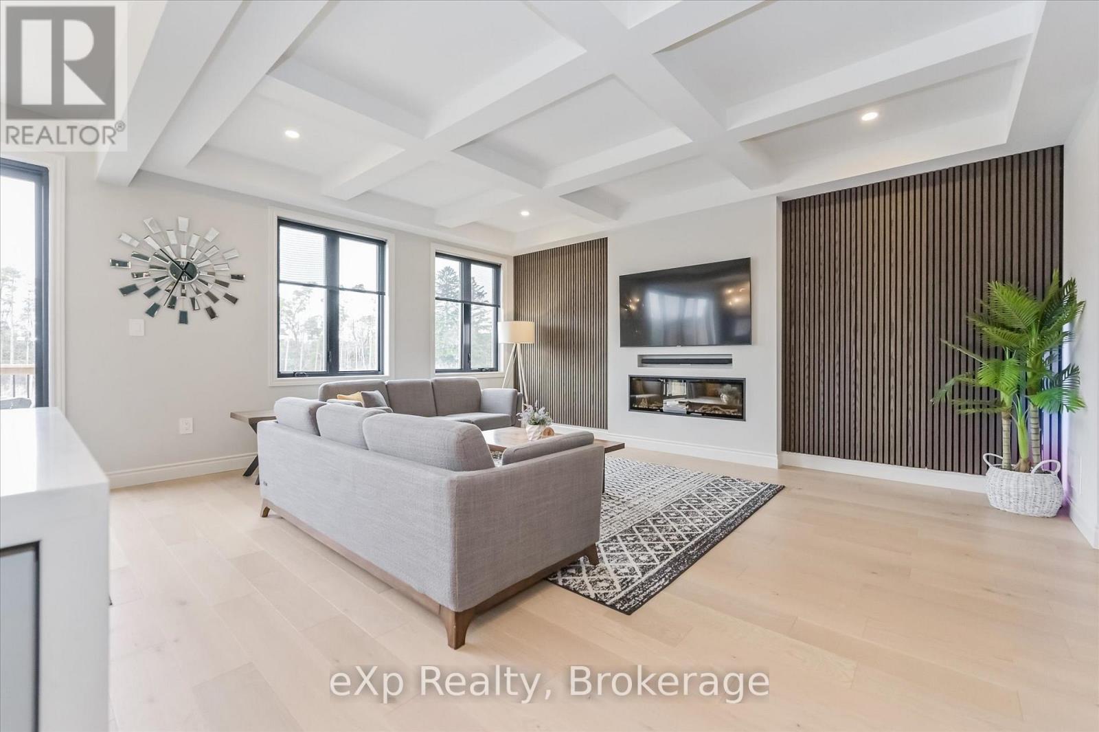 Overlooking a tranquil pond in Elora's highly sought-after South River community, this 2023 Granite Home build offers a seamless blend of modern design and relaxed, nature-inspired living. With 4 bedrooms, 3 full bathrooms and a powder room, this home is thoughtfully laid out for both everyday comfort and stylish entertaining, just a short walk to downtown Elora and nearby trails including the Trestle Bridge Trail.Inside, every detail has been carefully considered. The kitchen stands out with a herringbone backsplash, two-tone cabinetry featuring cream uppers and light grey lowers and island, waterfall quartz countertops, sleek black hardware, a gas stove, and a custom coffee bar. The family room is warm and inviting, highlighted by a gas fireplace, walnut slat feature walls, and coffered ceilings that add depth and character. A striking glass staircase leads to the upper level, where a spa-like bathroom features a waterfall shower with niche and glass surround. White oak flooring and black window frames carry a clean, modern feel throughout.The finished walkout basement is bright and functional, offering additional living space with direct access to the backyard and peaceful water views. Complete with a double car garage and refined finishes throughout, this home presents a beautifully finished opportunity in one of Elora's most desirable neighbourhoods. Quick closing available. (id:64974)