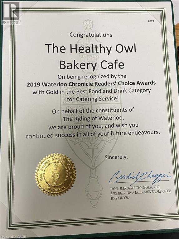 The Healthy Owl Bakery Cafe is a Waterloo mainstay. The Café has been providing the residents and businesses of Waterloo Region quality food and a friendly environment for many years [see supplement]. With a solid and loyal customer base this Cafe is a very successful business, now is the opportunity for a new owner to bring their own ideas and creativity to the restaurant. The proximity to a highway, public transit and a major housing expansion all bodes well for continued success. Purchase price includes all instore equipment and stock on hand. Present owners are willing to train new owners. Book your viewing today. (id:64974)