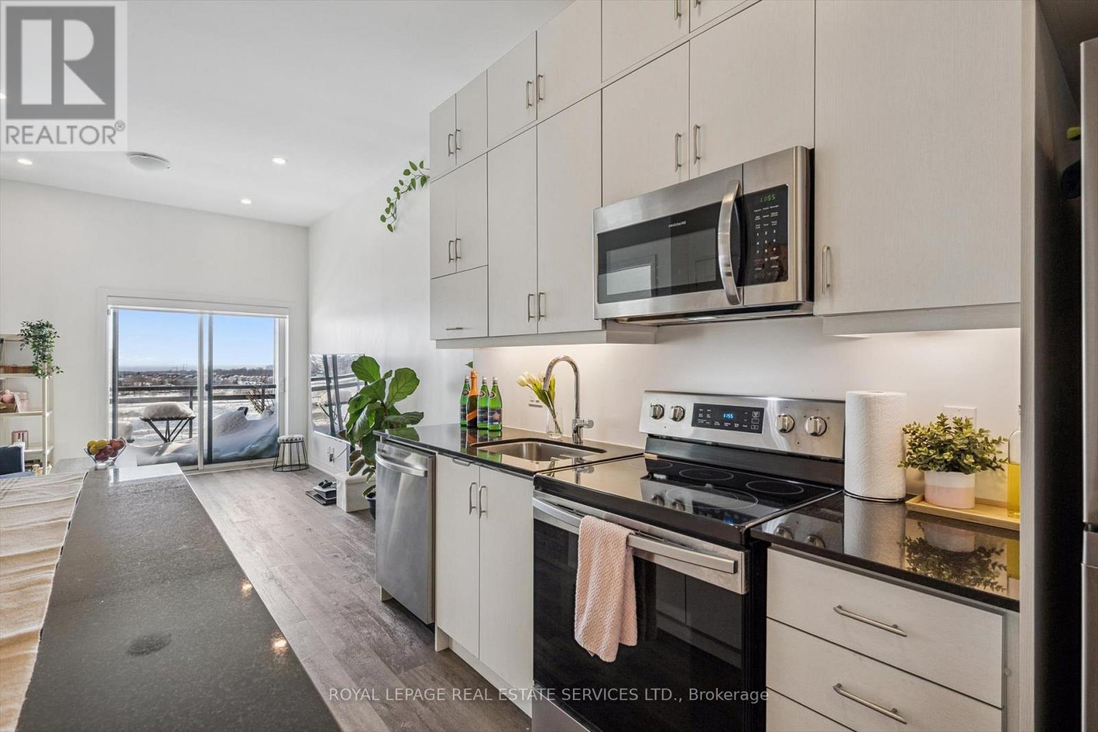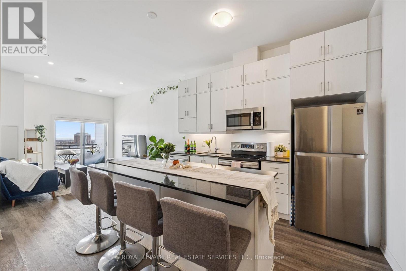 WELCOME TO BOWER CONDO'S BY MATTAMY - A BOUTIQUE LOW-RISE SIX-STOREY CONDOMINIUM IN GLENORCHY! SOUGHT-AFTER TOP FLOOR 1+1 BEDROOM PENTHOUSE! Thoughtfully designed for modern living, this impressive condominium features 10' ceilings and wide-plank luxury vinyl flooring. Enjoy an open-concept layout showcasing a gourmet kitchen with granite countertops, an abundance of cabinets, stainless steel appliances, and an oversized island with seating for four. The living and dining area offers a sliding door walkout to a private balcony with glass panels providing unobstructed south-east facing views. Completing this unit is a spacious primary bedroom, versatile den ideal as a bedroom or home office, spa-inspired four-piece bathroom, and convenient in-suite laundry. Also included are one underground parking space and a dedicated storage locker. The monthly condominium fee of $375.66 covers building insurance, common elements, and parking. Amenities include a fully-equipped gym, party/meeting room, and ample visitor parking. This sought-after location is close to top-rated schools, shopping, dining, cafes, parks and trails, hospital, River Oaks Community Centre, and everyday essentials. Ideal for commuters, with easy access to public transit, major highways, and the GO Train. Offering the perfect blend of comfort, practicality, and luxury, this move-in ready penthouse truly has it all! (id:64974)