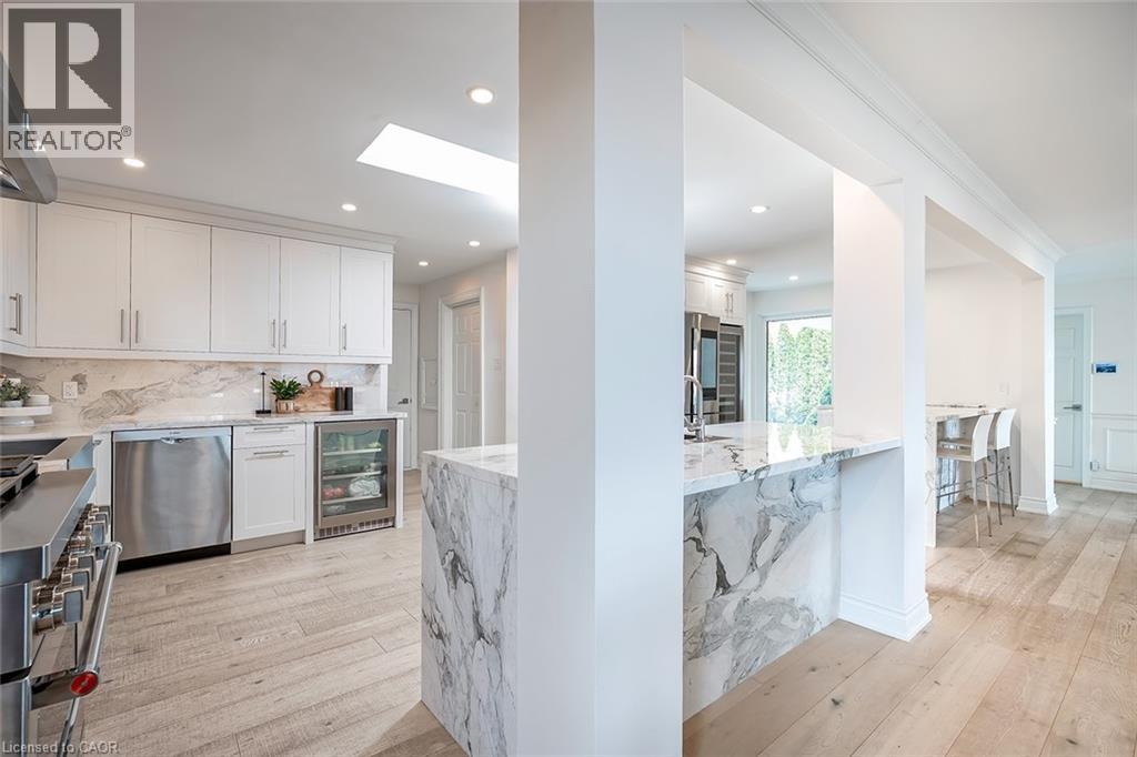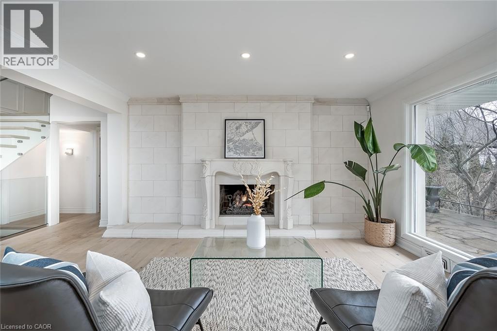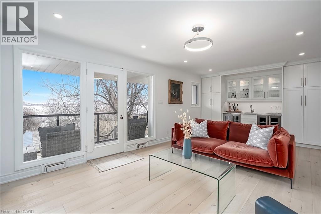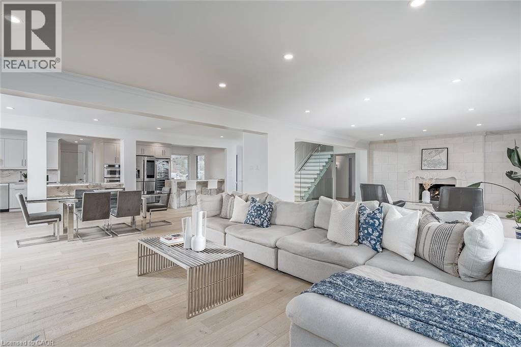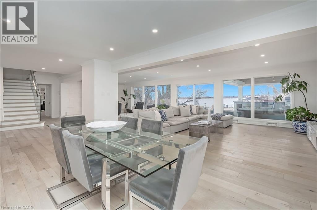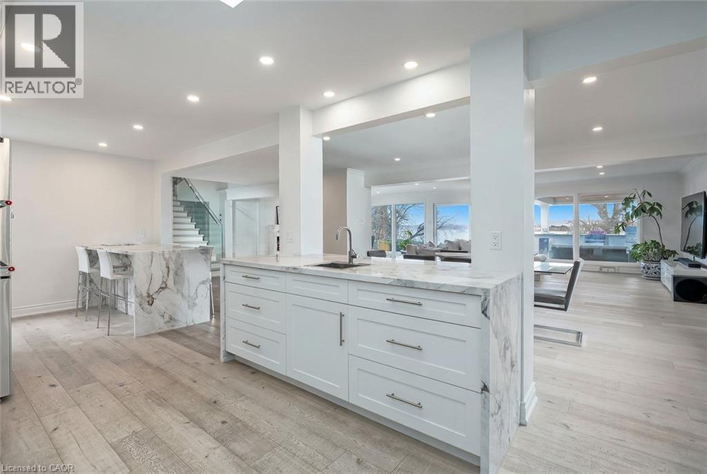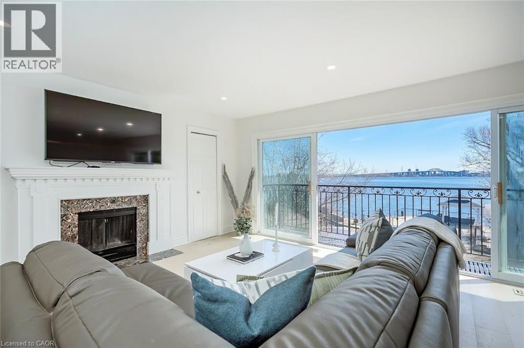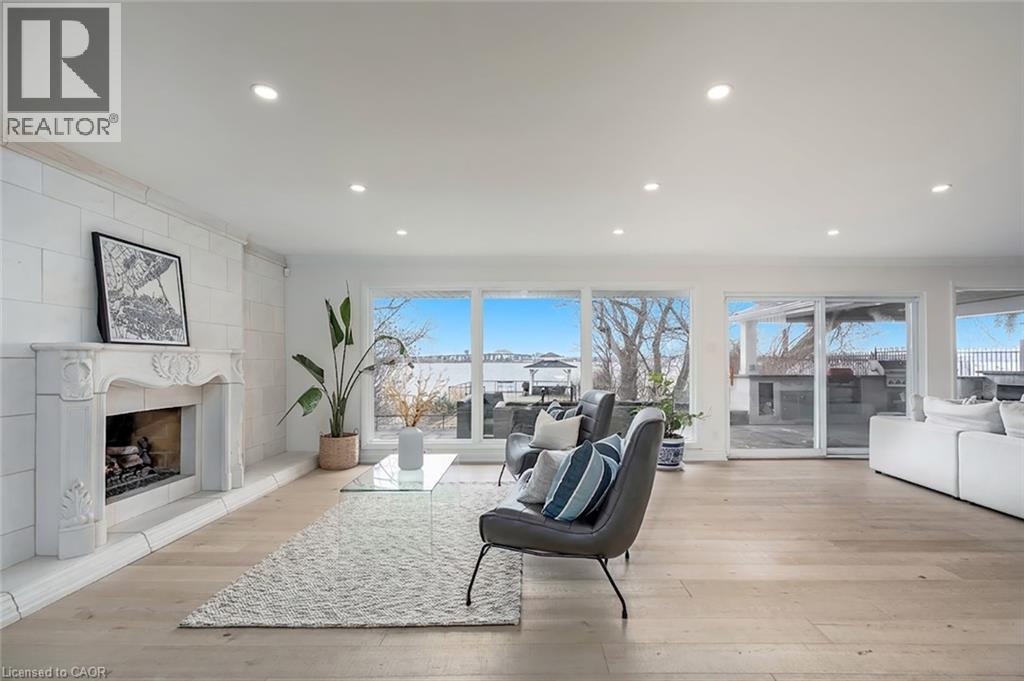 Extensively updated waterfront home offering over 6900 square feet of total living space including 6 bedrooms, 4.5 baths, and three self-contained living spaces ideal for multi-generational living. Set on a rare 93 x 313 ft lot on the bay, this property delivers breathtaking views, private docking, and exceptional outdoor living. The main level features an open concept living and dining area with a wall of windows, gas fireplace, and walkout to a resort-style backyard. The custom chef’s kitchen showcases marble countertops, stainless steel appliances including a six-burner gas stove, wine, and beverage fridges, skylight, and extensive cabinetry. A main floor primary or in-law suite offers a private living area with wet bar and fireplace, a bedroom with office, nursery or dressing room, and ensuite bath. Upstairs, the luxurious primary retreat features a walk-in closet, spa-like ensuite with jetted tub, a fireplace, and private balcony overlooking the water, while three additional bedrooms provide ample space and share a gorgeous bath. The walkout lower level includes a recreation room with fireplace, kitchenette, sixth bedroom, full bath, and separate entrance. Outside, enjoy a saltwater pool, covered outdoor kitchen, multiple decks, gazebo, docks, and a boathouse with heated room—perfect as a gym or lounge. Ten-car circular driveway, double garage, and extensive updates throughout complete this exceptional lakeside offering. (id:64974)