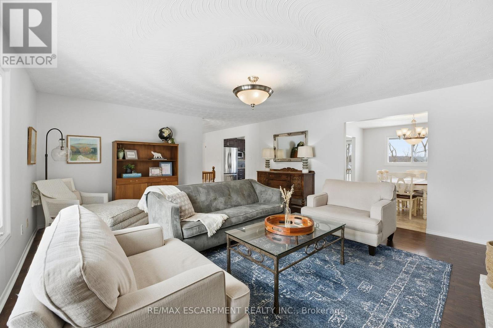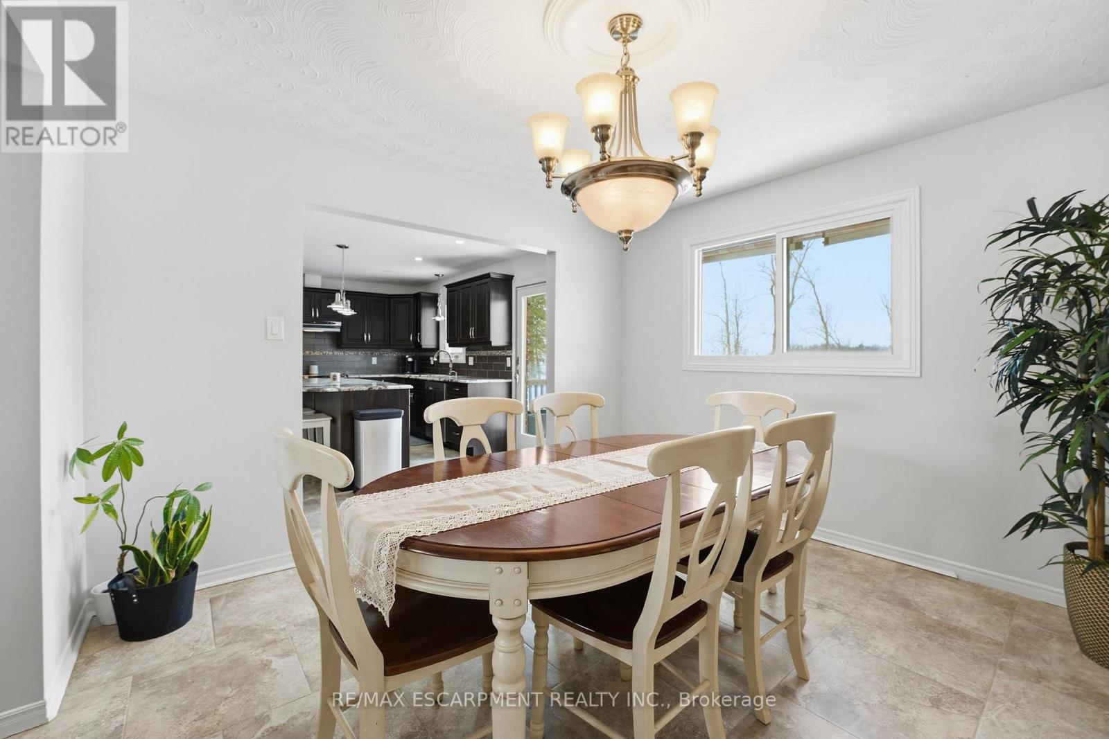 Discover peaceful country living in this all-brick, raised bungalow set on a private 1.24 acre lot surrounded by mature trees. Positioned well back from the road, the expansive driveway offers parking for 10+ vehicles - perfect for guests, trailers, or all your toys. Built with durable core slab construction, providing solid floors for the main-level, and open-concept living in the basement. Step inside through the spacious, welcoming foyer featuring dual closets and a beautiful open staircase that allows natural light to flow throughout both levels. The upper level showcases an updated kitchen with an oversized island, granite countertops, and seamless transition to the dining room with an eye-catching accent wall. The bright, spacious living room features custom built-ins framing an all-brick fireplace (not in use) and a large bay window. Three bedrooms and a 4-piece bathroom complete the upper level, with dual closets in the primary bedroom . The fully finished lower level is designed for entertaining with a built-in bar, gas fireplace, 3-piece bathroom, and flexible recreation space ideal for a playroom, home office, or future bedroom with convenient walk-up garage access and includes a utility/storage room with brand new furnace (Jan 2026). The 500+ sq ft garage comfortably fits two vehicles and includes a gas line already roughed in for a heater. Step outside into the spacious yard to an oversized back deck overlooking the above-ground pool (AS-IS) - perfect for relaxing or entertaining. Enjoy the peace and privacy of rural living while being just minutes from the downtown core of Dunnville. (id:64974)