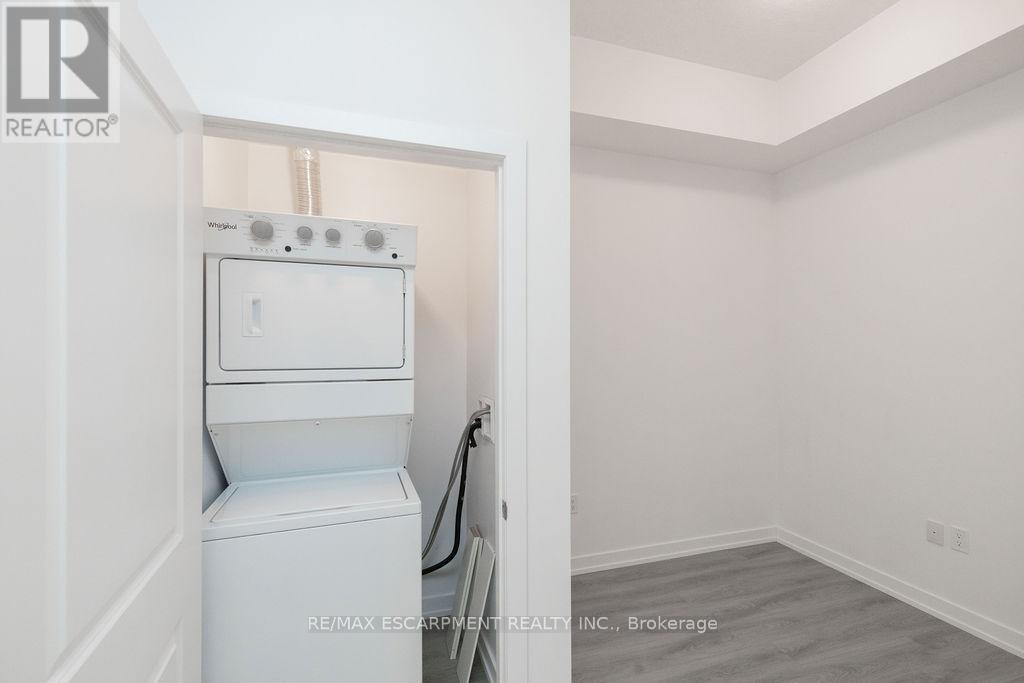 Welcome to comfortable condo living in the sought-after Utopia condominium in Beamsville. This rare 1-bedroom plus large den layout features two full bathrooms, offering added convenience for residents and guests. With 9-foot ceilings and an open-concept design, the unit provides a bright and functional living space. The spacious den is well-suited for a home office or additional living area, while the private south-facing balcony overlooks the courtyard. The unit includes stainless steel appliances, pendant lighting over the island, and in-suite laundry. A storage locker is conveniently located on the same floor as the unit. Building features include parcel delivery to the unit, garbage chutes on each level, and one underground parking space. Residents have access to amenities such as a party room with terrace and a fitness centre. Geothermal heating and cooling are included in the monthly rent. (id:64974)