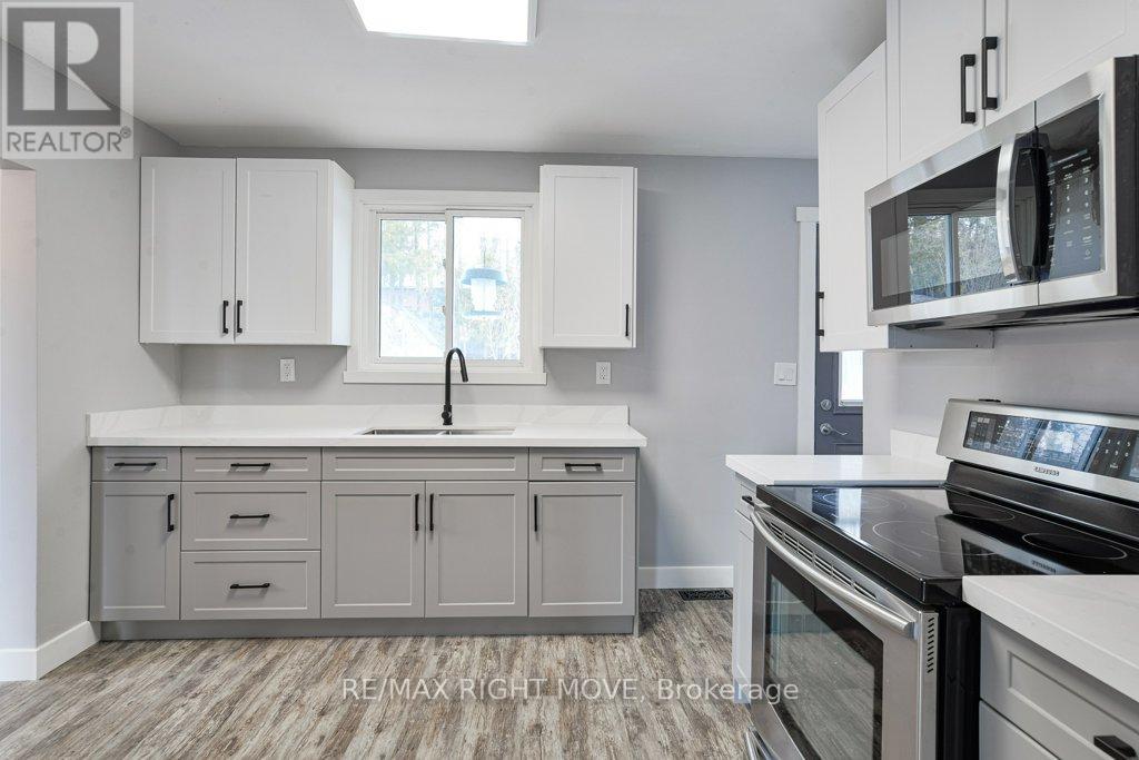 Updated brick ranch bungalow in the west ward of Orillia. Highway access minutes away makes this a convenient location for commuting. The layout includes an open concept L-shaped living/dining room with vinyl floors; kitchen with quartz countertops, stainless steel double sink, stainless steel refrigerator, stove and built-in microwave; 3 bedrooms; a new main 4pc. bathroom with a floating vanity, dual flush toilet and vinyl laminate floor. There's a main floor laundry closet to accommodate a stacking washer/dryer and a rear door off the kitchen leads to the partially fenced backyard. The basement includes a finished family room with Napoleon gas fireplace, LED pot lights and new Berber carpet; a new 4pc. bathroom with ceramic floor and an unfinished laundry/utility room for storage. The attached single garage measures 13' 9" x 23' 3" and has inside entrance to the family room. 100 amp hydro service. Newly paved double driveway (2025) with parking for up to 4 vehicles. This home is move-in ready and easy to show. Quick closing available. (id:64974)