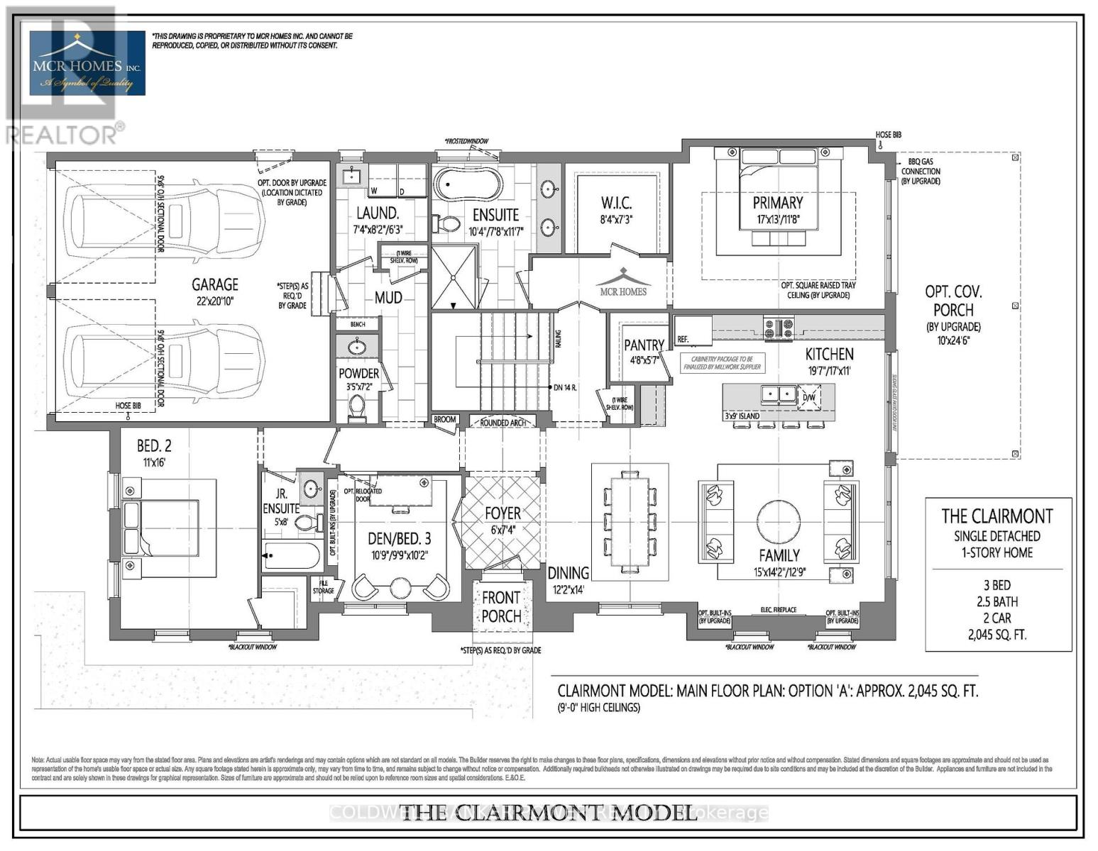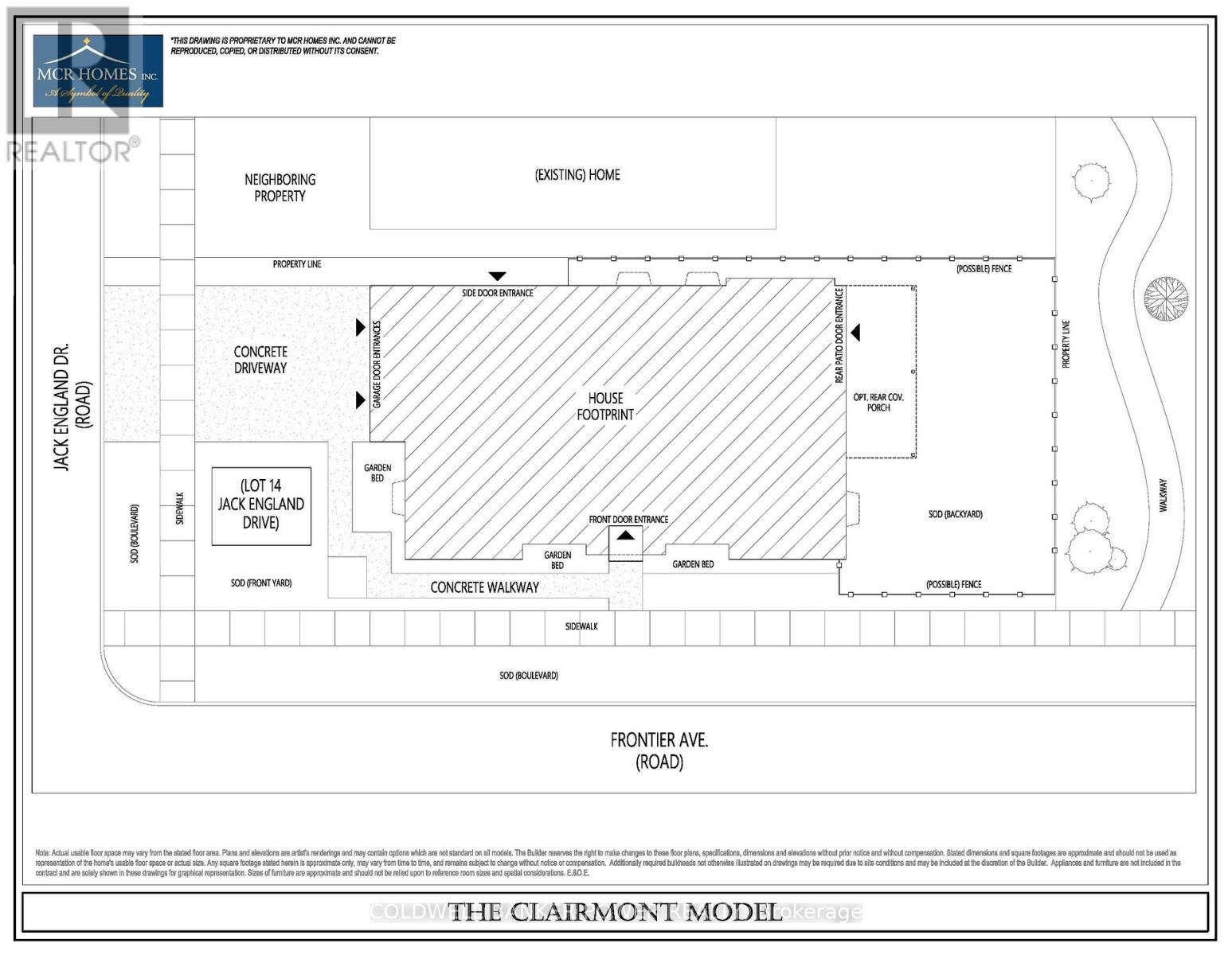 Welcome to The Clairmont, a thoughtfully designed bungalow by MCR Homes, set on a premium corner lot backing onto a quiet pathway in Talbot Village Phase 7. This elegant, lot-specific design is exclusive to Jack England Drive and cannot be replicated elsewhere in the subdivision. The home features a striking traditional Old English-inspired elevation, with timeless brickwork, refined brick soldier coursing, and detailed masonry surrounds at the windows and entry, creating a warm and classic street presence. Offering 2,045 sq ft on the main floor, the layout balances openness with privacy. Designed as a 2-bedroom plus den, the den can easily convert to a third bedroom if desired. The secondary bedroom and den are positioned toward the front of the home, ideal for guests, a home office, or flexible living. The primary suite is privately located at the rear, separated by a gracious vestibule and designed as a true retreat with a generous bedroom, walk-in closet, and well-appointed ensuite. A nearby full bath serves the secondary bedroom. The main living area opens to a bright family room and kitchen with views of the rear yard and pathway, enhanced by 9-foot ceilings throughout the main floor. A functional mudroom, main-floor laundry, and attached two-car garage complete the home. Built by MCR Homes, known for their healthy, well-considered standard specifications, this is a rare opportunity to secure a refined bungalow on one of Talbot Village's most desirable and limited lot offerings. Contact for more floorplan options available with MCR Homes (id:64974)