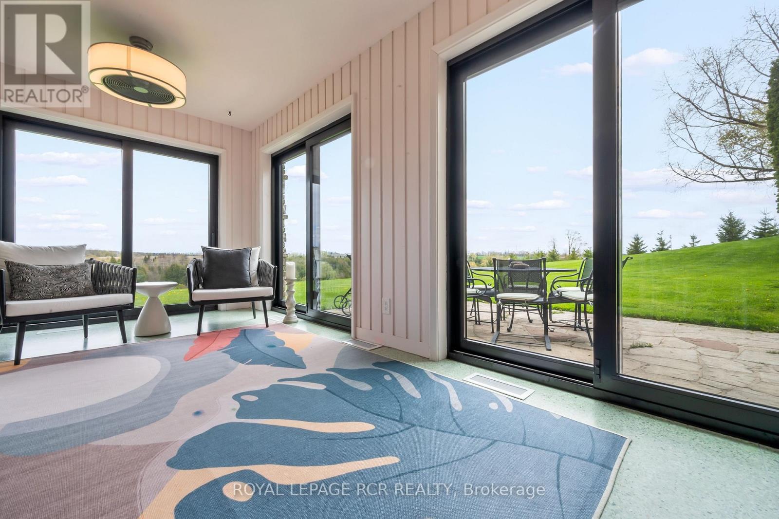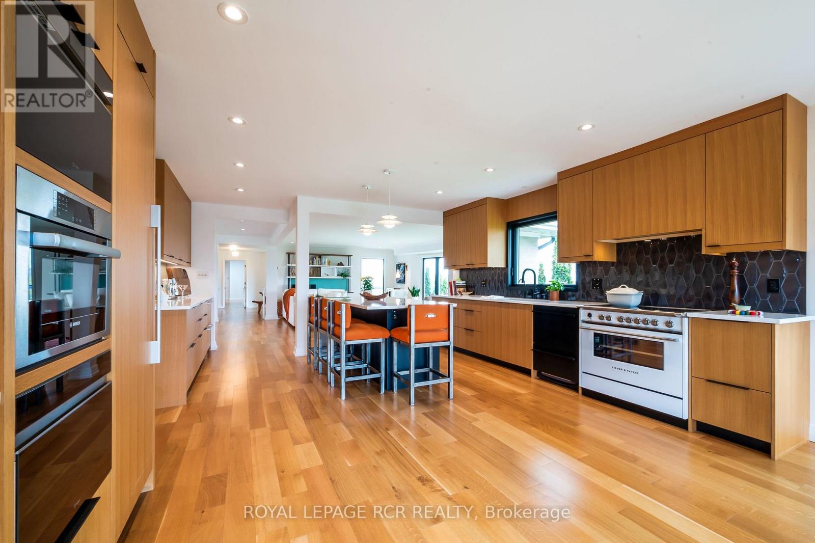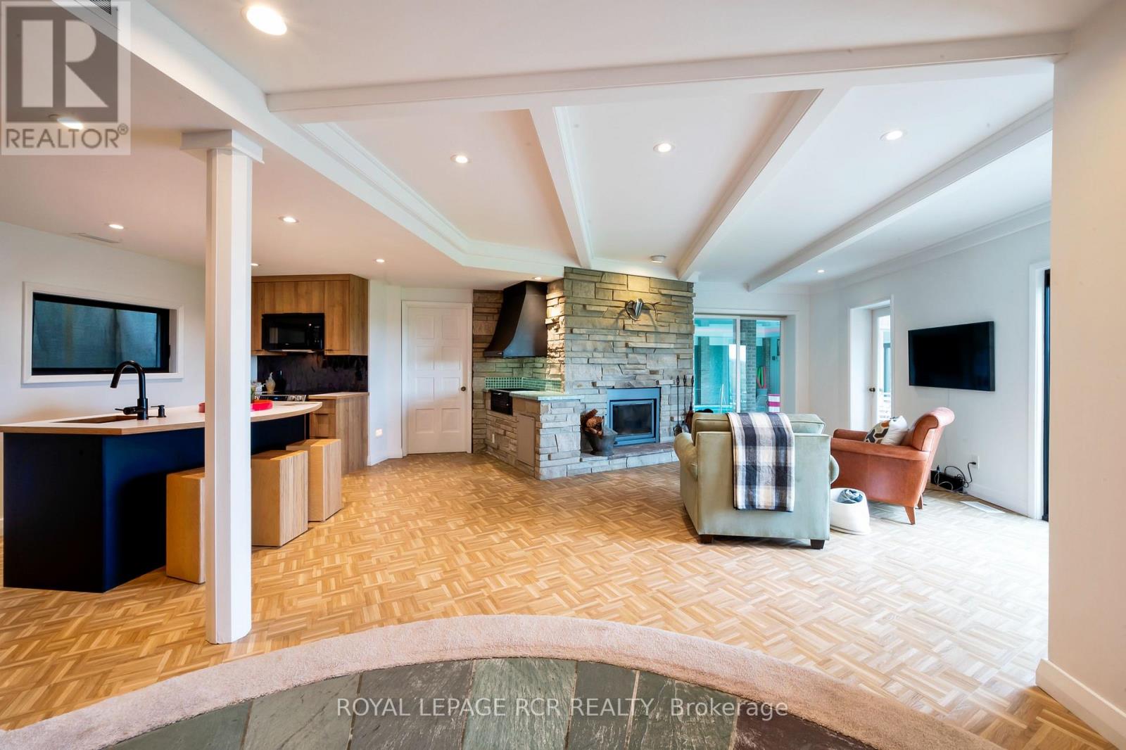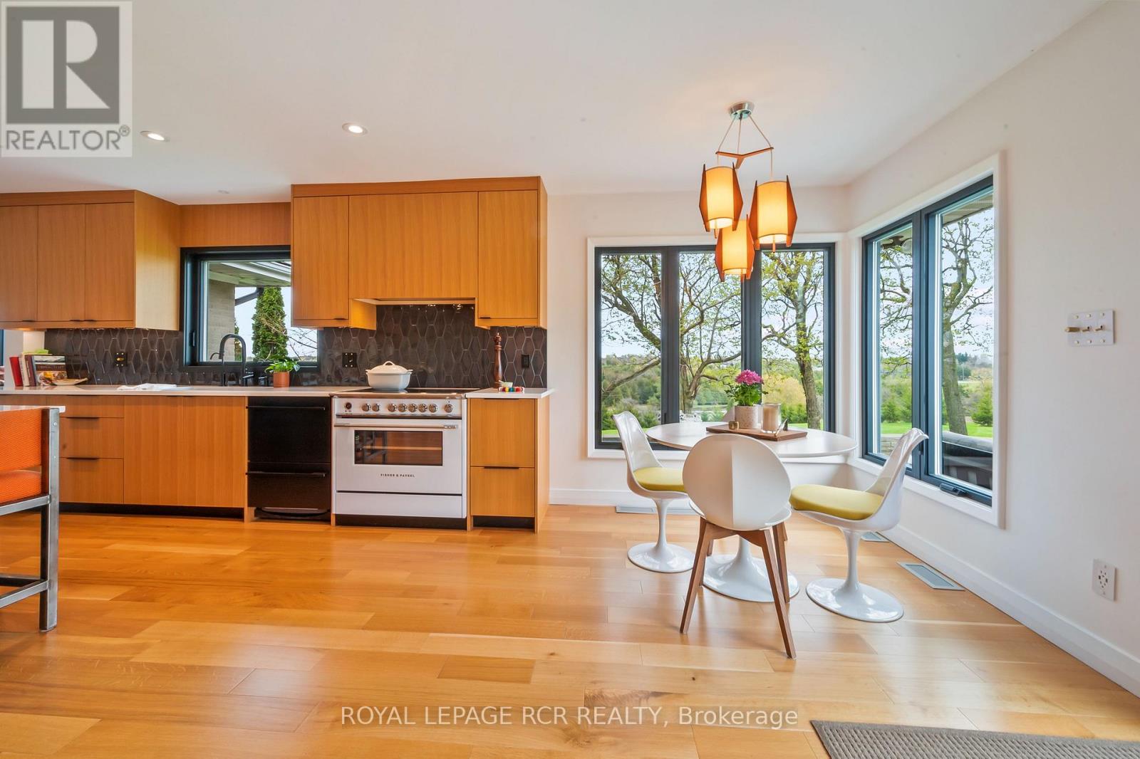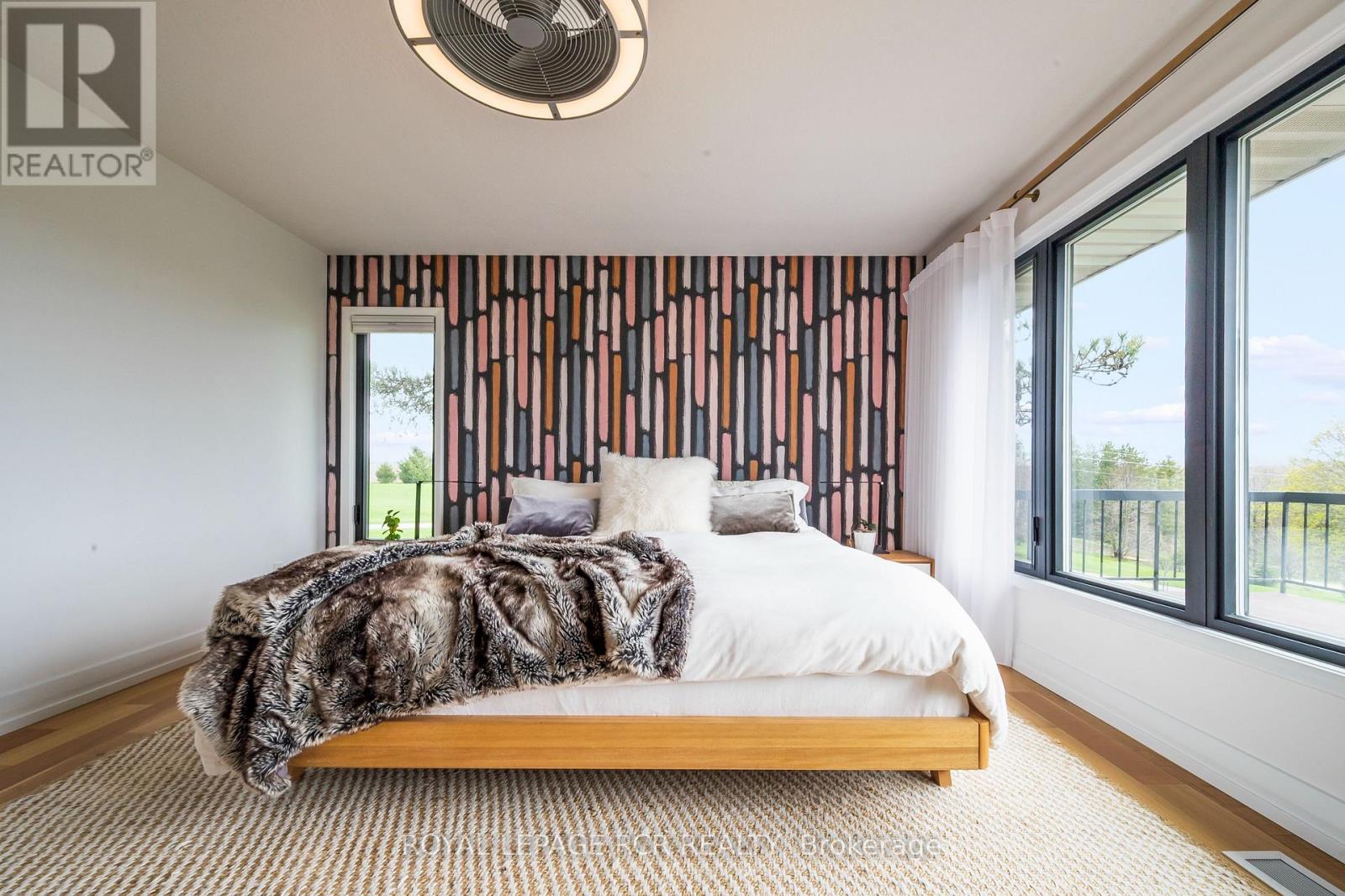 A winding driveway draws you toward The Riverlands, a spectacular top-of-the-line modern estate offering over 7,000 sq ft of total space. Nestled on 3.67 acres with commanding views of the Grand River, this architectural gem underwent an extraordinary full-scale renovation from '20 to '22. Today, it stands as a seamless fusion of timeless design and forward-thinking sustainability, boasting carbon-neutral, net-zero-ready systems. The main level features a stunning chef-inspired kitchen with quartz countertops, custom cabinetry, and an impressive suite of appliances. Sliding doors lead to a stone patio with a fireplace and BBQ, perfectly positioned to enjoy the sights and sounds of one of Ontario's premier fly fishing destinations. The open-concept living and dining area is enhanced by natural light, bespoke walnut built-ins, and sweeping river views. The primary suite is a private retreat, complete with a five-piece ensuite, custom dressing room with integrated laundry, and access to a versatile den or office with a wood-burning fireplace and access to the rooftop terrace. Two more bedrooms offer walk-in closets and share a beautifully updated bath. A curved staircase leads to the lower level featuring a second kitchen with an indoor charcoal grill, a family room with fireplace, a billiards room, a guest suite, a wine room, and a walk-in fridge. Thoughtfully designed to function seamlessly as a multi-generational home, this level offers independent yet connected living spaces ideal for extended family or guests. The showstopping indoor saltwater pool has dedicated HVAC and solar-powered heating, plus a sauna, change room, and adjoining sunroom with walkout to the backyard. Rooftop solar panels, geothermal systems, upgraded electrical, smart home features, and plans for a detached 3-car garage complete this one-of-a-kind package. Just minutes from Belwood Lake and downtown Elora, The Riverlands is a rare blend of modern luxury, natural beauty, and sustainable living. (id:64974)