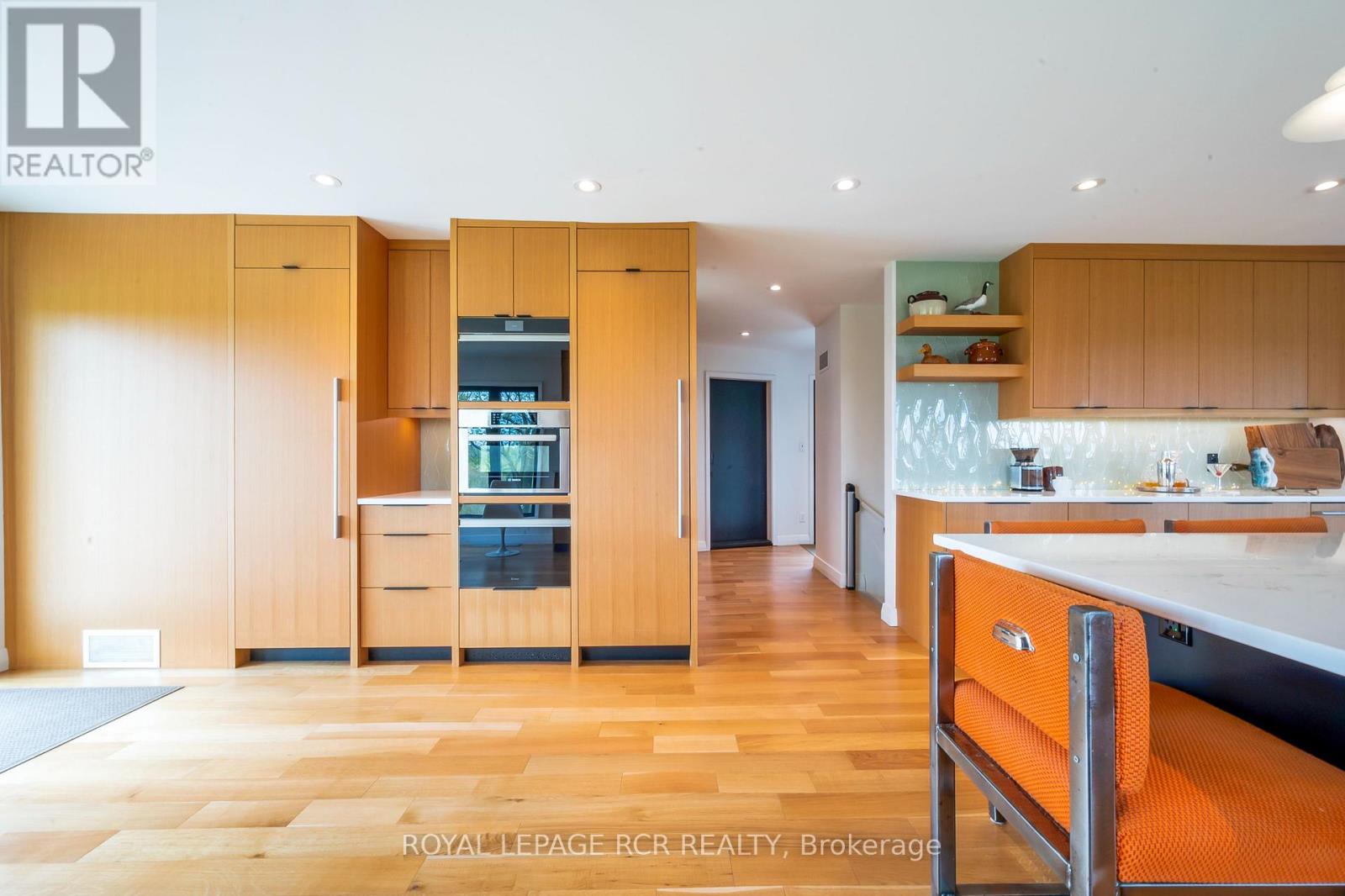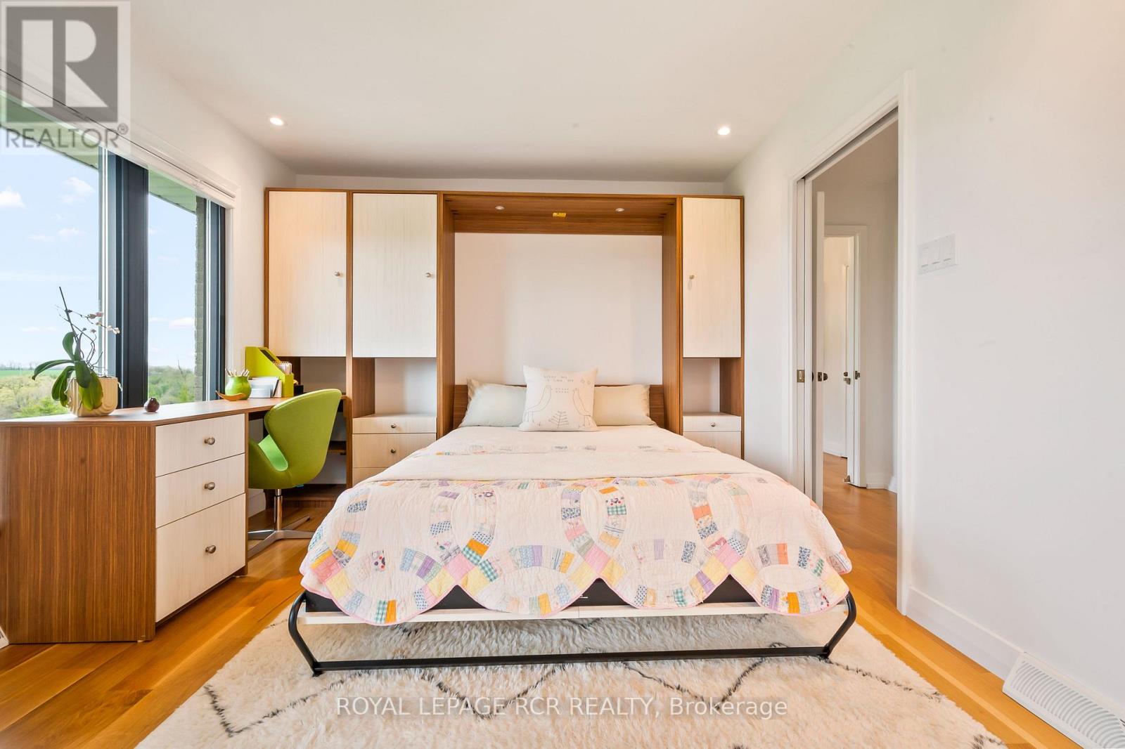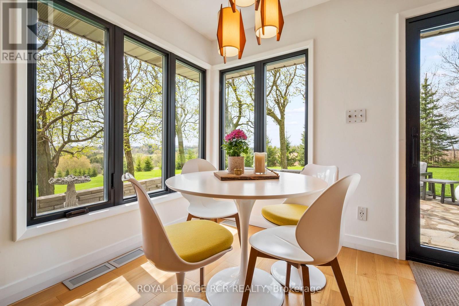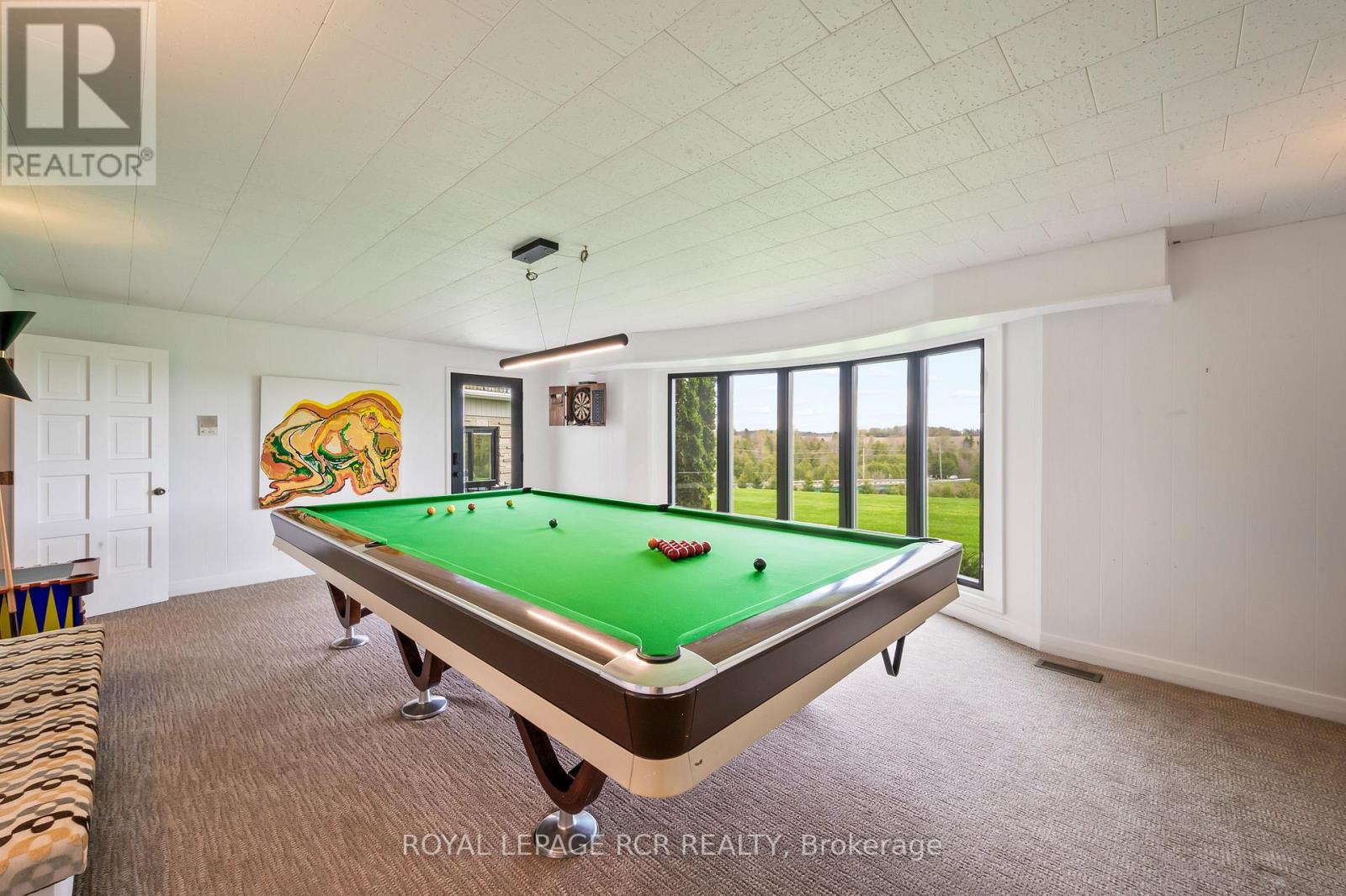A winding driveway draws you toward The Riverlands, a spectacular top-of-the-line modern estate offering over 7,000 sq ft of total space. Nestled on 3.67 acres with commanding views of the Grand River, this architectural gem underwent an extraordinary full-scale renovation from '20 to '22. Today, it stands as a seamless fusion of timeless design and forward-thinking sustainability, boasting carbon-neutral, net-zero-ready systems. The main level features a stunning chef-inspired kitchen with quartz countertops, custom cabinetry, and an impressive suite of appliances. Sliding doors lead to a stone patio with a fireplace and BBQ, perfectly positioned to enjoy the sights and sounds of one of Ontario's premier fly fishing destinations. The open-concept living and dining area is enhanced by natural light, bespoke walnut built-ins, and sweeping river views. The primary suite is a private retreat, complete with a five-piece ensuite, custom dressing room with integrated laundry, and access to a versatile den or office with a wood-burning fireplace and access to the rooftop terrace. Two more bedrooms offer walk-in closets and share a beautifully updated bath. A curved staircase leads to the lower level featuring a second kitchen with an indoor charcoal grill, a family room with fireplace, a billiards room, a guest suite, a wine room, and a walk-in fridge. Thoughtfully designed to function seamlessly as a multi-generational home, this level offers independent yet connected living spaces ideal for extended family or guests. The showstopping indoor saltwater pool has dedicated HVAC and solar-powered heating, plus a sauna, change room, and adjoining sunroom with walkout to the backyard. Rooftop solar panels, geothermal systems, upgraded electrical, smart home features, and plans for a detached 3-car garage complete this one-of-a-kind package. Just minutes from Belwood Lake and downtown Elora, The Riverlands is a rare blend of modern luxury, natural beauty, and sustainable living. (id:64974)