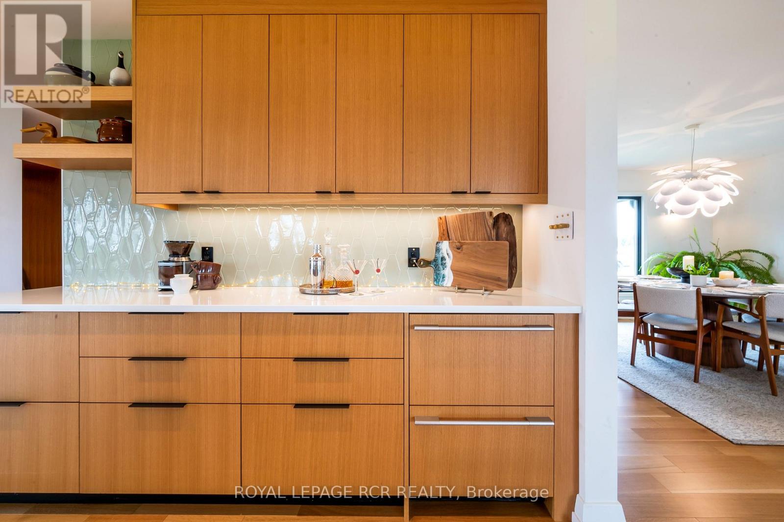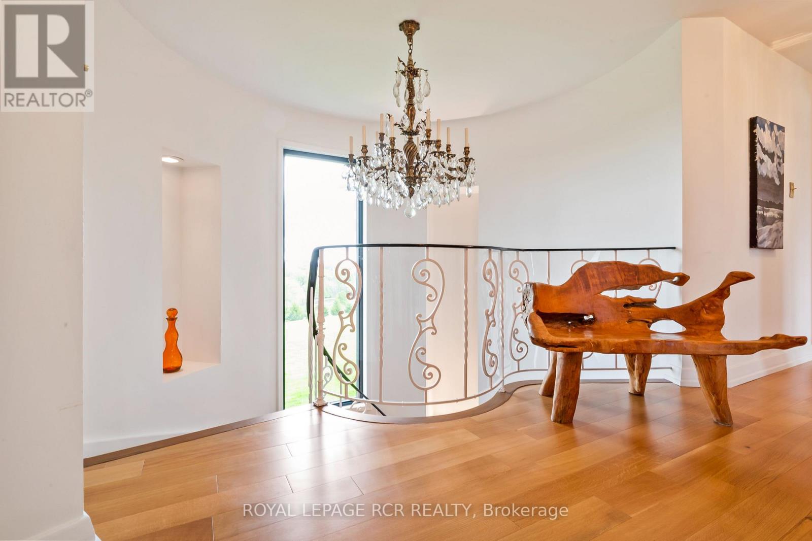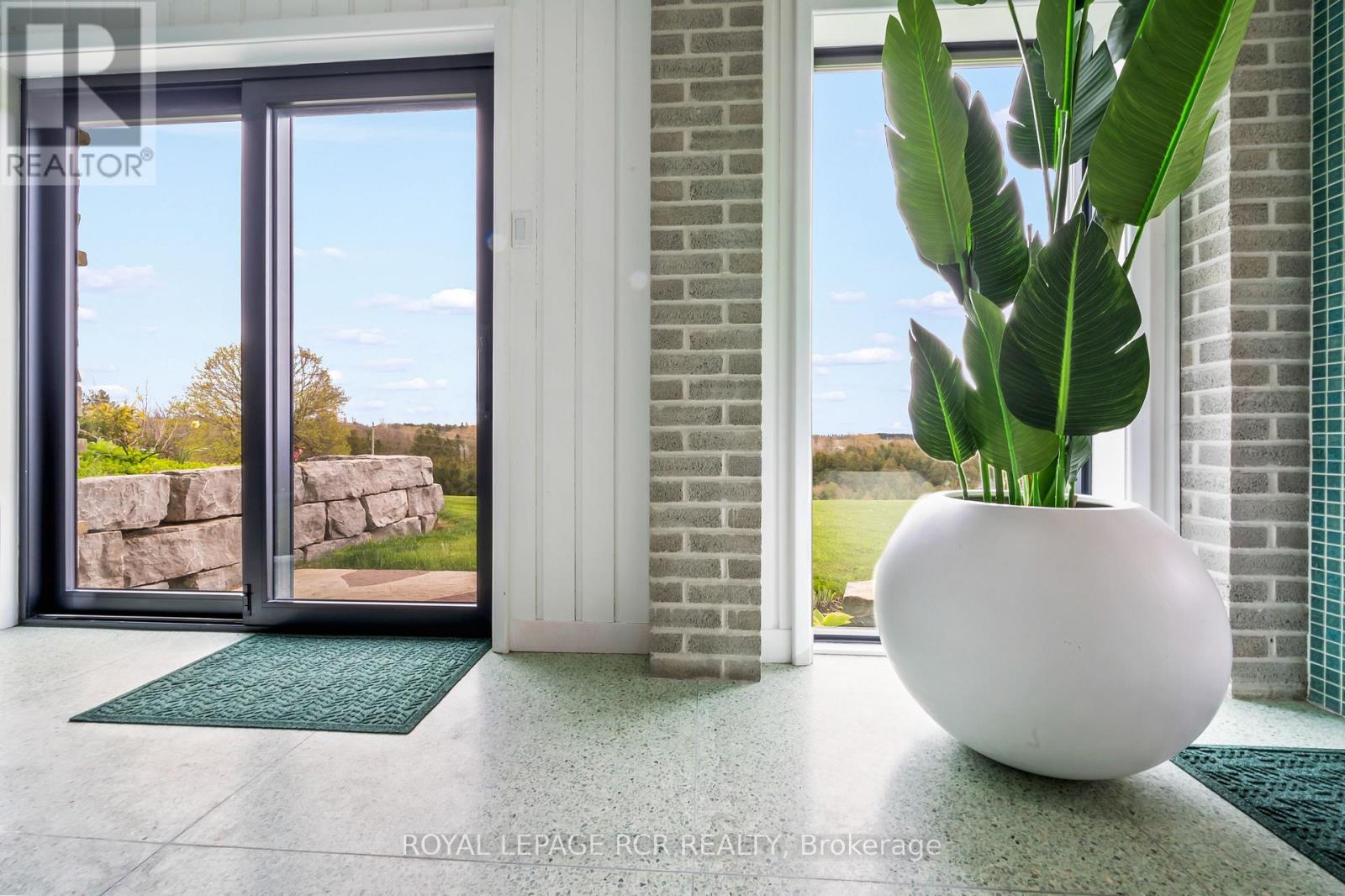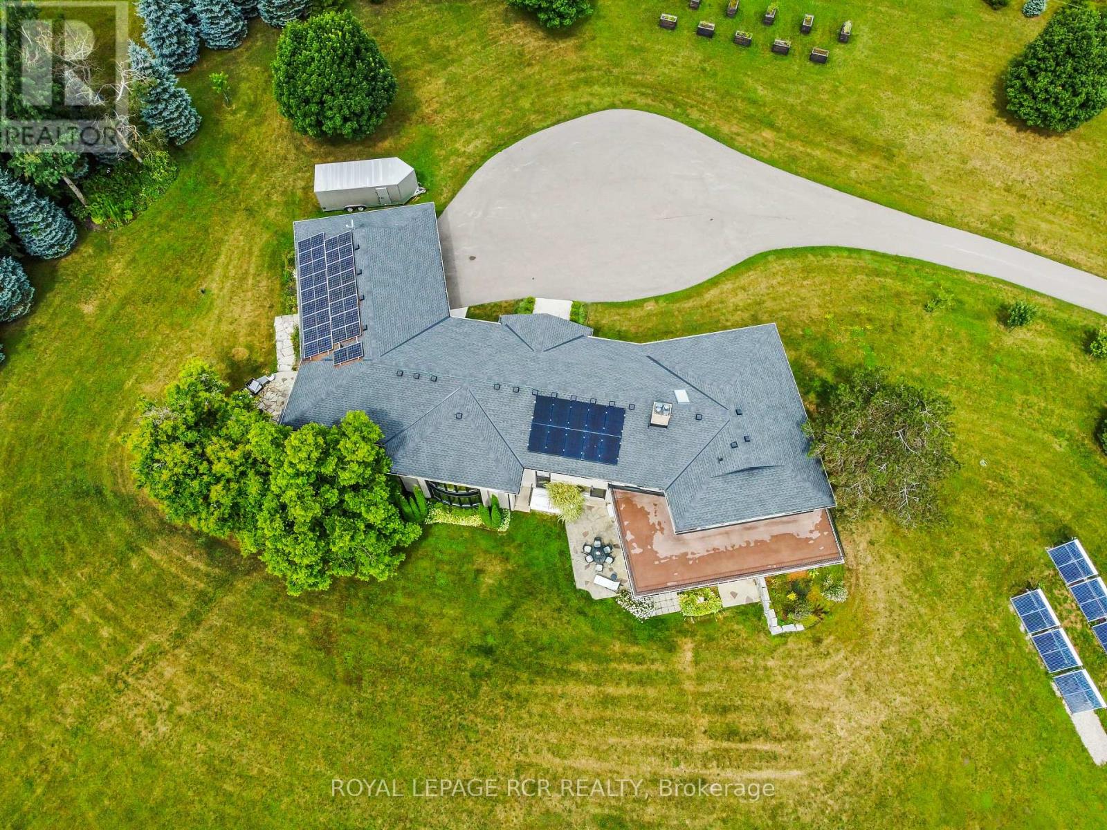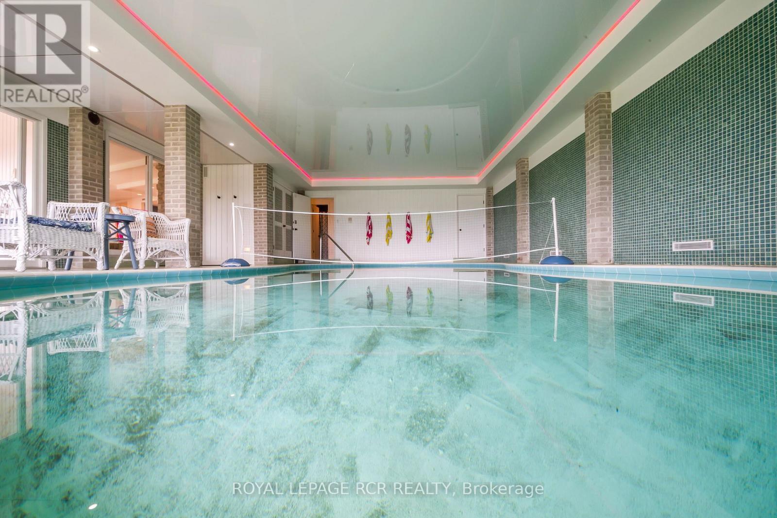 A winding driveway draws you toward The Riverlands, a spectacular top-of-the-line modern estate offering over 7,000 sq ft of total space. Nestled on 3.67 acres with commanding views of the Grand River, this architectural gem underwent an extraordinary full-scale renovation from '20 to '22. Today, it stands as a seamless fusion of timeless design and forward-thinking sustainability, boasting carbon-neutral, net-zero-ready systems. The main level features a stunning chef-inspired kitchen with quartz countertops, custom cabinetry, and an impressive suite of appliances. Sliding doors lead to a stone patio with a fireplace and BBQ, perfectly positioned to enjoy the sights and sounds of one of Ontario's premier fly fishing destinations. The open-concept living and dining area is enhanced by natural light, bespoke walnut built-ins, and sweeping river views. The primary suite is a private retreat, complete with a five-piece ensuite, custom dressing room with integrated laundry, and access to a versatile den or office with a wood-burning fireplace and access to the rooftop terrace. Two more bedrooms offer walk-in closets and share a beautifully updated bath. A curved staircase leads to the lower level featuring a second kitchen with an indoor charcoal grill, a family room with fireplace, a billiards room, a guest suite, a wine room, and a walk-in fridge. Thoughtfully designed to function seamlessly as a multi-generational home, this level offers independent yet connected living spaces ideal for extended family or guests. The showstopping indoor saltwater pool has dedicated HVAC and solar-powered heating, plus a sauna, change room, and adjoining sunroom with walkout to the backyard. Rooftop solar panels, geothermal systems, upgraded electrical, smart home features, and plans for a detached 3-car garage complete this one-of-a-kind package. Just minutes from Belwood Lake and downtown Elora, The Riverlands is a rare blend of modern luxury, natural beauty, and sustainable living. (id:64974)