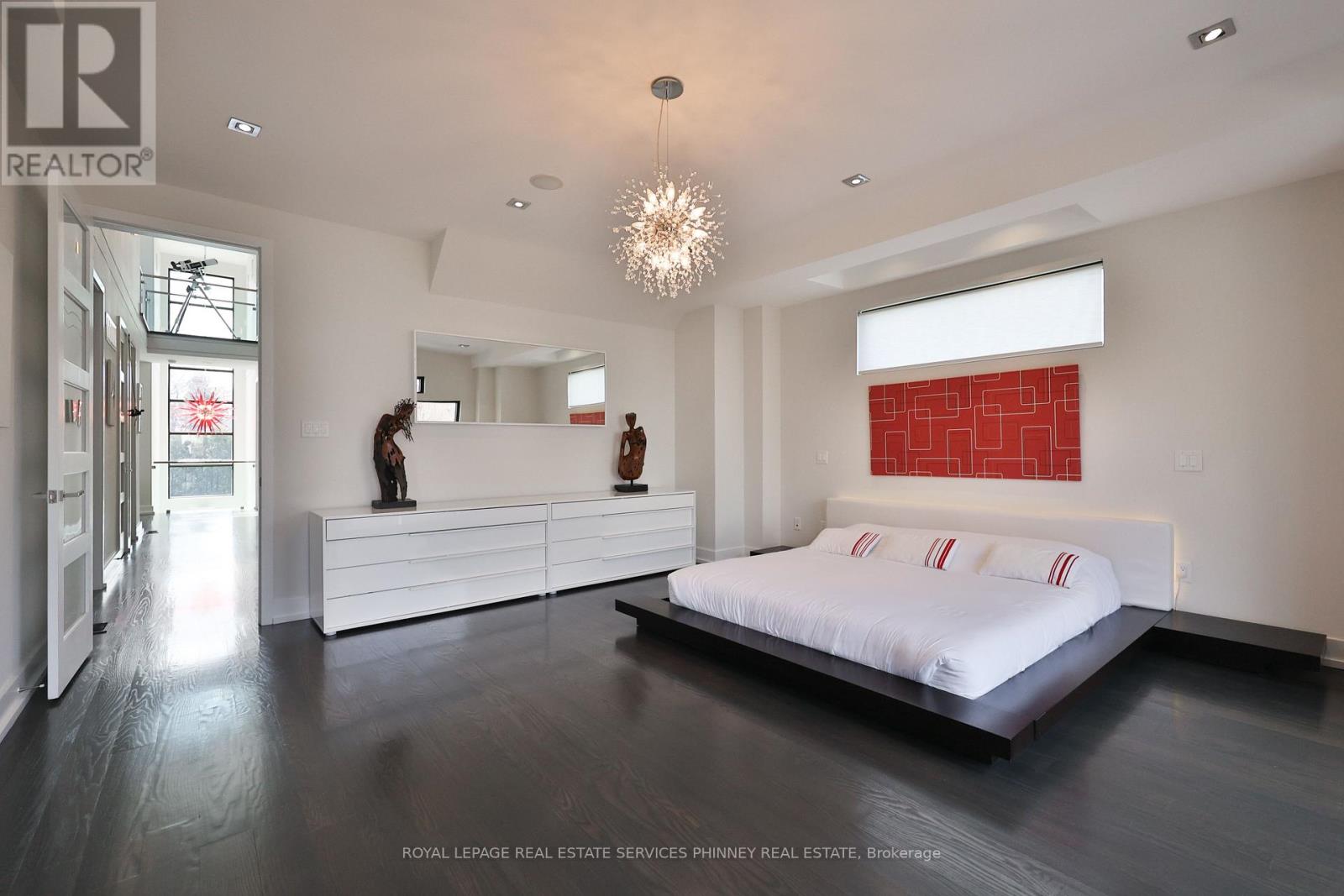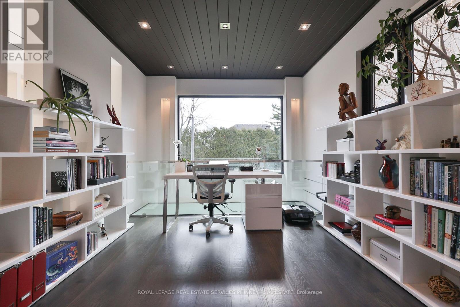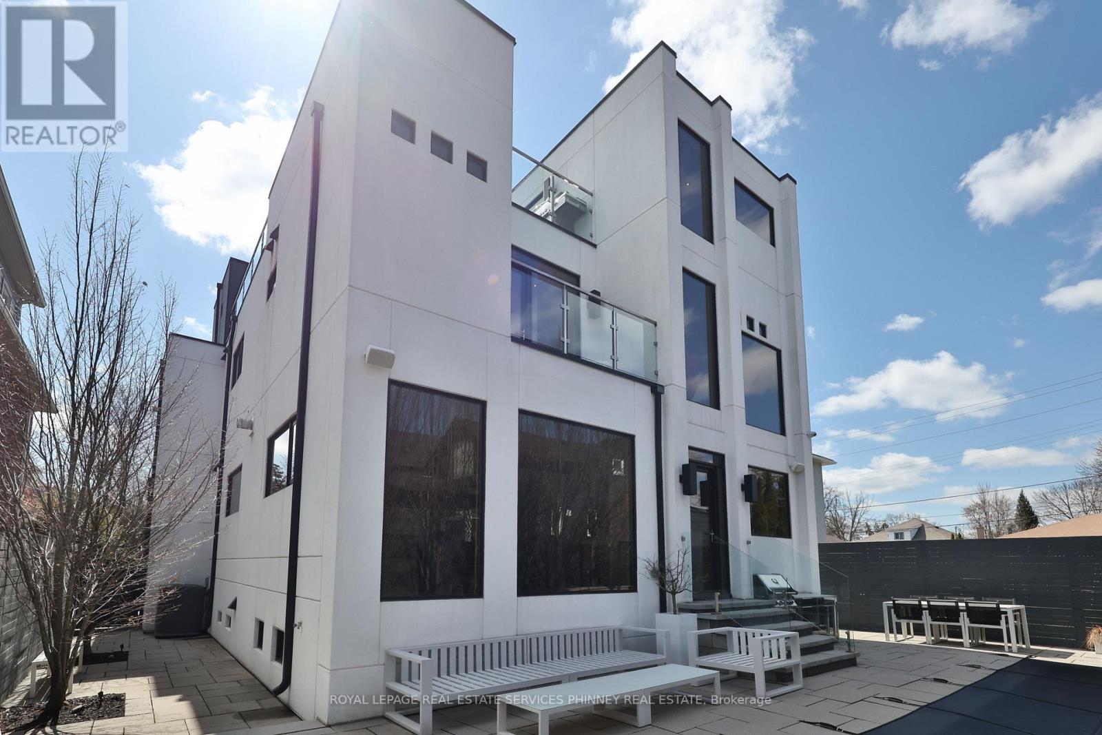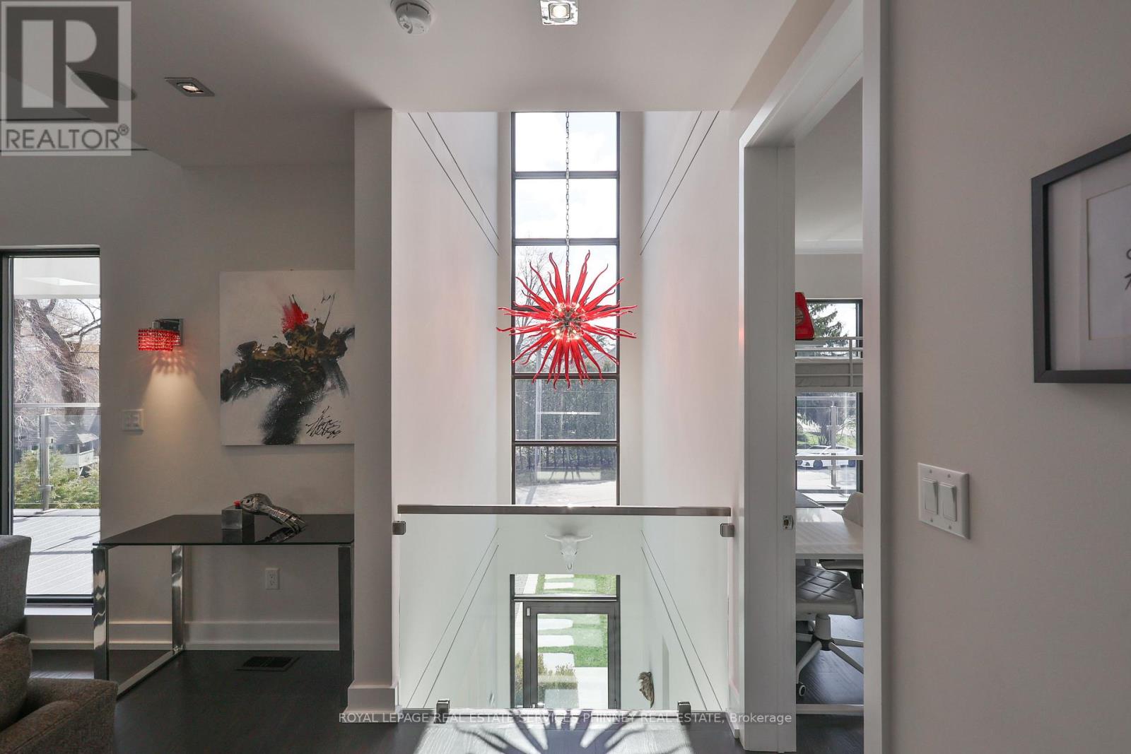 Sun-drenched and architecturally striking, this rare 3-storey contemporary home offers over6,100 sq ft of refined living space, blending modern elegance with exceptional functionality. Featuring 4+2 bedrooms and 6 bathrooms, the residence includes multiple outdoor retreats with 3walkouts to private decks and 2 to expansive rooftop terraces. The main level showcases a sophisticated layout with a private office, sunken living and dining rooms, and a stunning great room with a two-sided gas fireplace. The space flows into a high-end Scavolini kitchen with Miele integrated appliances, custom cabinetry, and a waterfall quartz island. A walkout leads to a resort-style backyard with a saltwater pool and waterfall. A custom mudroom with Scavolini cabinetry provides garage access. The upper levels are finished with wide plank flooring and oversized stone tiles, adding a cohesive and upscale design element throughout. Upstairs, four spacious bedrooms include a luxurious primary suite with a walk-in closet, private balcony, and spa-inspired 5-piece ensuite. The second bedroom has its own ensuite, while the third and fourth share a Jack & Jill bath, with the fourth offering a balcony walkout. A bright family room with a beverage centre and balcony adds flexible living space. A convenient laundry room with ample storage completes the 2 nd level. The bonus space on the third floor is ideal for entertaining, featuring a lounge, 2-piece bath, beverage centre, and access to two rooftop terraces. The finished basement offers a theatre room, gym, two additional bedrooms, and a 3-piece bath. The landscaped backyard is a private oasis with a saltwater pool, paver patio, and mature trees. Additional highlights include Control4 home automation. Located in sought-after Lakeview, close to waterfront trails, parks, schools, Port Credit, highways, and GO transit. (id:64974)